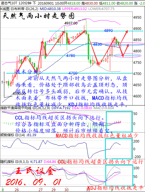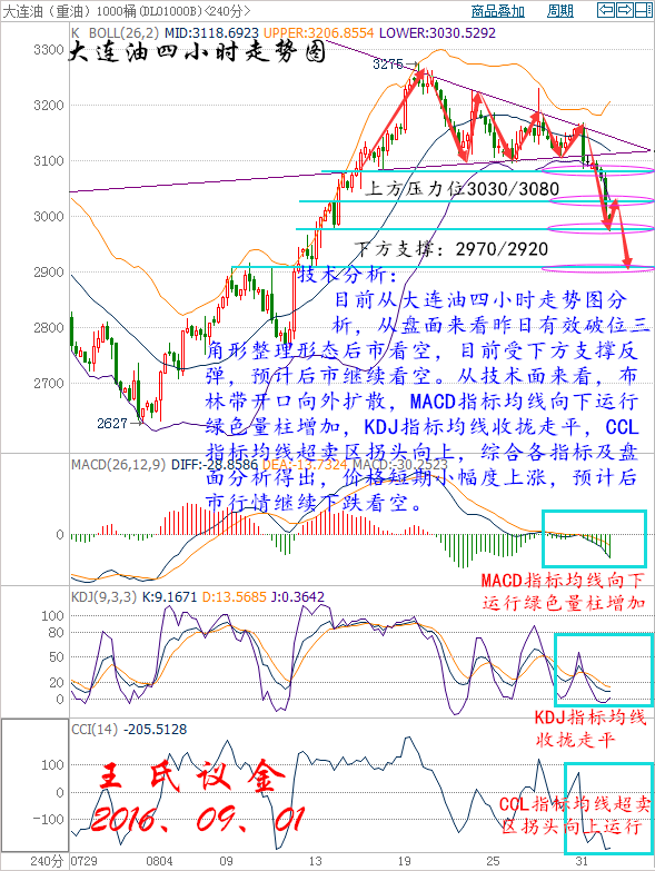 王氏寄語: 沒有一勞永逸的開始,也沒有無法拯救的結束。人生中,你需要把握的是該開始的,要義無反顧地開始,該結束的,就干凈利落地結束,投資也是一樣,方向錯了停止就是進步,很多時候,你明明知道是錯的,卻偏偏還堅持。這不是不夠傷,而是還傷的起。交易無非是這樣,沒有被傷透,就會幻想也許有轉機,僥幸換來的或許是不幸。 昨日收盤: 美國WTI原油10月期貨周三(8月31日)收跌1.65美元,或3.56%,報44.70美元/桶,本月大漲7.48%。布倫特原油10月期貨周三收跌1.33美元,或2.75%,報47.04美元/桶,本月勁升7.72%。原油庫存意外大增以及石油輸出國組織(OPEC)8月產量料將再創近期歷史新高,油價日內承壓重挫,不過受產油國凍產押注的支撐,本月油價依然錄得強勁反彈,目前市場關注焦點集中在周五即將公布的非農數據,美元能否延續漲勢對油價走勢頗為重要。美國WTI原油期貨價格盤中最低觸及44.52美元/桶,布倫特原油期貨價格盤中最低觸及46.78元/桶。 基本面利好因素: 美國公布的“小非農”數據表現靚麗,美元指數受到提振攀升至三周高位,不過,隨后出爐的芝加哥PMI指數遠不及預期,美元指數回吐全部漲幅轉而下滑。美元漲勢暫時受阻限制了油價的下行空間。 美國安全和環保執行署(Bureau of Safety and Environmental Enforcement)周一消息顯示,美國墨西哥沿岸油氣設施原油和天然氣產量分別為16.8334萬桶/日和1.9億立方英尺/日,目前恐將面臨熱帶風暴的襲擊,預計熱帶風暴威脅可能導致美國墨西哥灣原油產量減少35.3萬桶/日,占該地區總產量的22%。 美國油服公司貝克休斯(Baker Hughes)周五(8月26日)公布數據顯示,截至2016年8月26日當周美國石油活躍鉆井數持平于406座,結束了八周連漲。美國當周天然氣活躍鉆井數減少2座至81座。截至8月26日當周美國石油和天然氣活躍鉆井總數減少2座至489座,較去年同期減少388座。 基本面利空因素: 美國能源信息署(EIA)數據顯示,截至8月26日當周美國原油庫存增加227.6萬桶,市場預估為增加92.1萬桶,連續兩周錄得大增。美國上周汽油庫存減少69.1萬桶,不及市場預估115.7萬桶的減幅。同時美國精煉油庫存增加149.6萬桶,市場預估為減少15.7萬桶,連續三周錄得增加,庫存創下2010年來最高水平。不過,美國原油交割地庫欣庫存減少104萬桶,至6387萬桶。庫欣地區原油庫存降幅為7月29日當周以來最大。 外媒調查結果顯示,8月份OPEC原油產量料將環比增加4萬桶/日至3350萬桶/日,將再創近期歷史新高,7月原油產量為3346萬桶/日。此外,沙特8月原油產量極有可能創造歷史新高至1090萬桶/日,至少也將維持在7月水平1067萬桶/日,因該國國內季節性需求增加以及維持市場份額的決心。阿聯酋8月產量首次觸及300萬桶/日,伊拉克和科威特的產量也較7月小幅上漲。盡管此前包括沙特和伊拉克在內的產油國均表示會支持凍產,但兩國8月產量續增令人懷疑OPEC的凍產是否可信。 伊朗副油長莫扎密表示,該國當前原油產量為380萬桶/日,目標是在年底前增產至400萬桶/日;伊朗或在年底前與投資者簽署2-3個原油合同,目前在建的9個煉油廠中,最大的產能為36萬桶/日。伊朗此前稱只有油市份額恢復至制裁前水平才會參與凍產。 尼日利亞尼日爾三角洲復仇者武裝組織發布聲明表示,已停止在尼日爾三角洲地區的敵對行動。該組織之前曾宣稱,對過去數月內尼日爾三角洲地區數個油氣設施的襲擊事件負責。這則消息顯著改善了市場對該國原油產量形勢的擔憂情緒。 中國海關公布的數據顯示,中國7月柴油出口同比暴增181.8%,達到153萬噸,是2015年平均單月出口量的近三倍。汽油出口同比勁升145%,至97萬噸,略低于6月的紀錄高位110萬噸。此外,煤油出口同比跳升46%至109萬噸。這令市場煉油產品利潤承受重壓,恐加重煉油產品的供應過剩問題。 華益金安天然氣技術分析: 技術分析: 目前從天然氣兩小時走勢圖分析,從盤面來看,價格處于頂部收烏云蓋頂形態,頂部反轉信號多頭減弱,后市無需確認。從技術面來看,布林帶開口收攏,MACD指標均線收攏紅色量柱減少,KDJ指標均線收攏走平,CCL指標均線超買區拐頭向下運行,綜合各指標及盤面分析得出,短期價格小幅度回落,預計后市繼續看空。 操作建議: 今日天然氣整體操作趨勢以逢高做空為主,以低多為輔。 日內阻力:4850/4890 日內支撐:4780/4700 激進者空單4820-4810區間內可以考慮擇機入場做空,止損4850上方,目標4780/4750。 穩健者空單4850-4860區間內可以考慮擇機入場做空,止損4890上方,目標4800/4770。 激進者多單4780-4790區間內可以考慮擇機入場做多,止損4750下方,目標4840/4880。 穩健者多單4760-4750區間內可以考慮擇機入場做多,止損4720下方,目標4800/4850。 以上操作建議僅供參考、投資有風險、操作需謹慎。 【以上建議出自中匯天融分析部,以實盤操作建議為準】 大交所大連油技術分析: 技術分析: 目前從大連油四小時走勢圖分析,從盤面來看,昨日有效破位三角形整理形態后市看空,目前受下方支撐反彈,預計后市繼續看空。從技術面來看,布林帶開口向外擴散,MACD指標均線向下運行綠色量柱增加,KDJ指標均線收攏走平,CCL指標均線超賣區拐頭向上,綜合各指標及盤面分析得出,價格短期小幅度上漲,預計后市行情繼續下跌看空。 今日大連油整體操作趨勢以逢高做空為主,以低多為輔。 日內阻力:3030/3080 日內支撐:2970/2920 激進者空單3030-3020區間內可以考慮擇機入場做空,止損3060上方