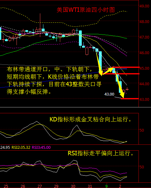 基本面分析: 周四(9月1日)美國WTI原油10月期貨收跌1.54美元,或3.45%,報43.16美元/桶。布倫特原油11月期貨周四收跌1.44美元,或3.07%,報45.45美元/桶。美國WTI原油期貨價格盤中最低觸及43.00美元/桶,布倫特原油期貨價格盤中最低觸及45.33元/桶。 周三晚公布的EIA原油庫存大增帶來的利空持續發酵,且在非農報告前投資者看空油價的情緒得到進一步提升。不過隔夜公布的美國制造業數據大幅不及預期,美元有所回落給油價帶來了部分支撐。 隔夜,美國供應協會(ISM)公布的數據顯示,美國8月制造業指數遠低于預估,且為2月以來首次低于50,反應了在美元走強、全球經濟增長緩慢以及國內面臨不確定性環境下,美國制造業前景不太明朗。與此同時公布的另一項數據顯示,因民間支出增長被政府支出大幅減少所抵銷,美國7月營建支出意外持平。此外,美國8月制造業采購經理人指數(PMI)終值也低于初值和上月終值。美元指數短線急跌,為油價提供了一定支撐。 能源情報監測機構Genscape最新數據顯示,截至8月30日一周,美國原油主要交割地庫欣地區庫存減少71.4282萬桶,這為油市情緒起到了穩定作用。 技術面分析: 美國WTI原油從四小時走勢圖來看,布林帶通道開口,中、下軌朝下,短期均線朝下,K線價格沿著布林帶下軌持續下探,目前在43整數關口尋得支撐小幅反彈。 附圖KD指標形成金叉粘合向上運行;RSI指標走平偏向上運行。 綜合來看,早盤走勢預計是震蕩,并且小幅走高,但日內走勢依舊是看空趨勢,不排除43美元關口觸底反彈可能。操作上,亞盤時段建議在反彈至高位后做空。 9.2美原油操作策略:高位做空。 44.6美元附近做空,目標看向43美元上方,止損在45美元上方; 短線可在43美元附近布局多單,小盈利、小止損出局。 現貨白銀從四小時走勢圖來看,K線價格依然呈震蕩格局,連續兩日于18.6美元這一關口上方震蕩,日內可關注這一支撐,隨著黃金價格反彈的帶動,白銀同樣錄得反彈,短期均線拐頭向上。附圖MACD指標快慢線持續向上運行,快線已上穿零軸,紅色動能柱持續放量。