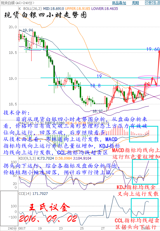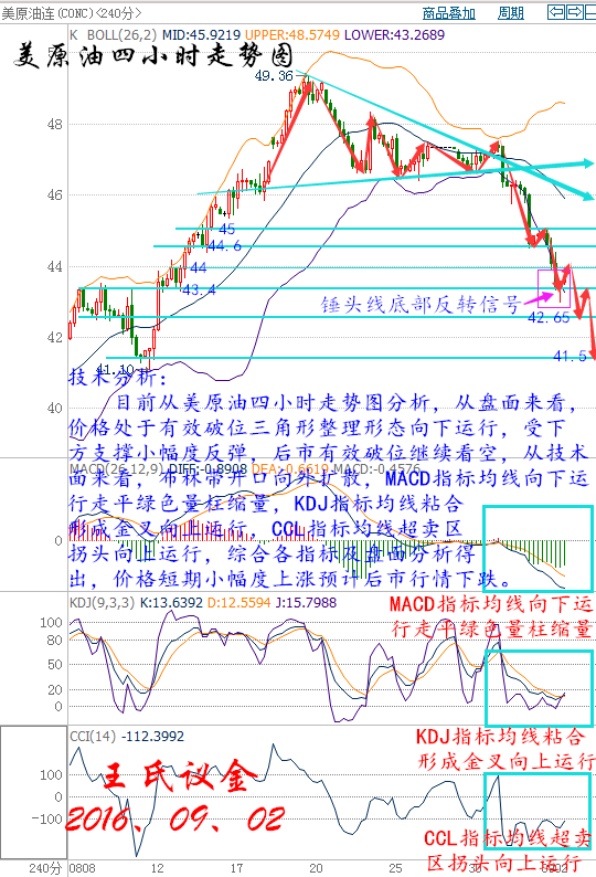 王氏寄語: 機會靠自己爭取,行情需自己把握,投資是自己的五線譜,要學(xué)會親自演奏好它!盈利的時候不浮躁,虧損的時候不胡鬧,一個人的格局影響結(jié)局,每一單都博的像生離死別,每一次都做的像決定所有,本身就偏離了投資的初衷。我?guī)夏悖悴粌H要帶上資金,還要帶上微笑,才能有資格走到君臨天下! 昨日收盤: 美國WTI原油10月期貨周四(9月1日)收跌1.54美元,或3.45%,報43.16美元/桶。布倫特原油10月期貨周四收跌1.44美元,或3.07%,報45.45美元/桶。原油庫存意外大增帶來的利空影響仍在發(fā)酵,同時非農(nóng)報告前投資者看空油價的情緒得到進一步提升,不過美元漲勢暫時受阻以及石油輸出國組織(OPEC)的凍產(chǎn)會談依然為油價提供了一定支撐。美國WTI原油期貨價格盤中最低觸及43.01美元/桶,布倫特原油期貨價格盤中最低觸及45.33元/桶。 基本面利空因素: 美國能源信息署(EIA)數(shù)據(jù)顯示,截至8月26日當周美國原油庫存增加227.6萬桶,市場預(yù)估為增加92.1萬桶,連續(xù)兩周錄得大增。美國上周汽油庫存減少69.1萬桶,不及市場預(yù)估115.7萬桶的減幅。同時美國精煉油庫存增加149.6萬桶,市場預(yù)估為減少15.7萬桶,連續(xù)三周錄得增加,庫存創(chuàng)下2010年來最高水平。不過,美國原油交割地庫欣庫存減少104萬桶,至6387萬桶。庫欣地區(qū)原油庫存降幅為7月29日當周以來最大。 外媒調(diào)查結(jié)果顯示,8月份OPEC原油產(chǎn)量料將環(huán)比增加4萬桶/日至3350萬桶/日,將再創(chuàng)近期歷史新高,7月原油產(chǎn)量為3346萬桶/日。此外,沙特8月原油產(chǎn)量極有可能創(chuàng)造歷史新高至1090萬桶/日,至少也將維持在7月水平1067萬桶/日,因該國國內(nèi)季節(jié)性需求增加以及維持市場份額的決心。阿聯(lián)酋8月產(chǎn)量首次觸及300萬桶/日,伊拉克和科威特的產(chǎn)量也較7月小幅上漲。盡管此前包括沙特和伊拉克在內(nèi)的產(chǎn)油國均表示會支持凍產(chǎn),但兩國8月產(chǎn)量續(xù)增令人懷疑OPEC的凍產(chǎn)是否可信。 伊朗副油長莫扎密表示,該國當前原油產(chǎn)量為380萬桶/日,目標是在年底前增產(chǎn)至400萬桶/日;伊朗或在年底前與投資者簽署2-3個原油合同,目前在建的9個煉油廠中,最大的產(chǎn)能為36萬桶/日。伊朗此前稱只有油市份額恢復(fù)至制裁前水平才會參與凍產(chǎn)。 尼日利亞尼日爾三角洲復(fù)仇者武裝組織發(fā)布聲明表示,已停止在尼日爾三角洲地區(qū)的敵對行動。該組織之前曾宣稱,對過去數(shù)月內(nèi)尼日爾三角洲地區(qū)數(shù)個油氣設(shè)施的襲擊事件負責。這則消息顯著改善了市場對該國原油產(chǎn)量形勢的擔憂情緒。 中國海關(guān)公布的數(shù)據(jù)顯示,中國7月柴油出口同比暴增181.8%,達到153萬噸,是2015年平均單月出口量的近三倍。汽油出口同比勁升145%,至97萬噸,略低于6月的紀錄高位110萬噸。此外,煤油出口同比跳升46%至109萬噸。這令市場煉油產(chǎn)品利潤承受重壓,恐加重煉油產(chǎn)品的供應(yīng)過剩問題。 現(xiàn)貨原油技術(shù)分析: 技術(shù)分析: 目前從美原油四小時走勢圖分析,從盤面來看,價格處于有效破位三角形整理形態(tài)向下運行,受下方支撐小幅度反彈,后市有效破位繼續(xù)看空,從技術(shù)面來看,布林帶開口向外擴散,MACD指標均線向下運行走平綠色量柱縮量,KDJ指標均線粘合形成金叉向上運行,CCL指標均線超賣區(qū)拐頭向上運行,綜合各指標及盤面分析得出,價格短期小幅度上漲,預(yù)計后市行情下跌。 操作建議: 今日美原油整體操作趨勢以逢高做空為主,以低多為輔。 日內(nèi)阻力:44.2/44.8 日內(nèi)支撐:42.62/42 激進者空單43.8-43.95區(qū)間內(nèi)可以考慮擇機入場做空,止損44.2上方,目標43.1/42.6。 穩(wěn)健者空單44.3-44.45區(qū)間內(nèi)可以考慮擇機入場做空,止損44.75上方,目標43.8/43.1。 激進者多單43.4-43.5區(qū)間內(nèi)可以考慮擇機入場做多,止損43.1下方,目標44/44.5。 穩(wěn)健者多單42.65-42.55區(qū)間內(nèi)可以考慮擇機入場做多,止損42.25下方,目標43.35/43.8。 以上操作建議僅供參考、投資有風(fēng)險、操作需謹慎。 【以上建議出自中匯天融分析部,以實盤操作建議為準】 美原油兌大連油點位:約66.87 現(xiàn)貨白銀操作建議: 技術(shù)分析: 目前從現(xiàn)貨白銀四小時走勢圖分析,從盤面分析來看,價格昨日有效突破三角形整理形態(tài)上方壓力有效破位向上運行,回落不破,后市繼續(xù)看多,從技術(shù)面來看,布林道向上運行發(fā)散,MACD指標均線向上運行并紅色量柱增加,KDJ指標均線向上運行發(fā)散,CCL指標均線超賣區(qū)拐頭向下運行,綜合各指標及盤面分析得出,價格短期小幅度回落,預(yù)計后市行情上漲。 操作建議: 今日現(xiàn)貨白銀整體操作趨勢以逢低做多為主,以高空為輔。 日內(nèi)阻力:19.03/19.25 日內(nèi)支撐:18.60/18.44 激進者空單19-19.05區(qū)間內(nèi)可以考慮擇機入場做空,止損19.15上方,目標18.85/18.7。 穩(wěn)健者空單19.2-19.25區(qū)間內(nèi)可以考慮擇機入場做空,止損19.4上方,目標19.05/18.85。 激進者多單18.90-18.95區(qū)間內(nèi)可以考慮擇機入場做多,止損18.75下方,目標19.05/19.15。 穩(wěn)健者多單18.7-18.75區(qū)間內(nèi)可以考慮擇機入場做多,止損18.6下方,目標18.9/19.15。 以上操作建議僅供參考、投資有風(fēng)險、操作需謹慎。 【以上