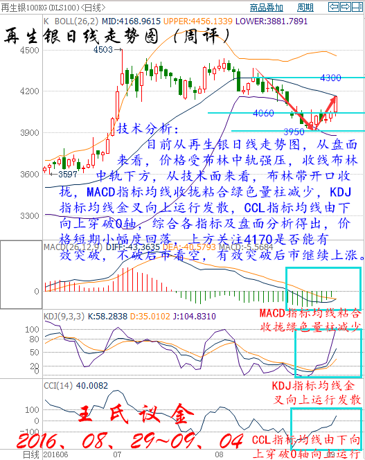 本周行情回顧: 周一(8月29日)亞歐時段油價跌逾1%,美原油10月期貨一度創(chuàng)兩日低點至46.78美元/桶,布倫特原油11月期貨最低觸及49.38美元/桶,因伊拉克產(chǎn)量增加,同時伊朗表示只有在其他石油出口國承認(rèn)其有權(quán)充分恢復(fù)市場份額的前提下,才會配合即將進(jìn)行的凍產(chǎn)談判。油價自觸及8月高峰以來已下挫逾3.5%。油價下跌是中東產(chǎn)量增長所致。8月從伊拉克南部港口的石油出口量日均達(dá)320.5萬桶,超過7月的平均水平;7月的石油出口量日均為320.2萬桶。 周二(8月30日)亞歐時段國際油價窄幅震蕩,美原油10月期貨目前交投于47.08美元/桶附近,布倫特原油10月期貨目前交投于49.44美元/桶附近,中國三大油企的產(chǎn)量下降給油價提供了一定的支撐,但產(chǎn)油國凍產(chǎn)的不確定性仍對油價有所拖累,市場在等待更多數(shù)據(jù)或者消息的刺激。過去一周中石油和中石化都報告今年上半年石油產(chǎn)量下降,中石化表示國內(nèi)原油產(chǎn)量下滑13%、中石油報告國內(nèi)產(chǎn)量下降4%;而中海油也表示下半年將減產(chǎn);分析認(rèn)為盡管創(chuàng)上市以來最差業(yè)績,但減產(chǎn)將令“三桶油”捱過困境以迎接油價的最終復(fù)蘇。 周三(8月31日)亞歐時段油價在兩周低位附近窄幅震蕩,美原油10月期貨目前交投于46.18美元/桶,布倫特原油11月期貨目前交投于48.48美元/桶,因美元持于三周高位附近,且API庫存數(shù)據(jù)顯示美國原油庫存增加,油價依然缺乏上行動力。美元指數(shù)周三一度升至96.17,為8月9日以來的最高水平。美元走強(qiáng),導(dǎo)致石油等以美元計價的大宗商品對于其它幣種的持有者而言變得更加昂貴,而且可能限制需求。 周四(9月1日)亞歐時段國際油價小幅反彈,美原油10月期貨最高觸及45.08美元/桶,布倫特原油11月期貨震蕩于47.21美元/桶附近,日內(nèi)出爐的中國官方制造業(yè)PMI表現(xiàn)較為樂觀,給油價提供了些許支撐,但隔夜美國EIA庫存數(shù)據(jù)漲幅驚人,且OPEC產(chǎn)量仍有可能繼續(xù)刷新紀(jì)錄新高,料將限制油價的反彈空間。中國周四公布的官方數(shù)據(jù)顯示,8月制造業(yè)PMI錄得50.4,好于市場預(yù)期和前值,預(yù)期和前值為49.9。油價小幅反彈還有部分空頭回補(bǔ)的因素存在,隔夜油價大跌逾3%,因美國EIA原油庫存漲幅驚人。 周五(9月2日)亞歐時段國際油價震蕩三周低位附近,美原油10月期貨交投于43.32美元/桶,布倫特原油11月期貨目前交投于45.55美元/桶,本周以來油價已跌逾8%,不過俄羅斯方面終于表態(tài)將推動凍產(chǎn),給油市帶來一絲曙光;但短線來看,油價還將面臨晚間美國非農(nóng)數(shù)據(jù)的考驗。過去兩周時間,油市缺乏利好消息的支撐,受庫存增加和疲弱的美國制造業(yè)數(shù)據(jù)及多重利空影響,本周油價可能創(chuàng)下1月中旬以來的最大周線跌幅,目前來看似乎仍存在一度的下跌動能。 大交所大連油技術(shù)分析: 技術(shù)分析: 目前從大連油四小時走勢圖分析,從盤面來看,價格在底部形成倒錘頭形態(tài)見底信號反彈向上運行,上方關(guān)注3000壓力位,從技術(shù)面來看布林帶開口向下運行,MACD指標(biāo)均線收攏向上運行綠色量柱減少,KDJ指標(biāo)均線金叉向上運行,CCL指標(biāo)均線由下向上到達(dá)0軸附近,綜合各指標(biāo)及盤面分析得出,價格下方關(guān)注2910,上方3000有效突破,后市激進(jìn)看多。 技術(shù)分析: 目前從大連油日線走勢圖分析,從盤面來看,價格收線在布林中軌下方,從技術(shù)面來看,布林帶開口收攏,MACD指標(biāo)均線死叉向下運行綠色量柱增加,KDJ指標(biāo)均線走平收攏,CCL指標(biāo)均線拐頭向上運行,綜合各指標(biāo)及盤面分析得出,價格短期小幅度上漲,預(yù)計后市行情下跌。 操作建議: 周一大連油(美原油)整體操作趨勢以逢高做空為主,以低多為輔。(美原油兌大連油點位:約66.87) 日內(nèi)阻力:3000/3045(44.86/45.55) 日內(nèi)支撐:2910/2870(43.52/42.92) 激進(jìn)者空單2960-2970區(qū)間內(nèi)可以考慮擇機(jī)入場做空,止損3000上方,目標(biāo)2930/2900。 激進(jìn)者空單44.26-44.41區(qū)間內(nèi)可以考慮擇機(jī)入場做空,止損44.86上方,目標(biāo)43.82/43.37。 穩(wěn)健者空單3000-3010區(qū)間內(nèi)可以考慮擇機(jī)入場做空,止損3040上方,目標(biāo)2970/2940。 穩(wěn)健者空單44.86-45區(qū)間內(nèi)可以考慮擇機(jī)入場做空,止損45.46上方,目標(biāo)44.41/43.97。 激進(jìn)者多單2930-2940區(qū)間內(nèi)可以考慮擇機(jī)入場做多,止損2900下方,目標(biāo)2970/3000。 激進(jìn)者多單43.82-43.97區(qū)間內(nèi)可以考慮擇機(jī)入場做多,止損43.37下方,目標(biāo)44.42/44.86。 穩(wěn)健者多單2900-2980區(qū)間內(nèi)可以考慮擇機(jī)入場做多,止損2850下方,目標(biāo)2940/2970。 穩(wěn)健者多單43.37-44.57區(qū)間內(nèi)可以考慮擇機(jī)入場做多,止損43.62下方,目標(biāo)43.97/44.42。 以上操作建議僅供參考、投資有風(fēng)險、操作需謹(jǐn)慎。 【以上建議出自中匯天融分析部,以實盤操作建議為準(zhǔn)】 大交所再生銀技術(shù)分析: 技術(shù)分析: 目前從再生銀四小時走勢圖分析來看,價格突破三角形整理形態(tài),向上運行。從技術(shù)面來看,價格處于布林帶開口向上運行,開口成喇叭形態(tài),MACD指標(biāo)均線向下運行紅色量柱增加,KDJ指標(biāo)均線向