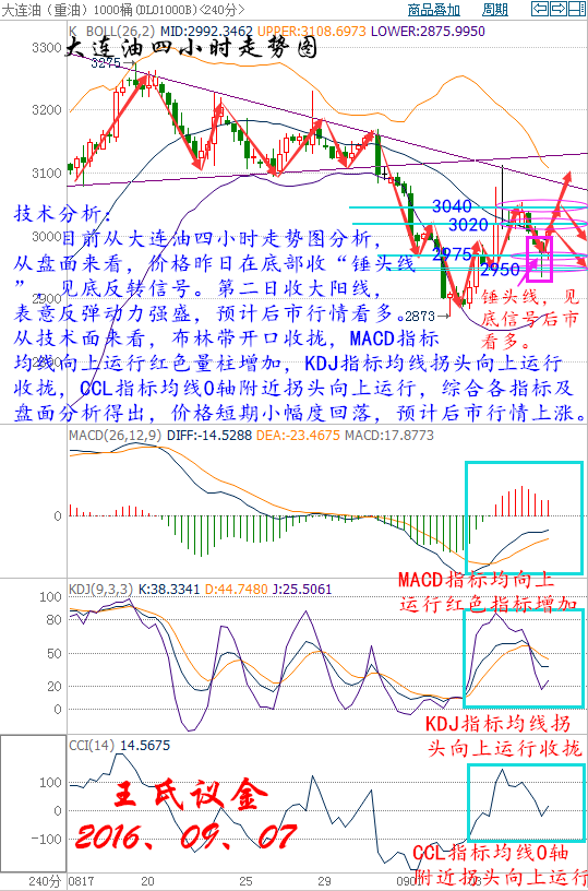 目前從大連油四小時走勢圖分析,從盤面來看,價格昨日在底部收“錘頭線”,見底反轉信號。第二日收大陽線,表意反彈動力強盛,預計后市行情看多。從技術面來看,布林帶開口收攏,MACD指標均線向上運行紅色量柱增加,KDJ指標均線拐頭向上運行收攏,CCL指標均線0軸附近拐頭向上運行,綜合各指標及盤面分析得出,價格短期小幅度回落,預計后市行情上漲。