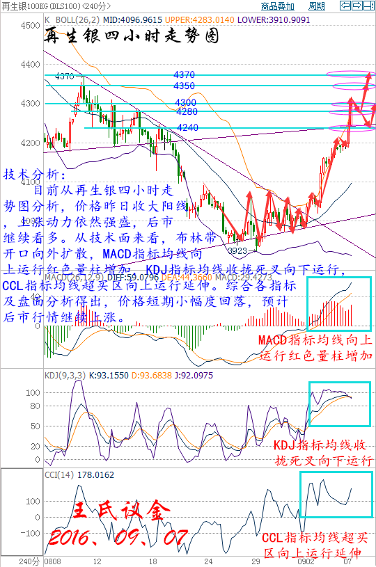 目前從再生銀四小時走勢圖分析,價格昨日收大陽線,上漲動力依然強盛,后市繼續看多。從技術面來看,布林帶開口向外擴散,MACD指標均線向上運行紅色量柱增加,KDJ指標均線收攏死叉向下運行,CCL指標均線超買區向上運行延伸。綜合各指標及盤面分析得出,價格短期小幅度回落,預計后市行情繼續上漲。