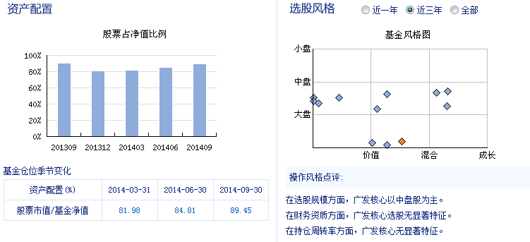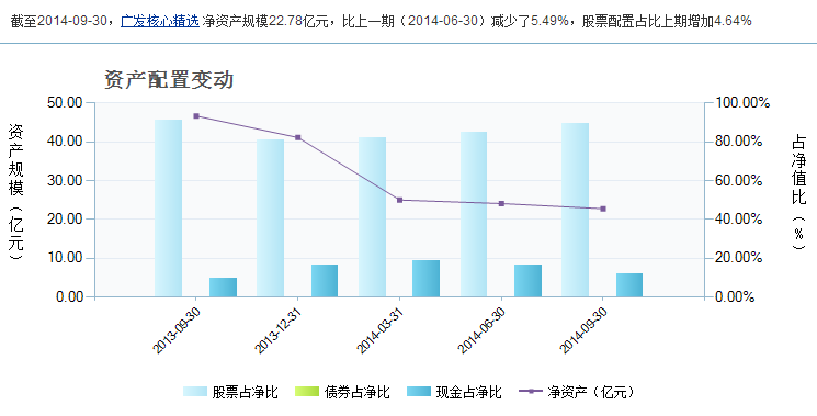 基金全稱:廣發核心精選股票型證券投資基金 基金簡稱:廣發核心精選 基金代碼:270008(前端) 基金類型:股票型 發行日期:2008年06月12日 成立日期/規模:2008年07月16日 / 12.427億份 資產規模:22.78億元(截止至:2014年09月30日) 份額規模:12.1091億份(截止至:2014年09月30日) 基金管理人:廣發基金 基金托管人:工商銀行 基金經理人:朱紀剛、李巍 成立來分紅:每份累計0.21元(3次) 管理費率:1.50%(每年) 托管費率:0.25%(每年) 銷售服務費率:0.60%(每年) 最高認購費率:---(前端) 最高申購費率:1.50%(前端) 最高贖回費率:0.50%(前端) 業績比較基準:80%*滬深300指數+20%*上證國債指數