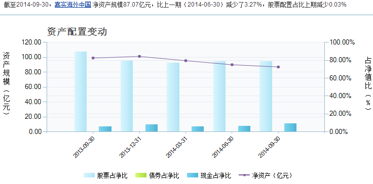 基金全稱:嘉實海外中國股票股票型證券投資基金 基金簡稱:嘉實海外中國 基金代碼:070012(前端) 基金類型:QDII 發(fā)行日期:2007年10月09日 成立日期/規(guī)模:2007年10月12日 / 297.503億份 資產(chǎn)規(guī)模:87.07億元(截止至:2014年09月30日) 份額規(guī)模:132.8509億份(截止至:2014年09月30日) 基金管理人:嘉實基金 基金托管人:中國銀行 基金經(jīng)理人:鐘山、劉競 成立來分紅:每份累計0.00元(0次) 管理費率:1.80%(每年) 托管費率:0.30%(每年) 最高申購費率:1.50%(前端) 最高贖回費率:0.50%(前端) 業(yè)績比較基準(zhǔn):MSCI中國指數(shù)