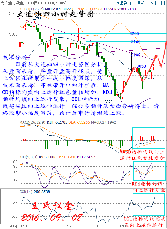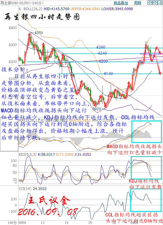 王氏寄語(yǔ): 開(kāi)心了就笑,不開(kāi)心了就過(guò)會(huì)兒再笑。走的最快的是最美的風(fēng)景,傷的最深的是最真的感情,忍無(wú)可忍,有時(shí)候沒(méi)法重新再忍,不是每個(gè)人都有機(jī)會(huì),重新站在當(dāng)初的十字路口。哪有那么多如果和假設(shè),如果有如果,那么更無(wú)所謂錯(cuò),也就無(wú)所謂對(duì)了,無(wú)論現(xiàn)實(shí)如何也要笑著面對(duì),五年之后回頭依舊是個(gè)笑話! 昨日收盤(pán): 美國(guó)WTI原油10月期貨周三(9月7日)收漲0.67美元,或1.49%,報(bào)45.50美元/桶。布倫特原油11月期貨周三收漲0.72美元,或1.52%,報(bào)47.98美元/桶。市場(chǎng)對(duì)產(chǎn)油國(guó)凍產(chǎn)協(xié)議達(dá)成的押注仍在為油價(jià)提供有效支撐,不過(guò)供應(yīng)過(guò)剩擔(dān)憂情緒也在升溫,多空交鋒日益激烈,預(yù)計(jì)油價(jià)還將呈現(xiàn)震蕩走勢(shì),不過(guò)美元暫止跌勢(shì)令油價(jià)反彈蒙上陰影。美國(guó)WTI原油期貨價(jià)格盤(pán)中最高觸及45.58美元/桶,布倫特原油期貨價(jià)格盤(pán)中最高觸及48.09元/桶。 基本面利好因素: 石油輸出國(guó)組織(OPEC)和非OPEC產(chǎn)油國(guó)將于9月26日至28日在阿爾及利亞舉行非正式會(huì)談,沙特和俄羅斯周一達(dá)成合作協(xié)議,愿意共同穩(wěn)定原油市場(chǎng),這令原油多頭大受鼓舞。但之后由于沙特能源部長(zhǎng)法利赫(Khalid al-Falih)表示當(dāng)前不需要限制產(chǎn)量,再度令市場(chǎng)對(duì)凍產(chǎn)協(xié)議的懷疑態(tài)度得到加強(qiáng),不過(guò)俄羅斯能源部長(zhǎng)諾瓦克(Alexander Novak)表示,如果其他國(guó)家選擇凍結(jié)產(chǎn)量,俄羅斯也愿意考慮配合,甚至不排斥必要的減產(chǎn)行動(dòng)。 能源情報(bào)監(jiān)測(cè)機(jī)構(gòu)Genscape數(shù)據(jù)顯示,上周美國(guó)原油主要交割地庫(kù)欣地區(qū)庫(kù)存減少約70萬(wàn)桶,這為美國(guó)市場(chǎng)提供了一定支撐。 俄羅斯能源部公布的數(shù)據(jù)顯示,今年8月俄羅斯原油、凝析油產(chǎn)量為4531萬(wàn)噸,或1071萬(wàn)桶/日,同比上漲0.1%,但環(huán)比下滑1.6%。數(shù)據(jù)還顯示,俄羅斯8月原油出口為499萬(wàn)桶/日,環(huán)比下滑5.67%,同比下滑0.6%。今年1月俄羅斯的原油產(chǎn)量曾觸及1091萬(wàn)桶/日,創(chuàng)下蘇聯(lián)解體后的歷史高位。俄羅斯總統(tǒng)普京(Vladimir Putin)在接受采訪時(shí)稱(chēng),他希望產(chǎn)油國(guó)能達(dá)成原油凍產(chǎn)協(xié)議,凍產(chǎn)對(duì)于全球油市將是個(gè)正確的決定。同時(shí),他還認(rèn)為凍產(chǎn)協(xié)議中可能要在伊朗產(chǎn)量方面作出讓步。 IEA月報(bào)稱(chēng),世界各地的煉廠第三季度將加工創(chuàng)紀(jì)錄的原油,在今年第二季度煉廠原油需求創(chuàng)下2009年以來(lái)最大跌幅之后,本季度需求將反彈。IEA同時(shí),石油輸出國(guó)組織(OPEC)成員國(guó)之間互相競(jìng)爭(zhēng),以保障市場(chǎng)份額,在這種情況下,即便沙特、科威特和阿聯(lián)酋原油產(chǎn)量位于歷史新高,但煉廠需求的回升將有助于吸收原油庫(kù)存。整體而言,IEA此次公布的月報(bào)中利多因素大于利空因素,因此對(duì)油價(jià)提供了強(qiáng)勁支撐。 大交所大連油(美原油)技術(shù)分析: 技術(shù)分析: 目前從大連油四小時(shí)走勢(shì)圖分析,從盤(pán)面來(lái)看,早盤(pán)開(kāi)盤(pán)高開(kāi)48點(diǎn),受上方強(qiáng)壓短期會(huì)一波小幅度回落,從技術(shù)面來(lái)看,布林帶開(kāi)口向外擴(kuò)散,MACD指標(biāo)均線向上運(yùn)行紅色量柱增加,KDJ指標(biāo)均線向上運(yùn)行發(fā)散,CCL指標(biāo)均線超買(mǎi)區(qū)向上延伸運(yùn)行。綜合各指標(biāo)及盤(pán)面分析得出,價(jià)格短期小幅度回落,預(yù)計(jì)后市行情繼續(xù)上漲。 操作建議: 今日大連油(美原油)整體操作趨勢(shì)以逢低做多為主,以高空為輔。(美原油兌大連油點(diǎn)位:約66.87) 日內(nèi)阻力:3160/3200(47.26/48.85) 日內(nèi)支撐:3050/3000(45.61/44.86) 激進(jìn)者空單3100-3110區(qū)間內(nèi)可以考慮擇機(jī)入場(chǎng)做空,止損3140上方,目標(biāo)3050/3020。 激進(jìn)者空單46.36-46.50區(qū)間內(nèi)可以考慮擇機(jī)入場(chǎng)做空,止損46.96上方,目標(biāo)45.61/45.16。 穩(wěn)健者空單3160-3170區(qū)間內(nèi)可以考慮擇機(jī)入場(chǎng)做空,止損3200上方,目標(biāo)3130/3100。 穩(wěn)健者空單47.26-47.41區(qū)間內(nèi)可以考慮擇機(jī)入場(chǎng)做空,止損47.85上方,目標(biāo)46.81/46.36。 激進(jìn)者多單3080-3070區(qū)間內(nèi)可以考慮擇機(jī)入場(chǎng)做多,止損3040下方,目標(biāo)3120/3160。 激進(jìn)者多單46.06-45.91區(qū)間內(nèi)可以考慮擇機(jī)入場(chǎng)做多,止損45.46下方,目標(biāo)46.66/47.26。 穩(wěn)健者多單3050-3040區(qū)間內(nèi)可以考慮擇機(jī)入場(chǎng)做多,止損3010下方,目標(biāo)3080/3120。 穩(wěn)健者多單45.61-45.46區(qū)間內(nèi)可以考慮擇機(jī)入場(chǎng)做多,止損45.01下方,目標(biāo)46.06/46.66。 以上操作建議僅供參考、投資有風(fēng)險(xiǎn)、操作需謹(jǐn)慎。 【以上建議出自中匯天融分析部,以實(shí)盤(pán)操作建議為準(zhǔn)】 大交所再生銀(現(xiàn)貨白銀)技術(shù)分析: 技術(shù)分析: 目前從再生銀四小時(shí)走勢(shì)圖分析,從盤(pán)面來(lái)看,價(jià)格在頂部
