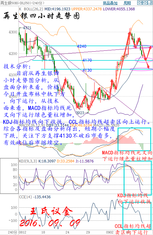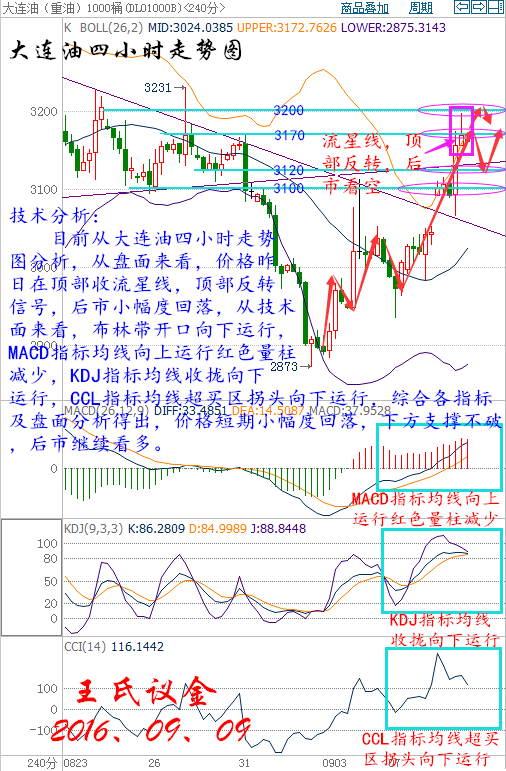 王氏寄語: 機會靠自己爭取,行情需自己把握,投資是自己的五線譜,要學會親自演奏好它!盈利的時候不浮躁,虧損的時候不胡鬧,一個人的格局影響結局,每一單都博的像生離死別,每一次都做的像決定所有,本身就偏離了投資的初衷。我帶上你,你不僅要帶上資金,還要帶上微笑,才能有資格走到君臨天下! 昨日收盤: 美國WTI原油10月期貨周四(9月8日)收漲2.12美元,或4.66%,報47.62美元/桶。布倫特原油11月期貨周四收漲2.01美元,或4.19%,報49.99美元/桶。今日美國原油庫存創1999年以來最大降幅,汽油庫存也創下2015年4月1日以來最大降幅,為油價帶來強勁支撐,同時中國8月進口觸及4月來最高也有效地改善了油市基本面狀況。美國WTI原油期貨價格盤中最高觸及47.74美元/桶,布倫特原油期貨價格盤中最高觸及50.13元/桶。 基本面利好因素: 美國能源信息署(EIA)數據顯示,截至9月2日當周,美國原油庫存減少1,451.3萬桶,市場預估為增加22.5萬桶。上周原油庫存錄得有記錄以來第二大降幅,僅次于1999年時期1520萬桶的周降幅。美國上周汽油庫存減421.1萬桶,市場預估為減少17.1萬桶,創2015年4月1日以來最大降幅。上周美國原油日進口量減少165.1萬桶,9月2日當周原油進口降幅為今年最高。不過美國上周精煉油庫存增加338.2萬桶,市場預估為增加68.4萬桶,精煉油庫存創下7月13日以來最高水平。 中國海關發布的數據顯示,作為全球最大的能源使用國,中國8月共進口3285萬噸原油,約777萬桶/日,為4月來最高。而新華社的數據顯示,中國7月商業原油庫存下滑環比5.7%。安迅思中國(ICIS China)分析師Amy Sun稱,隨著中國煉廠的煉油高峰季已過,這些煉廠將逐步開始補充庫存。 石油輸出國組織(OPEC)和非OPEC產油國將于9月26日至28日在阿爾及利亞舉行非正式會談,沙特和俄羅斯周一達成合作協議,愿意共同穩定原油市場,這令原油多頭大受鼓舞。但之后由于沙特能源部長法利赫(Khalid al-Falih)表示當前不需要限制產量,再度令市場對凍產協議的懷疑態度得到加強,不過俄羅斯能源部長諾瓦克(Alexander Novak)表示,如果其他國家選擇凍結產量,俄羅斯也愿意考慮配合,甚至不排斥必要的減產行動。 俄羅斯能源部公布的數據顯示,今年8月俄羅斯原油、凝析油產量為4531萬噸,或1071萬桶/日,同比上漲0.1%,但環比下滑1.6%。數據還顯示,俄羅斯8月原油出口為499萬桶/日,環比下滑5.67%,同比下滑0.6%。今年1月俄羅斯的原油產量曾觸及1091萬桶/日,創下蘇聯解體后的歷史高位。俄羅斯總統普京(Vladimir Putin)在接受采訪時稱,他希望產油國能達成原油凍產協議,凍產對于全球油市將是個正確的決定。同時,他還認為凍產協議中可能要在伊朗產量方面作出讓步。 大交所現貨原油技術分析: 技術分析: 目前從大連油四小時走勢圖分析,從盤面來看,價格昨日在頂部收流星線,頂部反轉信號,后市小幅度回落,從技術面來看,布林帶開口向下運行,MACD指標均線向上運行紅色量柱減少,KDJ指標均線收攏向下運行,CCL指標均線超買區拐頭向下運行,綜合各指標及盤面分析得出,價格短期小幅度回落,下方支撐不破,后市繼續看多。 操作建議: 今日大連油(美原油)整體操作趨勢以逢低做多為主,以高空為輔。(美原油兌大連油點位:約66.87) 日內阻力:3200/3230(47.85/48.3) 日內支撐:3120/3080(46.66/46.06) 激進者空單3170-3160區間內可以考慮擇機入場做空,止損3200上方,目標3130/3100。 激進者空單47.41-47.26區間內可以考慮擇機入場做空,止損47.85上方,目標46.81/46.36。 穩健者空單3190-3200區間內可以考慮擇機入場做空,止損3230上方,目標3160/3130。 穩健者空單47.7-47.85區間內可以考慮擇機入場做空,止損48.3上方,目標46.81/46.36。 激進者多單3130-3120區間內可以考慮擇機入場做多,止損3090下方,目標3160/3190。 激進者多單46.81-46.66區間內可以考慮擇機入場做多,止損46.21下方,目標47.26/47.7。 穩健者多單3090-3080區間內可以考慮擇機入場做多,止損3050下方,目標3130/3160。 穩健者多單46.21-46.06區間內可以考慮擇機入場做多,止損45.61下方,目標46.81/47.26。 以上操作建議僅供參考、投資有風險、操作需謹慎。 【以上建議出自中匯天融分析部,以實盤操作建議為準】 大交所現貨白銀技術分析: 技術分析: 目前從再生銀四小時走勢圖分析,從盤面分析來看,價格今日開盤布林中軌下方,向下運行,從技術面來看,MACD指標均線死叉向下運行綠色量柱增加,KDJ指標均線向下收攏,CCL指標均線超賣區向上運行。綜合各指標及盤面分析得出,短期小幅度下跌,關注下方支撐4130不破后市看多,有效破位后市繼續空。 操作建議: 今日再生銀(現貨白銀)整體操作趨勢以逢高做空為主,以低多為輔。(現貨白銀兌再生銀點位:約213.85) 日內阻力:4240/4270(19.83/19.97) 日內支撐:4150/4120(19.64/19.4) 激進者空單4190-4200區間內可以考慮擇機入場做空,止損4230上方,目標4160/4130。 激進者空單19.59-19.64區間內可以考慮擇機入場做空,止損19.78上方,目標19.45/19.31。 穩健者空單4230-4240區間內可以考慮擇機入場做空,止損4270上方,目標4200/4160。 穩健者空單19.78-19.83區間內可以考慮擇機入場做空,止損19.97上方,目標19.64/19.45。 激進者多單4170-4160區間內可以考慮擇機入場做多,止損4140下方,目標4200/4230。 激進者多單19.5-19.45區間內可以考慮擇機入場做多,止損19.36下方,目標19.64/19.78。 穩健者多單4120-4130區間內可以考慮擇機入場做多,止損4090下方,目標4150/4170。 穩健者多單19.26-19