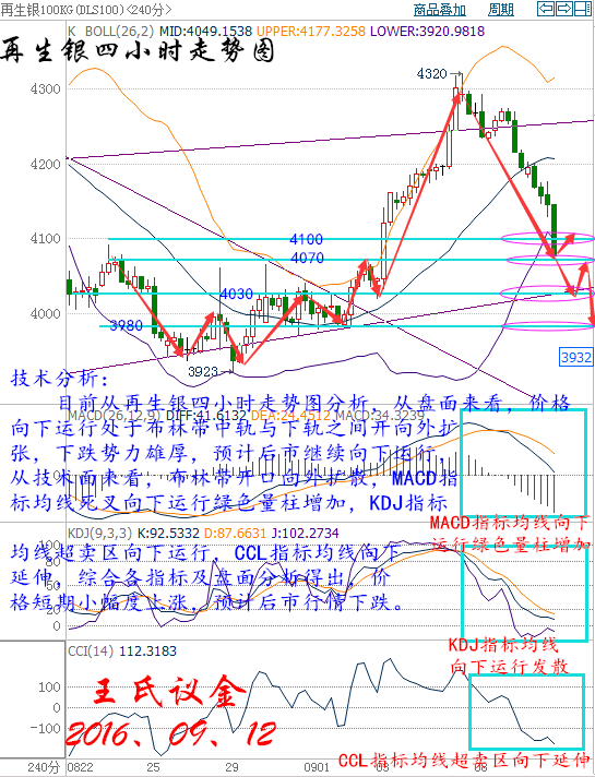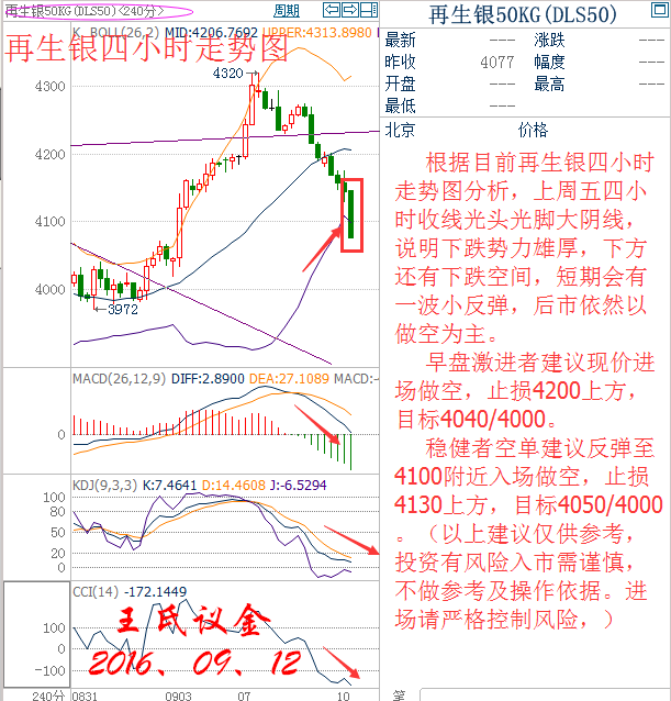 王氏寄語: 每天都是新的希望。行情起起落落有時(shí)你會(huì)認(rèn)為無法預(yù)料,有一點(diǎn)要牢記:交易當(dāng)中或許有許多失望,但一定不能絕望。每個(gè)人都是一個(gè)國王,在自己的世界里縱橫跋扈,習(xí)慣性的不愿聆聽別人的意見,你看不懂我的堅(jiān)定,就別輕易指責(zé)我的分析!怕事后打了嘲笑背后你那藏在一邊的臉! 上周五收盤: 美國WTI原油10月期貨周五(9月9日)收跌1.74美元,或3.65%,報(bào)45.88美元/桶,本周上漲3.26%。布倫特原油11月期貨周五收跌1.98美元,或3.96%,報(bào)48.01美元/桶,本周上漲2.54%。雖然凍產(chǎn)押注依然為油價(jià)提供支撐,但原油庫存大降的支撐效果開始消退,因市場認(rèn)為颶風(fēng)影響不會(huì)持續(xù),同時(shí)美元反彈以及美國石油活躍鉆井?dāng)?shù)的再度大增也令油價(jià)承壓。美國WTI原油期貨價(jià)格盤中最低觸及45.84美元/桶,布倫特原油期貨價(jià)格盤中最低觸及47.95美元/桶。 基本面利空因素: 波士頓聯(lián)儲(chǔ)主席羅森格倫周五表示,一直不愿加息的美聯(lián)儲(chǔ)如果等待太久才行動(dòng),那么其將面臨越來越大的風(fēng)險(xiǎn),所以逐漸收緊政策或許是恰當(dāng)?shù)摹A_森格倫歷來是美聯(lián)儲(chǔ)的一位鴿派官員,他意外發(fā)表鷹派言論后,金融市場掀起巨瀾。美元指數(shù)短線急漲至三個(gè)交易日高位95.56。美元走強(qiáng)令油價(jià)承壓。 美國油服公司貝克休斯(Baker Hughes)周五(9月9日)公布數(shù)據(jù)顯示,截至2016年9月9日當(dāng)周美國石油活躍鉆井?dāng)?shù)增加7座至414座,過去11周內(nèi)第10周錄得增加。同時(shí)美國石油和天然氣活躍鉆井總數(shù)增加11座至508座,較去年同期減少340座。 美國能源信息署(EIA)發(fā)布短期能源報(bào)告稱,2016年和2017年的美國原油產(chǎn)量降幅將小于預(yù)期,因擔(dān)心美國原油企業(yè)鉆井活動(dòng)增加將幫助產(chǎn)量回升。在報(bào)告中,EIA上調(diào)2016年美國原油產(chǎn)量預(yù)估上調(diào)至877萬桶/日,預(yù)估降幅縮小至65萬桶/日,同時(shí)上調(diào)2017年美國原油產(chǎn)量預(yù)估至851萬桶/日,預(yù)估降幅縮小至26萬桶/日。 據(jù)彭博匯總的數(shù)據(jù)顯示,就在OPEC準(zhǔn)備于本月晚些時(shí)候舉行非正式會(huì)談之際,來自該組織的日供應(yīng)量8月增加12萬桶,達(dá)到3369萬桶創(chuàng)下歷史新高,其中從沙特阿拉伯到科威特等成員國紛紛提高產(chǎn)量。阿聯(lián)酋8月產(chǎn)量首次觸及300萬桶/日,伊拉克和科威特的產(chǎn)量也較7月小幅上漲。盡管此前包括沙特和伊拉克在內(nèi)的產(chǎn)油國均表示會(huì)支持凍產(chǎn),但兩國8月產(chǎn)量續(xù)增令人懷疑OPEC的凍產(chǎn)是否可信。 伊朗副油長莫扎密表示,該國當(dāng)前原油產(chǎn)量為380萬桶/日,目標(biāo)是在年底前增產(chǎn)至400萬桶/日;伊朗或在年底前與投資者簽署2-3個(gè)原油合同,目前在建的9個(gè)煉油廠中,最大的產(chǎn)能為36萬桶/日。伊朗此前稱只有油市份額恢復(fù)至制裁前水平才會(huì)參與凍產(chǎn)。 大交所現(xiàn)貨原油技術(shù)分析: 技術(shù)分析: 目前從大連油四小時(shí)走勢圖分析,從盤面來看,價(jià)格向下成擴(kuò)張形態(tài)向下運(yùn)行,預(yù)計(jì)后市短期有一波小幅度反彈,上方關(guān)注3100壓力位。從技術(shù)面來看,布林帶開口收攏走平,MACD指標(biāo)均線收攏向下運(yùn)行紅色量柱減少,KDJ指標(biāo)均線向下運(yùn)行,CCL指標(biāo)均線由上向下運(yùn)行穿破0軸,綜合各指標(biāo)及盤面分析得出,價(jià)格短期小幅度反彈,預(yù)計(jì)后市行情繼續(xù)下跌。 操作建議: 今日大連油(美原油)整體操作趨勢以逢高做空為主,以低多為輔。(美原油兌大連油點(diǎn)位:約66.87) 日內(nèi)阻力:3100/3160(46.36/47.26) 日內(nèi)支撐:3020/2970(45.16/44.42) 激進(jìn)者空單3100-3110區(qū)間內(nèi)可以考慮擇機(jī)入場做空,止損3140上方,目標(biāo)3060/3020。 激進(jìn)者空單46.36-46.51區(qū)間內(nèi)可以考慮擇機(jī)入場做空,止損46.96上方,目標(biāo)45.76/45.16。 穩(wěn)健者空單3160-3170區(qū)間內(nèi)可以考慮擇機(jī)入場做空,止損3200上方,目標(biāo)3130/3100。 穩(wěn)健者空單47.26-47.41區(qū)間內(nèi)可以考慮擇機(jī)入場做空,止損47.85上方,目標(biāo)46.81/46.35。 激進(jìn)者多單3060-3050區(qū)間內(nèi)可以考慮擇機(jī)入場做多,止損3020下方,目標(biāo)3100/3130。 激進(jìn)者多單45.76-45.61區(qū)間內(nèi)可以考慮擇機(jī)入場做多,止損45.16下方,目標(biāo)46.36/46.81。 穩(wěn)健者多單2970-2980區(qū)間內(nèi)可以考慮擇機(jī)入場做多,止損2940下方,目標(biāo)3000/3020。 穩(wěn)健者多單44.42-44.56區(qū)間內(nèi)可以考慮擇機(jī)入場做多,止損43.97下方,目標(biāo)44.86/45.16。 以上操作建議僅供參考、投資有風(fēng)險(xiǎn)、操作需謹(jǐn)慎。 【以上建議出自中匯天融分析部,以實(shí)盤操作建議為準(zhǔn)】 大交所現(xiàn)貨白銀技術(shù)分析: 技術(shù)分析: 目前從再生銀四小時(shí)走勢圖分析,從盤面來看,價(jià)格向下運(yùn)行處于布林帶中軌與下軌之間開向外擴(kuò)張,下跌勢力雄厚,預(yù)計(jì)后市繼續(xù)向下運(yùn)行,從技術(shù)面來看,布林帶開口向外擴(kuò)散,MACD指標(biāo)均線死叉向下運(yùn)行綠色量柱增加,KDJ指標(biāo)均線超賣區(qū)向下運(yùn)