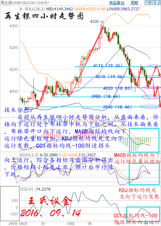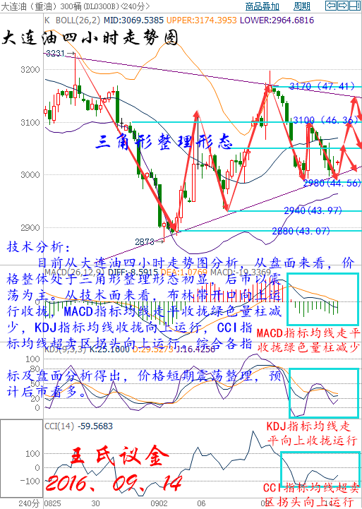 王氏寄語: 你所浪費的今天,是昨天死去的人奢望的明天,你所厭惡的現在,是未來的你回不去的曾經。不管市場刮風還是下雨,永遠都要學會帶著一顆周末的心情來迎接它們,意外只是對于沒有把握的人而言。 昨日收盤: 美國WTI原油10月期貨周二(9月13日)收跌1.39美元,或3%,報44.90美元/桶。布倫特原油11月期貨周二收跌1.22美元,或2.52%,報47.10美元/桶。繼石油輸出國組織(OPEC)之后,國際能源署(IEA)也發(fā)布悲觀月報,投資者對本月底的凍產會談預期大大降低,而美元回升也令油價承壓。美國WTI原油期貨價格盤中最低觸及44.77美元/桶,布倫特原油期貨價格盤中最低觸及46.97美元/桶。 基本面利好因素: 中國統計局數據顯示,中國8月原油產量為1645萬噸,約合387萬桶/日,較去年同期下降9.9%,日均產量觸及至少2009年12月以來最低水平,同時也為同期第二大單月降幅。低油價迫使國有油企逐漸關閉運營成本高昂的油田,更多依賴進口補充原油供應。中國8月共進口3285萬噸原油,約777萬桶/日,為4月來最高。這些有助于緩解原油市場的供應過剩問題。 美國能源信息署(EIA)數據顯示,截至9月2日當周,美國原油庫存減少1451.3萬桶,市場預估為增加22.5萬桶。上周原油庫存錄得有記錄以來第二大降幅,僅次于1999年時期1520萬桶的周降幅。美國上周汽油庫存減421.1萬桶,市場預估為減少17.1萬桶,創(chuàng)2015年4月1日以來最大降幅。上周美國原油日進口量減少165.1萬桶,9月2日當周原油進口降幅為今年最高。不過美國上周精煉油庫存增加338.2萬桶,市場預估為增加68.4萬桶,精煉油庫存創(chuàng)下7月13日以來最高水平。 石油輸出國組織(OPEC)和非OPEC產油國將于9月26日至28日在阿爾及利亞舉行非正式會談,沙特和俄羅斯在G20峰會期間達成合作協議,愿意共同穩(wěn)定原油市場,這令原油多頭大受鼓舞。但之后由于沙特能源部長法利赫(Khalid al-Falih)表示當前不需要限制產量,再度令市場對凍產協議的懷疑態(tài)度得到加強,不過俄羅斯能源部長諾瓦克(Alexander Novak)表示,如果其他國家選擇凍結產量,俄羅斯也愿意考慮配合,甚至不排斥必要的減產行動。 大交所現貨原油技術分析: 技術分析: 目前從大連油四小時走勢圖分析,從盤面來看,價格整體處于三角形整理形態(tài)初顯,后市以震蕩為主。從技術面來看,布林帶開口向上運行收攏,MACD指標均線走平收攏綠色量柱減少,KDJ指標均線收攏向上運行,CCI指標均線超賣區(qū)拐頭向上運行。綜合各指標及盤面分析得出,價格短期震蕩整理,預計后市看多。 操作建議: 今日大連油(美原油)整體操作趨勢以逢低做多為主,以高空為輔。(美原油兌大連油點位:約66.87) 日內阻力:3060/3110(45.76/46.51) 日內支撐:2980/2940(44.56/43.97) 激進者空單3020-3030區(qū)間內可以考慮擇機入場做空,止損3060上方,目標2980/2940。 激進者空單45.16-45.31區(qū)間內可以考慮擇機入場做空,止損45.76上方,目標44.56/43.97。 穩(wěn)健者空單3070-3060區(qū)間內可以考慮擇機入場做空,止損3100上方,目標3020/2980。 穩(wěn)健者空單45.91-45.76區(qū)間內可以考慮擇機入場做空,止損46.36上方,目標45.16/44.56。 激進者多單2980-2990區(qū)間內可以考慮擇機入場做多,止損2950下方,目標3020/3060。 激進者多單44.56-44.71區(qū)間內可以考慮擇機入場做多,止損44.16下方,目標46.36/46.81。 穩(wěn)健者多單2940-2930區(qū)間內可以考慮擇機入場做多,止損2900下方,目標2980/3020。 穩(wěn)健者多單43.97-43.82區(qū)間內可以考慮擇機入場做多,止損43.37下方,目標44.56/45.16。 以上操作建議僅供參考、投資有風險、操作需謹慎。 【以上建議出自中匯天融分析部,以實盤操作建議為準】 大交所現貨白銀操作建議: 技術分析: 目前從再生銀四小時走勢圖分析,從盤面來看,價格向下運行處于布林帶中軌與下軌之間,從技術面來看,布林帶開口向下運行,MACD指標均線向下運行綠色量柱增加,KDJ指標均線死叉向下運行發(fā)散,CCI指標均線-100附近拐頭向上運行。綜合各指標及盤面分析得出,價格短期小幅度上漲,預計后市行情下跌。 操作建議: 今日再生銀(現貨白銀)整體操作趨勢以逢高做空為主,以低多為輔。(現貨白銀兌再生銀點位:約213.49) 日內阻力:4070/4110(19.06/19.25) 日內支撐:3980/3940(18.64/18.46) 激進者空單4030-4040區(qū)間內可以考慮擇機入場做空,止損4070上方,目標4000/3970。 激進者空單18.87-18.92區(qū)間內可以考慮擇機入場做空,止損19.06上方,目標18.73/18.6。 穩(wěn)健者空單4110-4100區(qū)間內可以考慮擇機入場做空,止損4140上方,目標4050/4020。 穩(wěn)健者空單19.25-19.2區(qū)間內可以考慮擇機入場做空,止損19.39上方,目標18.97/18.83。 激進者多單3980-3970區(qū)間內可以考慮擇機入場做多,止損3940下方,目標4020/4050。 激進者多單18.64-18.6區(qū)間內可以考慮擇機入場做多,止損18.46下方,目標18.83/18.97。 穩(wěn)健者多單3940-3930區(qū)間內可以考慮擇機入場做多,止損3900下方,目標3970/4020。 穩(wěn)健者多單18.46-18.41區(qū)間內可以考慮擇機入場做多,止損18.27下方,目標18.6/18.83。 以上操作建議僅供參考、投資有風險、操作需謹慎。 【以上建議出自中匯天融分析部,以實盤操作建議為準】 今日可以關注的財經數據: 04:30 美國至9月9日當周API原油庫存(萬桶) 14:45 法國8月CPI月率 16:30 英國8月失業(yè)率 16:30 英國8月失業(yè)金申請人數(萬人) 16:30 英國7月三個月ILO失業(yè)率 17:00 歐元區(qū)7