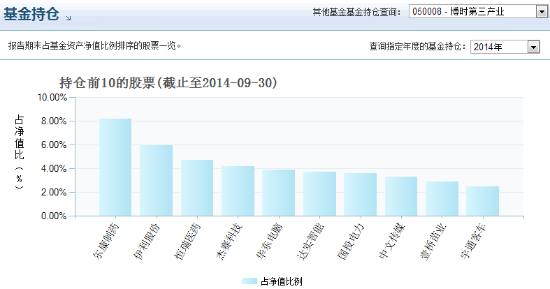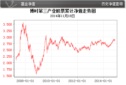 (博時基金管理公司) 一、博時第三產業基金簡介基金全稱:博時第三產業成長股票證券投資基金 基金簡稱:博時第三產業 基金代碼:050008(前端) 基金類型:股票型 發行日期:2007年04月24日 成立日期/規模:2007年04月12日 / 98.830億份 資產規模:47.87億元(截止至:2014年09月30日) 份額規模:55.3023億份(截止至:2014年09月30日) 基金管理人:博時基金 基金托管人:工商銀行 基金經理人:王雪峰 成立來分紅:每份累計0.44元(3次) 管理費率:1.50%(每年) 托管費率:0.25%(每年) 最高申購費率:1.50%(前端) 最高贖回費率:0.50%(前端) 業績比較基準:滬深300指數收益率×80%+中國債券總指數收益率×20%