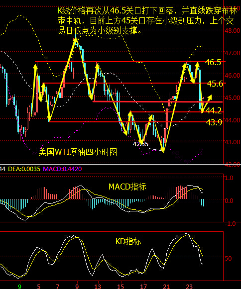 基本面分析: 周五(9月23日) 美國WTI原油11月期貨收跌1.84美元,或3.97%,報44.48美元/桶,上周上漲2.75%,盤中最低觸及44.23美元/桶。布倫特原油11月期貨周五收跌1.76美元,或3.69%,報45.89美元/桶,上周上漲2.27%,盤中最低觸及45.66美元/桶。 近期沙特對凍產協議的態度飄忽不定,在周五晚間表示下周會談恐無法達成協議,令投資情緒大受打擊,同時美國石油活躍鉆井數繼續攀升令油價承壓重挫。 三位知情消息人士稱,在下周阿爾及利亞產油國會議之前,沙特阿拉伯已經提出一項重大讓步,如果伊朗同意對其今年產量設限,沙特愿意降低自己的石油產量。不過隨后沙特方面表示,預期下周的產油國會談上不會達成凍產協議,這令多頭大失所望。 另外,美國能源信息署(EIA)數據顯示,截至9月16日當周美國原油庫存減少620萬桶,市場預估為增加335萬桶,連續三周錄得下滑。美國上周汽油庫存減少320.4萬桶,市場預估為減少56.7萬桶。美國原油交割地庫欣庫存減少124.5萬桶。庫欣地區原油庫存連續三周錄得下滑,降幅創12周最大。 原油技術面分析: 美國WTI原油從四小時走勢圖來看,K線價格再次從46.5關口附近打下回落,并直線跌穿布林帶中軌,目前在44.2獲得支撐開始反彈,上方45關口存在小級別壓力,上個交易日低點為小級別支撐。 附圖MACD指標快慢線零軸上方死叉向下運行,但快線有走緩跡象,綠色動能柱仍放量;KD指標高位死叉向下運行,K值有走緩跡象。 綜合來看,短線油價有反彈需求,預計亞盤時段將震蕩走平偏上行,亞盤時段操作上建議低多為主。另外OPEC峰會期間料油價將較大幅度的波動,操作上嚴格帶好止損。 美原油操作建議: 1、44.6美元下方做多,目標看向45美元上方,止損0.2美元; 2、45.6美元下方做空,目標看向44.7美元下方,止損0.3美元。 白銀技術面分析: 現貨白銀從四小時走勢圖來看,K線突破前期箱體后不斷走高,上方接近20.1位置后回落至靠近布林帶中軌19.6附近,布林帶三軌向上但目前有所走緩。附圖MACD指標快慢線在零軸上方形成死叉向下運行,綠色動能柱放量;KDJ指標三線向下運行,目前有走緩跡象。 綜合來看,白銀價格同樣有回落需求,至布林帶中軌預計將獲得支撐,操作上建議回落做多為主。 現貨白銀操作建議 1、回落至19.6美元附近做多,目標看向19.9美元附近,止損0.1美元; 2、19.9不破則做空,目標看向19.7美元附近,止損0.1美元。 今日重點關注數據: 2016年美國大選首場總統選舉辯論 日本央行行長黑田東彥講話 阿爾及利亞召開為期三天的國際能源論壇 16:00 德國9月IFO商業景氣指數 16:00 德國9月IFO商業現況指數 21:00 歐洲央行行長德拉基將在歐洲議會經濟暨貨幣事務委員會的季度聽證會上作介紹性陳述 22:00 美國8月新屋銷售年化月率 本文作者系CFP注冊理財規劃師,多年從事金融領域相關工作,對現貨大宗商品有豐富的實戰經驗。 (以上文章由春雨原創,轉載請注明出處。溫馨提示,投資有風險,入市需謹慎。以上僅代表春雨個人觀點,不作操作依據,據此操作風險自擔) |