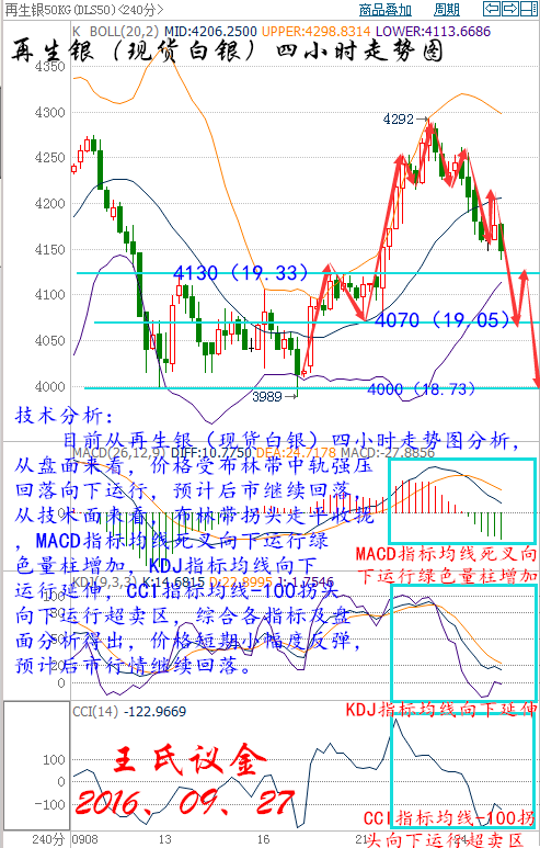 王氏寄語: 我努力了,只是你沒有看見,你用心了,只是市場沒有領情。總有一個人,一直住在心底,卻消失在生活里,總有一個波動,一直留在記憶里,卻無法再倒退重來。錢是什么東西,就是你沒有的東西?留不住孩提的年代,但可以修成童心,抓不住行情的曾經,卻可以空杯執行我的計劃。 昨日收盤: 美國WTI原油11月期貨周一(9月26日)收漲1.45美元,或3.26%,報45.93美元/桶。布倫特原油11月期貨周一收漲1.46美元,或3.18%,報47.35美元/桶。石油輸出國組織(OPEC)主要成員國在達成限產并降低油市供應過剩狀況方面可能取得了新的進展令市場重燃希望,同時庫欣地區庫存再度下降也為油市提供了有效支撐。美國WTI原油期貨價格盤中最高觸及46.20美元/桶,布倫特原油期貨價格盤中最高觸及48.24美元/桶。 原油國際消息面: 受阿爾及利亞會議召開在即,歐佩克產油國不斷吹風,以及空頭大規模平倉影響,原油價格周一美盤時段漲逾3%。不過,隨后油價有所回落。畢竟,中期投機者仍在不斷減少原油的多頭持倉,證明了投資者對歐佩克能夠達成限產協議并不抱希望。 紐約商品交易所11月交割的WTI原油期貨價格上漲3.3%,收于45.93美元/桶,倫敦洲際交易所11月交割的布倫特原油期貨價格上漲3.2%,收于47.35美元/桶。  如今牽動著油市神經的國際能源論壇將于北京時間9月27日16:00舉行開幕式,9月28日19:30-20:30召開新聞發布會,而歐佩克成員國將在論壇會議間隙展開討論是否凍產。在會議結果出爐前,各種小道消息可能會加劇油市的波動。但市場普遍認為,達成凍產的可能性較低,而且產能凍結在如此高的水平,也很難緩解當前的供給過剩,中線油價仍有下行風險。 雖說,阿爾及利亞是歐佩克產油國的福地,且阿爾及利亞能源部長上周日(9月25日)亦表示,在歐佩克非正式會議上,減產和凍產皆有可能,這亦給油價提供了些許支撐。阿爾及利亞能源部長亦強調,他們不會兩手空空走出會場。不過,阿爾及利亞石油部長布特爾法(Noureddine Bouterfa)警告稱,如果阿爾及利亞會議無果而終,原油價格可能會回落至低于30美元/桶的范圍內,而這似乎是最符合現實的情況。 而且,大多分析師認為,在9月阿爾及利亞的非正式會議上沙特的目標是為11月的維也納政策會議起草一份正式性的“凍產”協議建立共識,但任何排除伊朗在外的“凍產”協議則將是無效的。 如果OPEC成員國最終未達成“凍產”協議,原油市場則將失去供求平衡,原油價格則不會在40美元/桶至50美元/桶的區間范圍內正常波動。因此,這就將質疑OPEC組織控制原油市場的能力和威信。因此,即便此次歐佩克產油國的會晤為非正式會議,亦將決定油價的生死。 現貨原油技術分析及操作建議———— 技術分析: 目前從大連油(美原油)四小時走勢圖分析,從盤面來看,價格進入三角形整理形態,后市行情整理震蕩,從技術面來看,布林帶開口收攏走平,MACD指標均線收攏向上運行并綠色量柱減少,KDJ指標均線金叉向上運行,CCI指標均線由下向上運行穿破0軸,綜合各指標及盤面分析得出,價格短期小幅度上漲,預計后市行情回落。 大連油操作建議 今日大連油整體操作趨勢以逢高做空為主,以低多為輔。 日內阻力:3080/3120 日內支撐:3000/2960 激進者空單3040-3050區間內可以考慮擇機入場做空,止損3080上方,目標3000/2960。 穩健者空單3080-3090區間內可以考慮擇機入場做空,止損3120上方,目標3040/3000。 激進者多單3000-2990區間內可以考慮擇機入場做多,止損2960下方,目標3040/3080。 穩健者多單2960-2970區間內可以考慮擇機入場做多,止損2930下方,目標3000-3040。 美原油操作建議: 今日美原油整體操作趨勢以逢高做空為主,以低多為輔。 日內阻力:46.25/46.85 日內支撐:45.05/44.45 激進者空單45.65-45.8區間內可以考慮擇機入場做空,止損46.25上方,目標45.05/44.45。 穩健者空單46.25-46.4區間內可以考慮擇機入場做空,止損46.85上方,目標45.65/45.05。 激進者多單45.05-44.9區間內可以考慮擇機入場做多,止損44.45下方,目標45.65/46.25。 穩健者多單44.45-44.6區間內可以考慮擇機入場做多,止損44下方,目標45.05/45.65。 以上操作建議僅供參考、投資有風險、操作需謹慎。 【以上建議出自中匯天融分析部,以實盤操作建議為準】 現貨白銀技術分析及操作建議———— 技術分析: 目前從再生銀(現貨白銀)四小時走勢圖分析,從盤面來看,價格受布林帶中軌強壓回落向下運行,預計后市繼續回落,從技術面來看,布林帶拐頭走平收攏,MACD指標均線死叉向下運行綠色量柱增加,KDJ指標均線向下運行延伸,CCI指標均線-100拐頭向下運行超賣區,綜合各指標及盤面分析得出,價格短期小幅度反彈,預計后市行情繼續回落。 再生銀操作建議: 今日再生銀整體操作趨勢以逢高做空為主,以低多為輔。 日內阻力:4200/4250 日內支撐:4100/4070 激進者空單4150-4160區間內可以考慮擇機入場做空,止損4200上方,目標4100/4070。 穩健者空單4210-4200區間內可以考慮擇機入場做空,止損4240上方,目標4150/4100。 激進者多單4100-4110區間內可以考慮擇機入場做多,止損4070下方,目標4150/4210。 穩健者多單4000-4010區間內可以考慮擇機入場做多,止損3970下方,目標4050/4100。 現貨白銀操作建議: 今日現貨白銀整體操作趨勢以逢高做空為主,以低多為輔。 日內阻力:19.66/19.9 日內支撐:19.19/19.05 激進者空單19.43-19.48區間內可以考慮擇機入場做空,止損19.66上方,目標19.19/19.05。 穩健者空單19.71-19.66區