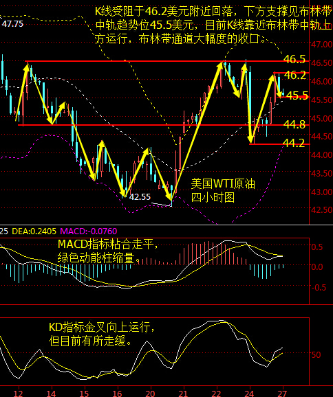 基本面分析: 周一(9月26日)美國WTI原油11月期貨收漲1.45美元,或3.26%,報45.93美元/桶,盤中最高觸及46.20美元/桶。布倫特原油11月期貨收漲1.46美元,或3.18%,報47.35美元/桶,盤中最高觸及48.24美元/桶。 石油輸出國組織(OPEC)主要成員國在達成限產并降低油市供應過剩狀況方面可能取得了新的進展令市場重燃希望,同時庫欣地區庫存再度下降也為油市提供了有效支撐。 市場消息顯示,沙特和伊朗在進行協商,他們不像是在此前多哈會議時那樣嚴重分歧。這個象征意義將比在會議上達成一個實際減產數字要更重要。委內瑞拉油長皮諾之前也曾表示,OPEC與非OPEC產油國接近達成產量協議,正致力于在伊朗與沙特之間達成一致立場,而俄羅斯或將考慮支持協議。 目前市場靜待產油國的凍產會談結果,部分分析師認為凍產協議的達成概率增在攀升。 原油技術面分析: 美國WTI原油從四小時走勢圖來看,K線受阻于46.2美元附近回落,下方支撐見布林帶中軌趨勢位45.5美元附近,目前K線靠近布林帶中軌上方運行,布林帶通道大幅度的收口。 MACD指標快慢線在零軸上方粘合走平,綠色動能柱縮量;KD指標金叉向上運行,但目前有所走緩。 綜合來看,目前油價下行概率較高,但亞盤時段料動能不足,預計亞盤時段將震蕩走平偏下行。操作上建議高位做空為主。 美原油操作建議:逢高做空 1、45.8美元附近做空,目標看向45美元下方,止損0.2美元; 2、44.8美元上方做多,目標45.5美元上方,止損0.3美元。 白銀技術面分析: 昨日現貨白銀市場延續了上周的回落過程,行情早盤回踩19.725的位置就開始回落過程,盤中跌破上周五低點19.558的位置后行情加速下行,盤中最低給到了19.324的位置后行情開始整理過程,最終日線收線在了19.414的位置后日線以一根下影線稍長于上影線的大陰線收尾,而這樣的大陰線收尾后,今日的行情回踩19.5空,止損19.7下方目標看19.3,跌破看19.1附近。 黃金技術面分析: 從4小時的形態看,目前的行情處于一個不規則整理的范圍內,但上方壓力強度明顯,昨日行情小幅低開后行情先小幅拉升給出1340.1的位置后行情遇阻開始回落,4小時形成射擊之星4小時構造后行情延續回落過程,給出日線低點1332.4的位置后行情受到支撐小幅拉升,4小時完成陽包陰形態后強勢拉升,最高觸及到了1342附近后受到基本面利空因素影響行情開始回落過程,最終日線收線在了1337.5的位置后,日線以一根上影線稍長于下影線的長腳十字星形態收尾,而這樣的形態收尾后今日的行情先給哪邊做哪邊,操作上,如果早盤先回落給出1333多,止損1330上方目標主要看1339-1342這個區間,而如果早盤先拉升給出1340附近就可以空,保守1342附近空,止損1344,下方目標看1332,跌破的話空單可跟進止損到本錢持有。 今日重點關注數據: 09:00美國總統大選第一場電視辯論 09:30中國8月規模以上工業企業利潤同比 16:00國際能源論壇開幕式 21:45美國9月Markit綜合PMI初值 22:00美國9月里奇蒙德聯儲制造業指數 22:00美國9月諮商會消費者信心指數 23:15美聯儲副主席費希爾發表講話 (以上文章由本人春雨撰寫,轉載請注明出處,溫馨提示:投資有風險,入市需謹慎,建議僅供參考!) |