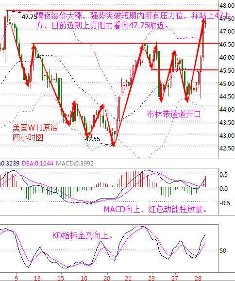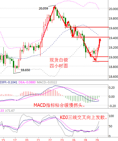 基本面分析: 周三(9月28日) 美國WTI原油11月期貨收漲2.38美元,或5.33%,報47.05美元/桶,盤中最高觸及47.43美元/桶。布倫特原油11月期貨周三收漲2.72美元,或5.92%,報48.69美元/桶,盤中最高觸及49.49美元/桶。 OPEC成員國在阿爾及爾達成凍產協議以限制原油供應,為8年以來首次達成凍產協議。OPEC同意將石油產量限制在3250-3300萬桶/日區間。 國能源信息署(EIA)數據顯示,截至9月23日當周美國原油庫存減少190萬桶,市場預估為增加300萬桶,連續四周錄得下滑。美國精煉油庫存減少190萬桶,市場預估為減少1.4萬桶,為8周來首次錄得下滑。此外,美國原油交割地庫欣庫存減少63.1萬桶。 盡管原油庫存錄得減少利多油價,但由于開始時市場對于凍產協議預期并不樂觀,油價反轉走陰,最低曾觸及44.35美元/桶。而后緩慢走高,再之后利比亞官員出面表示稱預計歐佩克可能就提議達成共識,今天將達成凍產協議。油價短線上漲,在后半夜大幅上漲站上47美元/桶。 原油技術面分析: 原油價格走勢圖,凍產協議達成 美國WTI原油從四小時走勢圖來看,隔夜油價大漲,K線強勢突破短期內所有壓力位,并站上47上方,目前近期上方阻力看向47.75附近。 從指標來看,布林帶通道開口,附圖MACD指標快慢線金叉向上發散,紅色動能柱大幅放量;KD指標形成金叉向上運行。 綜合來看,結合基本面技術面,油價短期內或保持持續上漲,中間偶爾伴隨著技術性回調。短期內的操作建議以低位做多為主。 美原油操作策略:低多為主。 短期內46美元上方做多,目標可看向48美元上方,止損0.5美元; 空單暫不考慮。 白銀技術面分析: 現貨白銀從四小時走勢圖來看,K線在運行至布林帶下軌附近后開始大幅反彈,反彈至靠近布林帶中軌19.4附近受阻,下方最低靠近18.9。 從指標來看,布林帶通道收口向下,附圖MACD指標快慢線在零軸下方粘合緩慢拐頭,綠色動能柱縮量;KDJ指標三線交叉向上發散。 綜合來看,白銀價格上漲動能較充足,短線上操作應以低位做多為主。 白銀操作建議: 回落至19美元附近做多,短線目標可看向19.4美元附近,激進可看向19.6美元附近,止損帶在18.9美元下方; 19.5附近做空,目標看向19美元上方附近,止損0.1美元; 今日重點關注數據: 08:00 美聯儲2016年票委喬治講話 15:55 德國9月失業人數變動 20:00 德國9月CPI 20:30 美國二季度實際GDP、9月24日當周初請數據 22:00 美國8月成屋簽約銷售指數、美聯儲理事鮑威爾講話 (以上文章由本人春雨撰寫,轉載請注明出處,溫馨提示:投資有風險,入市需謹慎,建議僅供參考!) |
