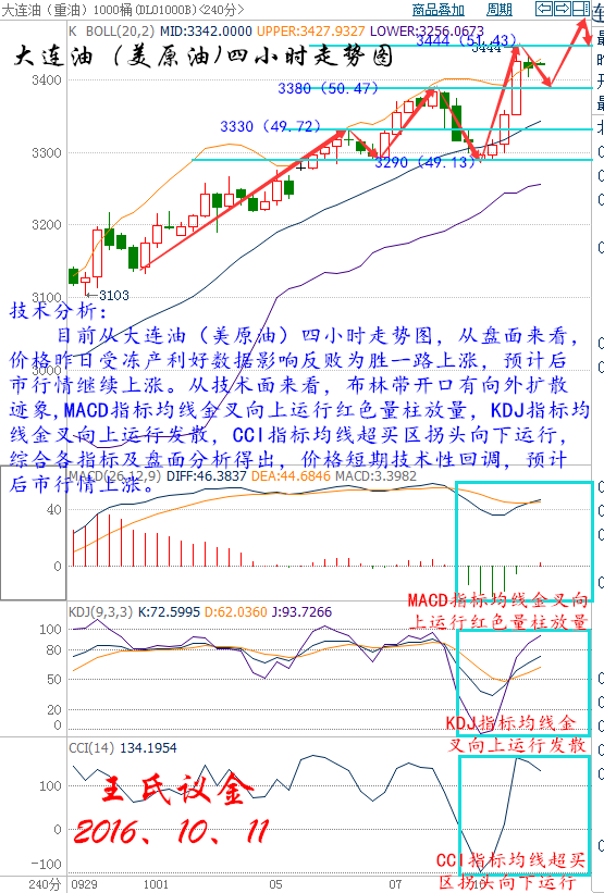 (原標(biāo)題:王氏議金:10、11現(xiàn)貨原油、白銀及天然氣操作建議!凍產(chǎn)在即,蓄勢待發(fā)) 王氏寄語: 每天都是新的希望,行情起起落落總有些人覺得沒法預(yù)料,可有一點(diǎn)要牢記:博弈或許有許多失望,但一定不能絕望,每天都是新的超越。一個人無論他的過去是不堪回首,還是風(fēng)光無限,都會隨著時光的流逝而成為歷史,演變成故事,把握當(dāng)下放下過去的光環(huán),撿起激情握住現(xiàn)在的行情。 昨日收盤: 美國WTI原油11月期貨周一(10月10日)收漲1.54美元,或3.09%,報51.35美元/桶。布倫特原油12月期貨周一收漲1.21美元,或2.33%,報53.14美元/桶。俄羅斯積極表態(tài)愿意配合限產(chǎn)行動,日內(nèi)原油多頭大受鼓舞,不過美元反彈令油價的上漲空間受到一定程度的限制。美國WTI原油期貨價格盤中最高觸及51.59美元/桶,布倫特原油期貨價格盤中最高觸及53.73美元/桶。 基本面利好因素: 周一沙特、俄羅斯、以及委內(nèi)瑞拉等產(chǎn)油國官員紛紛發(fā)表利多油價的言論,尤其是俄羅斯總統(tǒng)普京的講話,著實(shí)大力提振油市多頭的信心。俄羅斯總統(tǒng)普京表示,俄羅斯愿意考慮協(xié)同石油輸出國組織(OPEC)凍結(jié)原油產(chǎn)量,甚至是減產(chǎn)。俄羅斯是全球最大的能源出口國。 能源情報監(jiān)測機(jī)構(gòu)Genscape最新數(shù)據(jù)顯示,截至10月7日當(dāng)周,美國原油主要交割地庫欣地區(qū)原油庫存減少38.3萬桶。 美國能源信息署(EIA)數(shù)據(jù)顯示,截至9月30日當(dāng)周美國原油庫存減少297.6萬桶,市場預(yù)估為增加150萬桶,連續(xù)五周錄得下滑。美國精煉油庫存連續(xù)兩周下滑,降幅創(chuàng)四個月以來最大。此外,美國原油進(jìn)口下滑1.6%至771萬桶每日,產(chǎn)量下降0.4%至847萬桶美日。 OPEC成員國在阿爾及爾達(dá)成凍產(chǎn)協(xié)議以限制原油供應(yīng),為8年以來首次達(dá)成凍產(chǎn)協(xié)議。OPEC同意將石油產(chǎn)量限制在3250-3300萬桶/日區(qū)間。一位消息人士稱,一旦該組織達(dá)到其目標(biāo),OPEC將向非OPEC產(chǎn)油國尋求支持。此外,OPEC將在11月的下次正式會議上對各成員國的具體產(chǎn)量水準(zhǔn)達(dá)成協(xié)議。 中國統(tǒng)計局?jǐn)?shù)據(jù)顯示,中國8月原油產(chǎn)量為1645萬噸,約合387萬桶/日,較去年同期下降9.9%,日均產(chǎn)量觸及至少2009年12月以來最低水平,同時也為同期第二大單月降幅。低油價迫使國有油企逐漸關(guān)閉運(yùn)營成本高昂的油田,更多依賴進(jìn)口補(bǔ)充原油供應(yīng)。中國8月共進(jìn)口3285萬噸原油,約777萬桶/日,為4月來最高。這些有助于緩解原油市場的供應(yīng)過剩問題。 現(xiàn)貨原油技術(shù)分析及操作建議----------- 技術(shù)分析: 目前從大連油(美原油)四小時走勢圖,從盤面來看,價格昨日受凍產(chǎn)利好數(shù)據(jù)影響反敗為勝一路上漲,預(yù)計后市行情繼續(xù)上漲。從技術(shù)面來看,布林帶開口有向外擴(kuò)散跡象,MACD指標(biāo)均線金叉向上運(yùn)行紅色量柱放量,KDJ指標(biāo)均線金叉向上運(yùn)行發(fā)散,CCI指標(biāo)均線超買區(qū)拐頭向下運(yùn)行,綜合各指標(biāo)及盤面分析得出,價格短期技術(shù)性回調(diào),預(yù)計后市行情上漲。 大連油操作建議: 今日大連油(美原油)整體趨勢以逢低做多為主,以高空為輔。 日內(nèi)阻力 :3450/3500 日內(nèi)支撐:3360/3320 激進(jìn)者空單3410~3420區(qū)間內(nèi)可以考慮擇機(jī)入場做空,止損3450上方,目標(biāo)3360/3320。 穩(wěn)健者空單3450~3460區(qū)間內(nèi)可以考慮擇機(jī)入場做空,止損3490上方,目標(biāo)3400/3360。 激進(jìn)者多單3400~3390區(qū)間內(nèi)可以考慮擇機(jī)入場做多,止損3360下方,目標(biāo)3450/3480。 穩(wěn)健者多單3360~3350區(qū)間內(nèi)可以考慮擇機(jī)入場做多,止損3320下方,目標(biāo)3400/3450。 以上操作建議僅供參考、投資有風(fēng)險、操作需謹(jǐn)慎。 【以上建議出自中匯天融分析部,以實(shí)盤操作建議為準(zhǔn)】 美原油操作建議: 今日美原油整體趨勢以逢低做多為主,以高空為輔。 日內(nèi)阻力 :51.52/52.26 日內(nèi)支撐:50.17/49.57 激進(jìn)者空單50.92~51.07區(qū)間內(nèi)可以考慮擇機(jī)入場做空,止損51.52上方,目標(biāo)50.17/49.57。 穩(wěn)健者空單51.52~51.69區(qū)間內(nèi)可以考慮擇機(jī)入場做空,止損52.11上方,目標(biāo)50.77/50.17。 激進(jìn)者多單50.77~50.62區(qū)間內(nèi)可以考慮擇機(jī)入場做多,止損50.17下方,目標(biāo)51.52/51.96。 穩(wěn)健者多單50.17~50.02區(qū)間內(nèi)可以考慮擇機(jī)入場做多,止損49.57下方,目標(biāo)50.77/51.52。 以上操作建議僅供參考、投資有風(fēng)險、操作需謹(jǐn)慎。 【以上建議出自中匯天融分析部,以實(shí)盤操作建議為準(zhǔn)】 瀝青方面操作指導(dǎo): 瀝青屬原油衍生品,行情走勢分析與原油走勢相同,因平臺不同點(diǎn)位各異,有做瀝青需要指導(dǎo)的朋友可以聯(lián)系本人。 華益金安天然氣技術(shù)分析及操作建議------- 技術(shù)分析: 日線上看布林帶開口向上,說明中線震蕩走高的概率較大,目前K線運(yùn)行于五日均線上方,預(yù)計今日會有一波報復(fù)性回調(diào),但不破支撐位的情況下大趨勢依舊看多。所以今日建議依舊是等待回調(diào)再做多最為穩(wěn)健。 天然氣操作建議: 激進(jìn)者空單建議5530-5540附