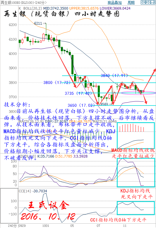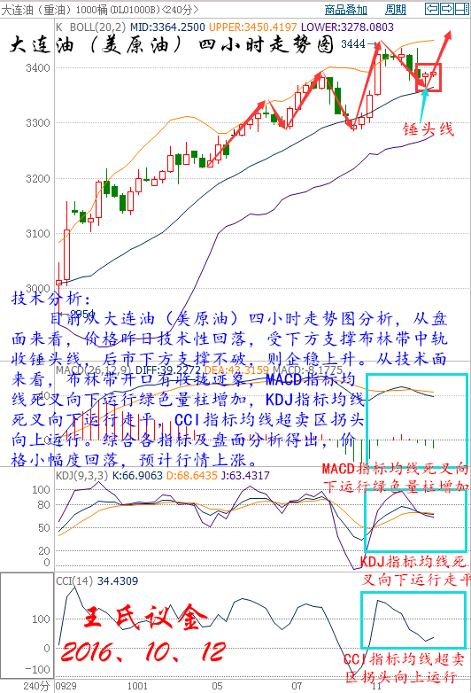 王氏寄語: 耳中常聞逆耳之言,心中常有佛心之事,才是進德修行之砥石。帶著愛心托缽,就能托出來菩薩的境界,帶著要飯的心托缽,撐死就是個丐幫幫主。心態(tài)決定你是坐騎還是騎手。總有一個地方,一些人,一輩子藏在心底不愿分享,總有一些行情、一次扛單,永遠埋在心里不愿提起,那又如何?絲毫不會影響你跟隨及信任我的沖動。 昨日收盤: 美國WTI原油11月期貨周二(10月11日)收跌0.56美元,或1.09%,報50.79美元/桶。布倫特原油12月期貨周二收跌0.73美元,或1.37%,報52.41美元/桶。俄羅斯原油企業(yè)對減產(chǎn)的反對態(tài)度令限產(chǎn)前景出現(xiàn)變數(shù),目前產(chǎn)油國正齊聚伊斯坦布爾準備進行進一步磋商,市場將密切關注最新的會談結果,此外,美元繼續(xù)反彈也令油價承壓。美國WTI原油期貨價格盤中最低觸及50.39美元/桶,布倫特原油期貨價格盤中最低觸及52.12美元/桶。 基本面利好因素: 國際能源署(IEA)月報稱,若石油輸出國組織(OPEC)和俄羅斯達成協(xié)議的減產(chǎn)幅度夠大,則全球油市可能加速恢復供需平衡,但在更多細節(jié)浮現(xiàn)之前,尚不清楚這個速度有多快。IEA在8月報告中稱,預計明年全球石油日需求增長120萬桶,與上月預估一致,但將2016年增幅預估從130萬桶下調(diào)至約120萬桶。 能源情報監(jiān)測機構Genscape最新數(shù)據(jù)顯示,截至10月7日當周,美國原油主要交割地庫欣地區(qū)原油庫存減少38.3萬桶。 美國能源信息署(EIA)數(shù)據(jù)顯示,截至9月30日當周美國原油庫存減少297.6萬桶,市場預估為增加150萬桶,連續(xù)五周錄得下滑。美國精煉油庫存連續(xù)兩周下滑,降幅創(chuàng)四個月以來最大。此外,美國原油進口下滑1.6%至771萬桶每日,產(chǎn)量下降0.4%至847萬桶美日。 OPEC成員國在阿爾及爾達成凍產(chǎn)協(xié)議以限制原油供應,為8年以來首次達成凍產(chǎn)協(xié)議。OPEC同意將石油產(chǎn)量限制在3250-3300萬桶/日區(qū)間。一位消息人士稱,一旦該組織達到其目標,OPEC將向非OPEC產(chǎn)油國尋求支持。此外,OPEC將在11月的下次正式會議上對各成員國的具體產(chǎn)量水準達成協(xié)議。 現(xiàn)貨原油技術分析及操作建議———— 技術分析: 目前從大連油(美原油)四小時走勢圖分析,從盤面來看,價格昨日技術性回落,受下方支撐布林帶中軌收錘頭線,后市下方支撐不破,則企穩(wěn)上升。從技術面來看,布林帶開口有收攏跡象,MACD指標均線死叉向下運行綠色量柱增加,KDJ指標均線死叉向下運行走平,CCI指標均線超賣區(qū)拐頭向上運行。綜合各指標及盤面分析得出,價格小幅度回落,預計行情上漲。 大連油操作建議: 今日大連油(美原油)整體趨勢以逢低做多為主,以高空為輔。 日內(nèi)阻力 :3420/3450 日內(nèi)支撐:3360/3320 激進者空單3400~3410區(qū)間內(nèi)可以考慮擇機入場做空,止損3440上方,目標3360/3320。 穩(wěn)健者空單3450~3440區(qū)間內(nèi)可以考慮擇機入場做空,止損3480上方,目標3400/3360。 激進者多單3380~3370區(qū)間內(nèi)可以考慮擇機入場做多,止損3340下方,目標3420/3450。 穩(wěn)健者多單3330~3340區(qū)間內(nèi)可以考慮擇機入場做多,止損3300下方,目標3380/3420。 以上操作建議僅供參考、投資有風險、操作需謹慎。 【以上建議出自中匯天融分析部,以實盤操作建議為準】 美原油操作建議: 今日美原油整體趨勢以逢低做多為主,以高空為輔。 日內(nèi)阻力 :51.32/51.77 日內(nèi)支撐:50.42/49.82 激進者空單51.02~51.17區(qū)間內(nèi)可以考慮擇機入場做空,止損51.62上方,目標50.42/49.82。 穩(wěn)健者空單51.77~51.62區(qū)間內(nèi)可以考慮擇機入場做空,止損52.22上方,目標51.02/50.42。 激進者多單50.72~50.57區(qū)間內(nèi)可以考慮擇機入場做多,止損50.12下方,目標51.32/51.77。 穩(wěn)健者多單49.97~50.12區(qū)間內(nèi)可以考慮擇機入場做多,止損49.52下方,目標50.72/51.32。 以上操作建議僅供參考、投資有風險、操作需謹慎。 【以上建議出自中匯天融分析部,以實盤操作建議為準】 瀝青方面操作指導: 瀝青屬原油衍生品,行情走勢分析與原油走勢相同,因平臺不同點位各異,有做瀝青需要指導的朋友可以聯(lián)系本人。 華益金安天然氣技術分析及操作建議------- 技術分析: 天然氣,在六連陽之后首度收陰,這意味著目前已經(jīng)階段性的見頂,昨日收盤于5日均線上方,目前K線運行于布林中上軌,布林帶繼續(xù)向上開口,下方受布林中軌支撐,5日、10日、20日均線向上運行,下方受5日均線支撐,副圖指標MACD金叉上行,紅色動能柱放量,隨機指標KDJ拐頭向上,有走平跡象,綜合來看,預計今日將延續(xù)昨日的跌勢,日內(nèi)關注上方5480一線的壓制情況,操作上建議高位做空為主! 操作建議: 激進者空單5480-5490區(qū)間做空,止損40點,目標5410-5380。 穩(wěn)健者多單5350-5360區(qū)間做多,止損40點,目標5420-5430。 (此建議短線小幅盈利目標,高危行情不可盲目操作,嚴格控制風險)以上操作建議僅供參考、投資有風險、操作需謹慎。 【以上建議出自中匯天融分析部,以實盤操作建議為準】 現(xiàn)貨白銀技術分析及操作建議-------- 技術分析: 目前從再生銀(現(xiàn)貨白銀)四小時走勢圖分析,從盤面來看,價格技術性回落,下方支撐不破,后市繼續(xù)看反彈。從技術面來看,布林帶開口走平收攏,MACD指標均線收攏走平紅色量柱減少,KDJ指標均線死叉向下走平,CCI指標均線0