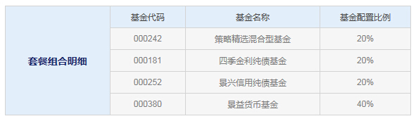 吃飯,套餐營養;話費,套餐實惠;旅游,套餐全面。套餐的出現給我們生活帶來了極大的優惠,同時也解救了選擇糾結癥患者。對于理財投資組合型套餐更能在一定程度上分攤風險,增加收益。下面你將了解到的是景順基金公司針對不同類型投資者推出的投資套餐,合不合適,了解了才知道。 一、保守型套餐1、組合明細: