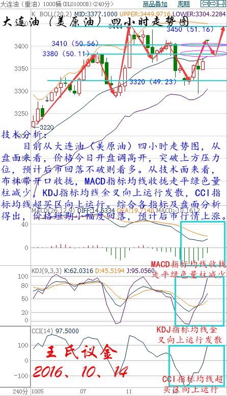王氏議金:10、14白銀、瀝青、原油分析及天然氣操作建議,止跌回升51美元 王氏寄語: 沒有不冒風險就能克服的風險,沒有不經歷波動就能收獲的行情,遇繁而若一,履險而若夷,淡定來自于內心的強大,從容是對判斷的肯定。兄弟不是為慶祝勝利,而是陪你共渡難關。兄弟就是把你灌翻時嘲笑你酒量小,卻累的半死也要把你背回家的人,就像你與我的相遇,不是在最好的年華、盈利不止的時候相逢,而是你我的相遇就是最好的年華,就是為了迎接更好的止盈。 昨日收盤: 美國WTI原油11月期貨周四(10月13日)收漲0.26美元,或0.52%,報50.44美元/桶。布倫特原油12月期貨周四收漲0.22美元,或0.42%,報52.03美元/桶。美國上周庫存報告喜憂參半,成品油庫存大降抵消了原油庫存增加的利空,而美元回落則為油價提供了一定支撐。美國WTI原油期貨價格盤中最高觸及50.59美元/桶,布倫特原油期貨價格盤中最高觸及52.15美元/桶。 基本面利好因素: 美國能源信息署(EIA)公布數據顯示,截至10月7日當周,美國汽油庫存減少190萬桶,市場預估為減少150萬桶。EIA汽油庫存結束連續兩周的增加趨勢,創下9月16日當周以來最大降幅。同時美國精煉油庫存減少370萬桶,市場預估為減少160萬桶,降幅為1月22日當周以來最大。美國原油交割地庫欣庫存減少130萬桶,為6月3日當周以來最大降幅。 中國海關數據顯示,9月份原油進口量同比上漲18%至3306萬噸,或804萬桶/日。中國的購買量超越了美國能源署(EIA)評估的美國截至9月末的四周均值798萬桶/日。這是本年度第二次,也是過去12個月中的第三個月,中國超越了美國。 因中國公布連串黯淡貿易數據且美聯儲加息預期回溫,投資者擔憂情緒升溫,全球股票市場周四慘遭大拋售,市場風險情緒遭受重創,導致美元全面漲勢于周四暫歇,美元回落為油價提供了部分支撐。 國際能源署(IEA)月報稱,若石油輸出國組織(OPEC)和俄羅斯達成協議的減產幅度夠大,則全球油市可能加速恢復供需平衡,但在更多細節浮現之前,尚不清楚這個速度有多快。IEA在8月報告中稱,預計明年全球石油日需求增長120萬桶,與上月預估一致,但將2016年增幅預估從130萬桶下調至約120萬桶。 OPEC成員國在阿爾及爾達成凍產協議以限制原油供應,為8年以來首次達成凍產協議。OPEC同意將石油產量限制在3250-3300萬桶/日區間。一位消息人士稱,一旦該組織達到其目標,OPEC將向非OPEC產油國尋求支持。此外,OPEC將在11月的下次正式會議上對各成員國的具體產量水準達成協議。 現貨原油技術分析及操作建議---------- 技術分析: 目前從大連油(美原油)四小時走勢圖,從盤面來看,價格今日開盤調高開,突破上方壓力位,預計后市回落不破則看多。從技術面來看,布林帶開口收攏,MACD指標均線收攏走平綠色量柱減少,KDJ指標均線金叉向上運行發散,CCI指標均線超買區向上運行。綜合各指標及盤面分析得出,價格短期小幅度回落,預計后市行情上漲。 大連油操作建議: 今日大連油(美原油)整體趨勢以逢低做多為主,以高空為輔。 日內阻力 :3410/3450 日內支撐 :3380/3320 激進者空單3410~3420區間內可以考慮擇機入場做空,止損3450上方,目標3380/3360。 穩健者空單3440~3450區間內可以考慮擇機入場做空,止損3480上方,目標3410/3380。 激進者多單3410~3420區間內可以考慮擇機入場做多,止損3380下方,目標3450/3480。 穩健者多單3380~3370區間內可以考慮擇機入場做多,止損3340下方,目標3410/3450。 以上操作建議僅供參考、投資有風險、操作需謹慎。 【以上建議出自中匯天融分析部,以實盤操作建議為準】 美原油操作建議: 今日美原油整體趨勢以逢低做多為主,以高空為輔。 日內阻力 :50.56/51.16 日內支撐 :50.12/49.23 激進者空單50.56~50.71區間內可以考慮擇機入場做空,止損51.16上方,目標50.12/49.82。 穩健者空單51.01~51.16區間內可以考慮擇機入場做空,止損51.6上方,目標50.56/50.12。 激進者多單50.56~50.71區間內可以考慮擇機入場做多,止損50.12下方,目標51.16/51.6。 穩健者多單50.12~49.97區間內可以考慮擇機入場做多,止損49.53下方,目標50.56/51.16。 以上操作建議僅供參考、投資有風險、操作需謹慎。 【以上建議出自中匯天融分析部,以實盤操作建議為準】 瀝青方面操作指導: 瀝青屬原油衍生品,行情走勢分析與原油走勢相同,因平臺不同點位各異,有做瀝青需要指導的朋友可以聯系本人。 華益金安天然氣技術分析及操作建議------- 技術分析: 天然氣近期盤中給到的分析無疑是精準的,單從技術形態還是后市的判斷思路很清晰,強勢行情中日線兩天的調整只是曇花一現,就技術面上昨日日內依托上方5450一線壓力回落利潤給到100個點,美盤EIA數據提前布局多單讓人大開眼界,前值800市場預期870,數據公布值790利多行情跳漲,小時圖直線拉升300個點大陽抬高,日線刷新高點收實體大陽,別僥幸博空單。 操作建議: 穩健者建議回落5620-5630區間可以嘗試做多,止損35個點,目標5710/5750。 以上操作建議僅供參考、投資有風險、操作需謹慎。 【以上建議出自中匯天融分析部,以實盤操作建議為準】 現貨白銀技術分析及操作建議-------- 技術分析: 目前從再生銀(現貨白銀)四小時走勢圖,從盤面來看,價格短期處于整理下方支撐不破,后市繼續看多。技術分析,MACD指標均線向上運行紅色量柱增加,KDJ指標均線向上運行發散,CCI指標均線超賣區向上運行,綜合各指標及盤面分析得出,價格短期震蕩整理,預計后市