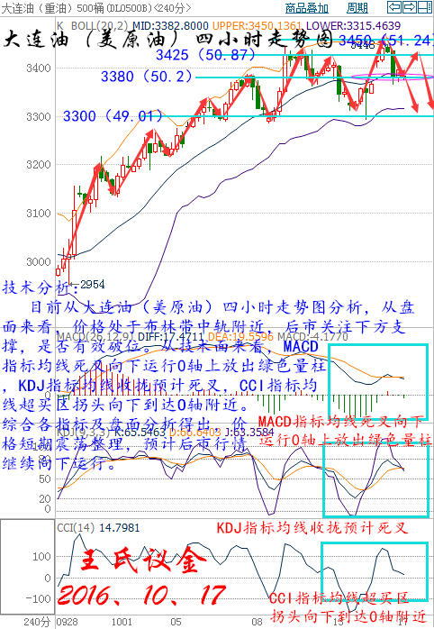 王氏寄語: 要么讀書、要么旅行,靈魂和身體,必須有一個在路上,人生至少要有兩次沖動,一為奮不顧身的愛情,一為說走就走的旅行。如果不出去走走,就會誤以為這就是世界,很多事情就像是旅行一樣,當做出決定并邁出第一步的時候,最困難的那部分其實就已經完成了,而此時我已向著未知的領域邁開了一步,只待時間給予最真實的回饋。 上周五收盤: 美國WTI原油11月期貨周五(10月14日)收跌0.09美元,或0.18%,報50.35美元/桶,本周上漲1.04%。布倫特原油12月期貨周五收跌0.08美元,或0.15%,報51.95美元/桶,本周微升0.08%。石油輸出國組織(OPEC)達成的限產協議幫助油價實現連續第四周反彈,但美國石油活躍鉆井數的再度增加令市場對頁巖油產量回升的擔憂愈加嚴重,同時OPEC和俄羅斯的原油產量也處高位,基本面狀況依然薄弱。美國WTI原油期貨價格盤中最低觸及49.90美元/桶,布倫特原油期貨價格盤中最高觸及51.51美元/桶。 基本面利好因素: 原油交易商周五(10月14日)表示,美國Permian油田運往庫欣地區的主要輸油管道依然處于關閉狀態,這導致45萬桶/日的原油運輸遭受影響。此次受到影響的是Permian油田對外最大的輸油管道,該消息導致美國原油期貨即期合約和次月合約價差縮窄,交易員預期一周內庫欣地區庫存至少將因此下降近200萬桶。 美國能源信息署(EIA)公布數據顯示,截至10月7日當周,美國汽油庫存減少190萬桶,市場預估為減少150萬桶。EIA汽油庫存結束連續兩周的增加趨勢,創下9月16日當周以來最大降幅。同時美國精煉油庫存減少370萬桶,市場預估為減少160萬桶,降幅為1月22日當周以來最大。美國原油交割地庫欣庫存減少130萬桶,為6月3日當周以來最大降幅。 中國海關數據顯示,9月份原油進口量同比上漲18%至3306萬噸,或804萬桶/日。中國的購買量超越了美國能源署(EIA)評估的美國截至9月末的四周均值798萬桶/日。這是本年度第二次,也是過去12個月中的第三個月,中國超越了美國。 OPEC成員國在阿爾及爾達成凍產協議以限制原油供應,為8年以來首次達成凍產協議。OPEC同意將石油產量限制在3250-3300萬桶/日區間。一位消息人士稱,一旦該組織達到其目標,OPEC將向非OPEC產油國尋求支持。此外,OPEC將在11月的下次正式會議上對各成員國的具體產量水準達成協議。 基本面利空因素: 美聯儲主席耶倫北京時間周六凌晨表示,要使經濟從危機中完全復蘇,可能需要“高壓”政策。危機壓制了產出,令工人失業并可能成為永久的傷害。這進一步暗示美聯儲傾向于在一段時間內讓通脹繼續回升。耶倫講話之前,市場普遍預計其講話將加強年底加息預期,但其日內的講話意外不及預期鷹派,美元指數先抑后揚。美元指數一度跌至97.76,隨后反彈向98關口。美元走強令油價承壓。 美國油服公司貝克休斯(Baker Hughes)公布數據顯示,截至2016年10月14日當周美國石油活躍鉆井數增加4座至432座,16周來第15周錄得增加,為2014年油價開始暴跌以來最長周期。美國石油和天然氣活躍鉆井總數增加15座至539座,較去年同期減少248座。 美國能源信息署(EIA)公布數據顯示,截至10月7日當周,美國原油庫存增加490萬桶,市場預估為增加65萬桶,為六周以來首次增加,且增幅為4月8日當周以來最大。此外,煉廠產能利用率下降2.8個百分點,日煉油量減少48萬桶。 美國能源信息署(EIA)周四(10月13日)發布短期月度能源展望報告稱,預計2017年美國原油日均產量將減少14萬桶,至859萬桶。之前預計為按年減少26萬桶。報告暗示全球供需將在2017年第三季開始恢復平衡。同時EIA將2016年美國原油日需求增長預估從之前的20萬桶下調至7萬桶。預計2017年美國原油日需求增長23萬桶,之前的預估為增長14萬桶。 OPEC月報顯示,9月OPEC原油產量上升22萬桶/日至3339萬桶/日,8月修正為3317.4萬桶。預計2016年非OPEC原油供應量下降68萬桶/日,但2017年將上升24萬桶/日。預計2017年全球原油供應過剩將從76萬桶增至為80萬桶/日。 現貨原油技術分析及操作建議: 技術分析: 目前從大連油(美原油)四小時走勢圖分析,從盤面來看,價格處于布林帶中軌附近,后市關注下方支撐,是否有效破位。從技術面來看,MACD指標均線死叉向下運行0軸上放出綠色量柱,KDJ指標均線收攏預計死叉,CCI指標均線超買區拐頭向下到達O軸附近。綜合各指標及盤面分析得出,價格短期震蕩整理,預計后市行情繼續向下運行。 大連油操作建議: 今日大連油整體趨勢以逢高做空為主,以低多為輔。 日內阻力 :3410/3450 日內支撐 :3340/3300 激進者空單3370~3380區間內可以考慮擇機入場做空,止損3410上方,目標3340/3300。 穩健者空單3410~3420區間內可以考慮擇機入場做空,止損3450上方,目標3370/3340。 激進者多單3370~3380區間內可以考慮擇機入場做多,止損3340下方,目標3410/3450。 穩健者多單3340~3330區間內可以考慮擇機入場做多,止損3300下方,目標3370/3400。 以上操作建議僅供參考、投資有風險、操作需謹慎。 【以上建議出自中匯天融分析部,以實盤操作建議為準】 美原油操作建議: 今日美原油整體趨勢以逢高做空為主,以低多為輔。 日內阻力 :50.65/51.24 日內支撐 :49.61/49.01 激進者空單50.05~50.2區間內可以考慮擇機入場做空,止損50.65上方,目標49.61/49.01。 穩健者空單50.65~50.79區間內可以考慮擇機入場做空,止損51.24上方,目標50.05/49.61。 激進者多單50.05~50.2區間內可以考慮擇機入場做多,止損49.61下方,目標50.65/51.24。 穩健者多單49.61