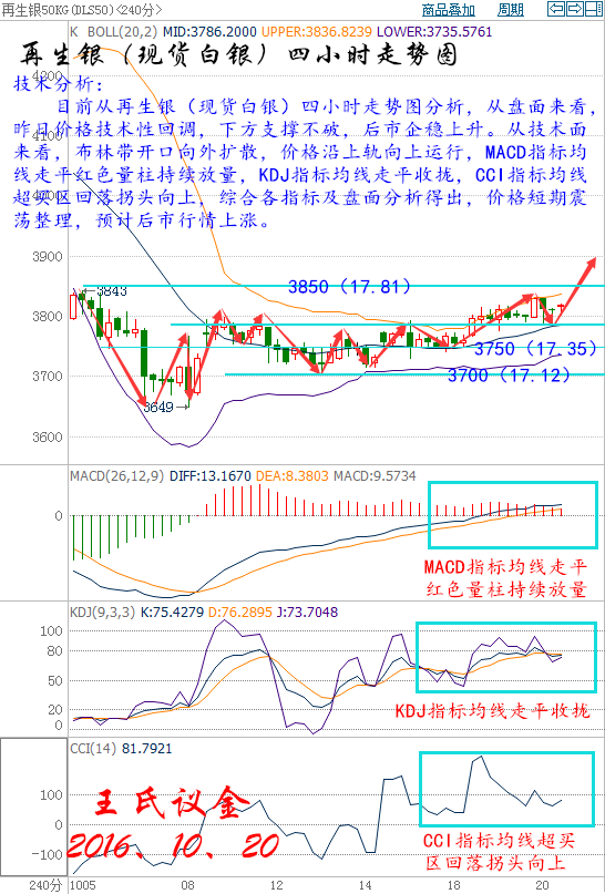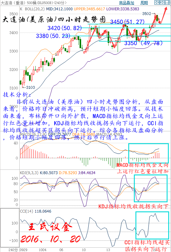 王氏寄語: 金錢決定旅行的長度,眼界決定旅行的寬度,心靈決定旅行的深度,而你能否在此期間獲利卻決定著我旅游的感受。其實,我們錯過的不是相遇而是錯過,不要輕易的結束一段旅行,因為生活總是要再啟程。 昨日收盤: 美國WTI原油11月期貨周三(10月19日)收漲1.31美元,或2.60%,報51.60美元/桶。布倫特原油12月期貨周三收漲0.99美元,或1.92%,報52.67美元/桶。美國原油庫存大降令多頭歡欣鼓舞,同時中國原油產量的持續下滑也為油價提供了一定支撐,但汽油庫存創2月來最大增幅令庫存報告存在一定利空因素。美國WTI原油期貨價格盤中最高觸及51.94美元/桶,布倫特原油期貨價格盤中最高觸及53.13美元/桶。 基本面利好因素: 美國能源信息署(EIA)公布數據顯示,截至10月14日當周,美國原油庫存減少524.7萬桶,至4.687億桶,市場預估為增加270萬桶。美國精煉油庫存減少120萬桶,連續四周錄得下滑,市場預估為減少155.0萬桶。美國原油交割地庫欣庫存減少163.5萬桶,降幅為4月8日當周以來最大,前值為減少131.8萬桶。此外,上周美國原油日進口量減少91.2萬桶。 周三公布的美國9月新屋開工總數錄得2015年3月以來最低水平,表明住房施工可能會拖累美國三季度經濟增長。美元指數日內變動不大,因投資者持續評估美聯儲12月加息的可能性且逢高獲利了結,前兩個交易日小幅下滑。美元漲勢受阻為油價提供了有效支撐。 中國國家統計局周三(10月19日)數據顯示,9月國內原油產量降至1598萬噸,或389萬桶/日,日計算量接近六年最低,反映出油田支出下降及關閉舊油井的影響正在發酵。同時9月中國原油產量較上年同期下降9.8%,創紀錄第二大同比降幅。中國為全球前五大產油國,中國原油產量大跌,是中國油企持續致力提高效率,或 成為幫助全球油市恢復平衡的最新跡象。 OPEC成員國在阿爾及爾達成凍產協議以限制原油供應,為8年以來首次達成凍產協議。OPEC同意將石油產量限制在3250-3300萬桶/日區間。一位消息人士稱,一旦該組織達到其目標,OPEC將向非OPEC產油國尋求支持。此外,OPEC將在11月的下次正式會議上對各成員國的具體產量水準達成協議。 國際能源署(IEA)月報稱,若石油輸出國組織(OPEC)和俄羅斯達成協議的減產幅度夠大,則全球油市可能加速恢復供需平衡,但在更多細節浮現之前,尚不清楚這個速度有多快。IEA在8月報告中稱,預計明年全球石油日需求增長120萬桶,與上月預估一致,但將2016年增幅預估從130萬桶下調至約120萬桶。 現貨原油技術分析及操作建議———— 技術分析: 目前從大連油(美原油)四小時走勢圖分析,從盤面來看,價格昨日沖破新高,預計短期小幅度回落。從技術面來看,布林帶開口向外擴散,MACD指標均線金叉向上運行紅色量柱增加,KDJ指標均線收攏拐頭向下運行,CCI指標均線收攏超買區拐頭向下運行。綜合各指標及盤面分析,價格短期小幅度回落,預計后市行情上漲。 大連油操作建議: 今日大連油整體趨勢以逢低做多為主,以高空為輔。 日內阻力 :3500/3540 日內支撐 :3420/3380 激進者空單3470~3460區間內可以考慮擇機入場做空,止損3500上方,目標3420/3380。 穩健者空單3510~3500區間內可以考慮擇機入場做空,止損3540上方,目標3470/3420。 激進者多單3450~3440區間內可以考慮擇機入場做多,止損3410下方,目標3480/3520。 穩健者多單3380~3390區間內可以考慮擇機入場做多,止損3350下方,目標3420/3450。 以上操作建議僅供參考、投資有風險、操作需謹慎。 【以上建議出自中匯天融分析部,以實盤操作建議為準】 美原油操作建議: 今日美原油整體趨勢以逢低做多為主,以高空為輔。 日內阻力 :52.01/52.61 日內支撐 :50.82/50.23 激進者空單51.57~51.42區間內可以考慮擇機入場做空,止損52.01上方,目標50.82/50.23。 穩健者空單52.16~52.01區間內可以考慮擇機入場做空,止損52.61上方,目標51.57/50.82。 激進者多單51.27~51.12區間內可以考慮擇機入場做多,止損50.68下方,目標51.72/52.31。 穩健者多單50.23~50.39區間內可以考慮擇機入場做多,止損49.78下方,目標50.82/51.27。 以上操作建議僅供參考、投資有風險、操作需謹慎。 【以上建議出自中匯天融分析部,以實盤操作建議為準】 瀝青方面操作指導: 瀝青屬原油衍生品,行情走勢分析與原油走勢相同,因平臺不同點位各異,有做瀝青需要指導的朋友可以聯系本人。 華益金安天然氣技術分析及操作建議------- 技術分析: 天然氣從日線指標來看,日內下方還有回撤的需求,建議日內高空為主。從4小時周期圖來看,K線的幸福之門形態已經形成,從指標上看,K線受上方均線壓制,MACD綠色動能持續放量,KDJ三線下方運行,綜合各策略思路,日內建議高空為主的思路,整體趨勢還是多頭,關注上方5430一線的壓力,下方關注5280支撐,重點關注晚間天然氣EIA數據。 華益天然氣操作上建議: 激進者建議5430-5440區間內可以考慮做空,止損40個點,目標5340/5310。 穩健者建議5280-5300區間內可以考慮做多,止損40個點,目標5380/5400。 以上操作建議僅供參考、投資有風險、操作需謹慎。 【以上建議出自中匯天融分析部,以實盤操作建議為準】 現貨白銀技術分析及操作建議-------- 技術分析: 目前從再生銀(現貨白銀)四小時走勢圖分析,從盤面來看,昨日價格技術性回調,下方支撐不破,后市企穩上升。從技術面來看,布林帶開口向外擴散,價格沿上軌向上運行,MACD指標均線走平紅色量柱持續放量,KDJ指標均線走平收攏,CCI指標均線