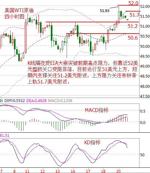 金盤神手:10.20晚評原油瀝青行情走勢分析晚間天然氣EIA做單指導(dǎo) 原油市場行情 周四(10月20日)原油價格溫和回撤,但上行趨勢不變,且消息面利多不斷,原油價格上行動能較足,分析師預(yù)計,晚間原油價格將漲破52美元阻力位。此外,歐銀決議即將公布,市場預(yù)計將送上大禮包。 截至北京時間14:56,原油價格震蕩下行0.33美元,下跌幅度達0.64%,報51.27美元/桶。上方關(guān)注52阻力位,若破位上行將看向53美元。 技術(shù)面分析 美國WTI原油從四小時走勢圖來看,K線隔夜受EIA大漲突破前期高點阻力,但靠近52美元整數(shù)關(guān)口受阻回落,目前運行至51美元上方,短期內(nèi)可關(guān)注51.2美元支撐,日內(nèi)關(guān)注50.6美元位置,上方阻力關(guān)注布林帶上軌51.7美元附近。 從指標來看,布林帶通道大幅度開口,附圖MACD指標快慢線在零軸上方有拐頭跡象,紅色動能柱縮量;KD指標形成死叉向下運行。 綜合來看,大漲之后油價目前有回落需求,但大趨勢下仍看多,首先關(guān)注51.2美元附近支撐。操作上建議回落做多為主。 金盤神手獨家策略:回落做多 美原油操作建議 1、回落51.1美元多單進場,止損0.4,目標52.2 2、52.8美元附近空單進,止損0.3,目標52.0 3、意外下破50.8美元,反彈51.0,美元空單進,止損0.3,目標50.0 瀝青方面:瀝青隸屬原油衍生品,行情走勢與原油走勢相同,平臺不同,點位各異,大家自行把握進出點位,如有不懂私下請教本人。 青商瀝青部分參考策略 1、2422附近多單進場,止損25點,目標2462 2、2460附近空單進場,止損25點,目標2420 天然氣行情技術(shù)分析 天然氣回顧昨日行情,昨日早盤天然氣小幅低開,亞盤初市,行情先來一波大跌,亞盤后市行情以小幅震蕩為主, 隨著歐盤的開盤,天然氣開啟了暴跌模式,歐盤至美盤行情一度跌至日內(nèi)最低點7250,后市行情小幅反彈,最終收盤于7333。 今日盤面技術(shù)分析,從日線圖看,天然氣近日連續(xù)暴跌,一改往日多頭之勢,近期空頭力量較為強勢,昨日行情一舉跌破10日均線的止損。5日均線與10日均線有死叉形成之勢,昨日收盤獲得一根大陰柱,經(jīng)過昨日的一波暴跌,下方空間已經(jīng)被有效打開,故今日做單思路我們?nèi)匀皇菆猿址磸椄呖諡橹鳌?/span> 青商天然氣操作建議 1、7280附近多單進場,止損45個點,目標7350 2、7360附近空單進場,止損40個點,目標7285 晚間重點關(guān)注 19:45 歐洲央行宣布利率決議 20:30 歐洲央行行長德拉基召開新聞發(fā)布會、紐約聯(lián)儲主席杜德利發(fā)表講話 20:30 美國至10月15日當(dāng)周初請失業(yè)金人數(shù)、美國10月費城聯(lián)儲制造業(yè)指數(shù) 22:00 美國9月諮商會領(lǐng)先指標月率、美國9月成屋銷售總數(shù)年化 22:30 美國至10月14日當(dāng)周EIA天然氣庫存