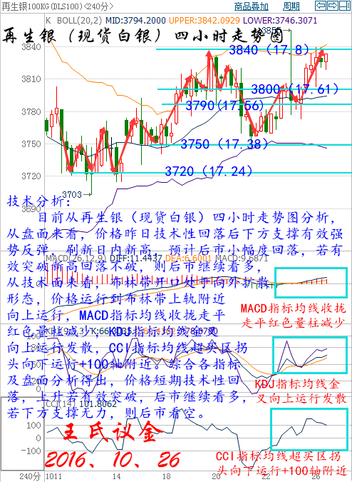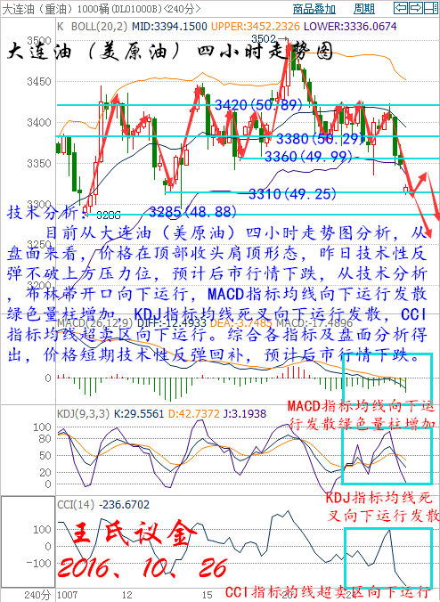 王氏議金:10、26原油、白銀及天然氣分析動(dòng)產(chǎn)不明油價(jià)50美元高危。 王氏寄語: 有一種孤獨(dú),不是做一些事沒有人陪伴,而是做一些事沒有人理解。不要在意別人在背后怎么看怎么說,因?yàn)檫@些言語改變不了事實(shí),卻可能攪亂心。心如果亂了,一切就都亂了。理解的人,不需要解釋,不理解的人,不配解釋。如果存在只是僅僅為了取悅,那么本身就已錯(cuò)的離譜! 昨日收盤: 美國WTI原油12月期貨周二(10月25日)收跌0.56美元,或1.11%,報(bào)49.96美元/桶。布倫特原油12月期貨周二收跌0.67美元,或1.30%,報(bào)50.79美元/桶。美元保持強(qiáng)勢(shì)令油價(jià)承壓下挫,雖然近期石油輸出國組織(OPEC)各主要成員國紛紛發(fā)聲支持限產(chǎn),但內(nèi)部利益分歧依然較大,這為11月的政策會(huì)議埋下隱患。美國WTI原油期貨價(jià)格盤中最低觸及49.73美元/桶,布倫特原油期貨價(jià)格盤中最低觸及50.55美元/桶。 基本面利好因素: 能源情報(bào)監(jiān)測機(jī)構(gòu)Genscape最新數(shù)據(jù)顯示,截至10月21日一周,美國原油主要交割地庫欣地區(qū)庫存減少約100萬桶。 美國能源信息署(EIA)公布數(shù)據(jù)顯示,截至10月14日當(dāng)周,美國原油庫存減少524.7萬桶,至4.687億桶,市場預(yù)估為增加270萬桶。美國精煉油庫存減少120萬桶,連續(xù)四周錄得下滑,市場預(yù)估為減少155.0萬桶。美國原油交割地庫欣庫存減少163.5萬桶,降幅為4月8日當(dāng)周以來最大,前值為減少131.8萬桶。此外,上周美國原油日進(jìn)口量減少91.2萬桶。 中國國家統(tǒng)計(jì)局周三(10月19日)數(shù)據(jù)顯示,9月國內(nèi)原油產(chǎn)量降至1598萬噸,或389萬桶/日,日計(jì)算量接近六年最低,反映出油田支出下降及關(guān)閉舊油井的影響正在發(fā)酵。同時(shí)9月中國原油產(chǎn)量較上年同期下降9.8%,創(chuàng)紀(jì)錄第二大同比降幅。中國為全球前五大產(chǎn)油國,中國原油產(chǎn)量大跌,是中國油企持續(xù)致力提高效率,或 成為幫助全球油市恢復(fù)平衡的最新跡象。 基本面利空因素: 在美聯(lián)儲(chǔ)加息預(yù)期不斷升溫的情況下,美元指數(shù)漲勢(shì)愈演愈烈,多頭在連攻數(shù)日之后終于如愿站上99大關(guān)。美國8月標(biāo)普/CASE-SHILLER 20個(gè)大城市房價(jià)指數(shù)表現(xiàn)靚麗,成為美元多頭爆發(fā)的直接導(dǎo)火索。近期以來,美國零售銷售、消費(fèi)者物價(jià)指數(shù)、工業(yè)產(chǎn)出,以及就業(yè)方面的經(jīng)濟(jì)數(shù)據(jù)表現(xiàn)靚麗,今天晚間的房價(jià)無疑印證了美國當(dāng)前經(jīng)濟(jì)的良好表現(xiàn)。這也進(jìn)一步提振了美聯(lián)儲(chǔ)年內(nèi)升息的預(yù)期。美元走強(qiáng)令油價(jià)承壓。 伊拉克石油部長盧艾比(Jabar Ali al-Luaibi)上周日(10月23日)表示,伊拉克應(yīng)得到石油輸出國組織(OPEC)原油限產(chǎn)協(xié)議的豁免,因該國需要收入來打伊斯蘭國戰(zhàn)爭。他認(rèn)為伊拉克作為OPEC的第二大產(chǎn)油國,應(yīng)與尼日利亞和利比亞一樣得到豁免,這引起了市場對(duì)限產(chǎn)協(xié)議的執(zhí)行力度表示懷疑。 美國油服公司貝克休斯(Baker Hughes)公布數(shù)據(jù)顯示,截至2016年10月21日當(dāng)周美國石油活躍鉆井?dāng)?shù)增加11座至443座,為連續(xù)第8周增加,且已經(jīng)連續(xù)17周未錄得減少。美國石油和天然氣活躍鉆井總數(shù)增加14座至553座,較去年同期減少234座。 據(jù)伊朗通訊社報(bào)道,伊朗石油部長稱,新簽訂的合約將幫助伊朗達(dá)到原油產(chǎn)量500萬桶/日的目標(biāo)。今日早些時(shí)候,伊朗表示,計(jì)劃在今年將原油產(chǎn)量增至400萬桶/日,以期能協(xié)同OPEC在11月達(dá)成產(chǎn)量協(xié)議,支撐國際油價(jià)。此外,尼日利亞油長Emmanuel Ibe Kachikwu預(yù)期稱,該國原油產(chǎn)量在12月底將增加22%,至220萬桶/日,而利比亞高級(jí)石油官員周二(10月18日)表示,利比亞Waha油田上周已經(jīng)恢復(fù)生產(chǎn),幫助該國原油產(chǎn)量達(dá)到58萬桶/日。 OPEC月報(bào)顯示,9月OPEC原油產(chǎn)量上升22萬桶/日至3339萬桶/日,8月修正為3317.4萬桶。預(yù)計(jì)2016年非OPEC原油供應(yīng)量下降68萬桶/日,但2017年將上升24萬桶/日。預(yù)計(jì)2017年全球原油供應(yīng)過剩將從76萬桶增至為80萬桶/日。 現(xiàn)貨原油技術(shù)分析及操作建議———— 技術(shù)分析: 目前從大連油(美原油)四小時(shí)走勢(shì)圖分析,從盤面來看,價(jià)格在頂部收頭肩頂形態(tài),昨日技術(shù)性反彈不破上方壓力位,預(yù)計(jì)后市行情下跌,從技術(shù)分析,布林帶開口向下運(yùn)行,MACD指標(biāo)均線向下運(yùn)行發(fā)散綠色量柱增加,KDJ指標(biāo)均線死叉向下運(yùn)行發(fā)散,CCI指標(biāo)均線超賣區(qū)向下運(yùn)行。綜合各指標(biāo)及盤面分析得出,價(jià)格短期技術(shù)性反彈回補(bǔ),預(yù)計(jì)后市行情下跌。 操作建議: 今日大連油整體趨勢(shì)以逢高做空為主,以低多為輔。 日內(nèi)阻力 :3360/3420 日內(nèi)支撐 :3310/3280 激進(jìn)者空單3340~3350區(qū)間內(nèi)可以考慮擇機(jī)入場做空,止損3380上方,目標(biāo)3300/3280。 穩(wěn)健者空單3380~3370區(qū)間內(nèi)可以考慮擇機(jī)入場做空,止損3410上方,目標(biāo)3340/3300。 激進(jìn)者多單3310~3300區(qū)間內(nèi)可以考慮擇機(jī)入場做多,止損