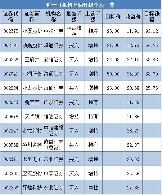 近十日機(jī)構(gòu)上調(diào)了12只個(gè)股評(píng)級(jí)。在已公布目標(biāo)價(jià)格的個(gè)股中,3只目標(biāo)漲幅超過(guò)50%,亞廈股份目標(biāo)漲幅最大,預(yù)計(jì)有高達(dá)93.12%的上漲空間,其次,勁嘉股份目標(biāo)漲幅為64.96%。詳細(xì)如下表所示。 ![]() 看過(guò)上表,黃金之家小編再來(lái)給大家普及一下股票小知識(shí)哦: 開盤價(jià):指每天成交中最先的一筆成交的價(jià)格。 收盤價(jià):指每天成交中最后的一筆股票的價(jià)格,也就是收盤價(jià)格。 成交數(shù)量:指當(dāng)天成交的股票數(shù)量。 最高價(jià):指當(dāng)天股票成交的各種不同價(jià)格是最高的成交價(jià)格。 最低價(jià):指當(dāng)天成交的不同價(jià)格中最低成交價(jià)格。 整理:是指股價(jià)經(jīng)過(guò)一段急劇上漲或下跌后,開始小幅度波動(dòng),進(jìn)入穩(wěn)定變動(dòng)階段,這種現(xiàn)象稱為整理,整理是下一次大變動(dòng)的準(zhǔn)備階段。 跳空:指受強(qiáng)烈利多或利空消息刺激,股價(jià)開始大幅度跳動(dòng)。跳空通常在股價(jià)大變動(dòng)的開始或結(jié)束前出現(xiàn)。 反彈:是指在下跌的行情中,股價(jià)有時(shí)由于下跌速度太快,受到買方支撐面暫時(shí)回升的現(xiàn)象。反彈幅度較下跌幅度小,反彈后恢復(fù)下跌趨勢(shì)。 多頭:對(duì)股票后市看好,先行買進(jìn)股票,等股價(jià)漲至某個(gè)價(jià)位,賣出股票賺取差價(jià)的人。 空頭:是指變?yōu)楣蓛r(jià)已上漲到了最高點(diǎn),很快便會(huì)下跌,或當(dāng)股票已開始下跌時(shí),變?yōu)檫會(huì)繼續(xù)下跌。 信息均來(lái)源互聯(lián)網(wǎng),不代表黃金之家觀點(diǎn)立場(chǎng),若侵權(quán)請(qǐng)聯(lián)系本站編輯。 |