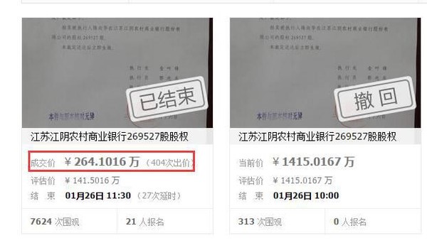 如果一家公司上市,這家公司的股東的財富就會瞬間膨脹數倍、數十倍甚至上百倍。所以,上市前的原始股都是稀缺資源,公眾很難獲得。也因此,即將上市的股票才那么受追捧。當然了,凡事皆有例外,這不,在淘寶上,就有為數不少的準IPO公司的股權拍賣活動,而且這些股權還是以暴利著稱的銀行股權。 據證監會1月29日公告顯示,江蘇江陰農村商業銀行、江蘇張家港農村商業銀行、江蘇常熟農村商業銀行、江蘇吳江農村商業銀行、江蘇銀行、上海銀行等多家銀行正在排隊等待IPO。 ![]() 就目前的審核狀態看,有不少銀行是“已通過發審會”的。但是,有些銀行的股權卻出現在了淘寶的拍賣平臺,來源是“司法拍賣”。 比如江蘇江陰農村商業銀行(以下簡稱江陰農商行),該行有26.9527萬股于2016年1月26日出現在淘寶拍賣會上,起拍價為141.5萬元,與評估價相同,相當于5.25元/股,最終成交價為264.1萬元,約9.84元/股,較評估價有87.43%的上浮。 ![]() 從上述拍賣的公開信息來看,該次拍賣被執行人為江陰農商行股東陳向華。江陰農商行2015年12月21日更新的招股說明書中顯示,陳向華只持有26.9527萬股的江陰農商行股票,占比0.02%,為眾多自然人股東中的一員,如今其所持股權已被全部拍賣。 實際上,截至2015年12月8日,江陰農商行被凍結的股份還不在少數,除陳向華外,還有高玲娟、蔣小華等其他6位股東,凍結股份數最多的為211.05萬股,最少的也有6.01萬股,其余被凍結的股份何時執行司法拍賣,尚難確定。 江陰農商行外,常熟農商行、江蘇銀行、江蘇吳江農商行等銀行的股權也有被拍賣的記錄。由此可見,銀行跌落神壇,對想要淘到原始股的股民們來說,不可不謂一次良機。 信息均來源互聯網,不代表黃金之家觀點立場,若侵權請聯系本站編輯。 |