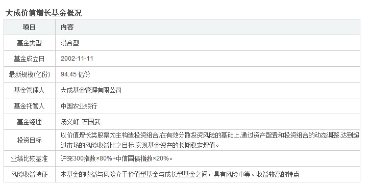大成價值成長基金以價值增長類股票為主構造投資組合,在有效分散投資風險的基礎上,通過資產配置和投資組合的動態調整,達到超過市場的風險收益比之目標,實現基金資產的長期穩定增值。下面小編將為大家詳細的講解這款基金的詳情,希望對大家有所幫助哦! 一、大成價值成長基金簡介詳細基金內容見下表: