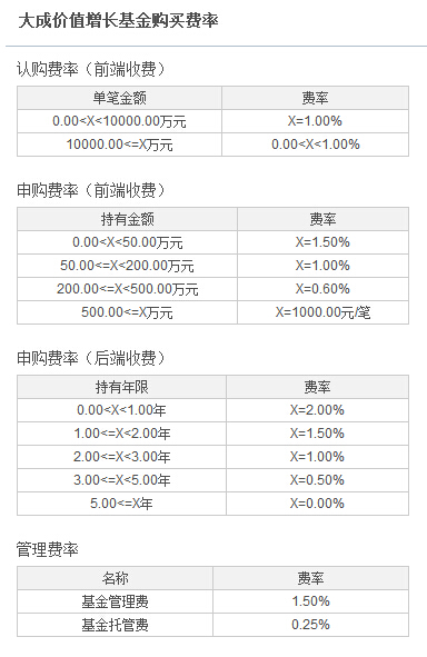 本基金在三個層次上均采取積極的投資策略:資產配置和行業配置遵循自上而下的積極策略,個股選擇遵循自下而上的積極策略。 本基金的股票投資部分重點關注:低P/B值、具有可持續增長潛力、盈利水平超過行業平均水平、具有核心競爭力的優勢企業,股票投資比例變動范圍為基金資產的45%-75%;國債投資比例將不低于20%,債券投資比例變動范圍是基金資產的20%-40%;現金資產比例的變動范圍是基金資產的5%-15%。 四、大成價值成長基金購買費率表下表將為你一一列出大成價值成長基金認購費率、申購費率、管理費率的收取原則: