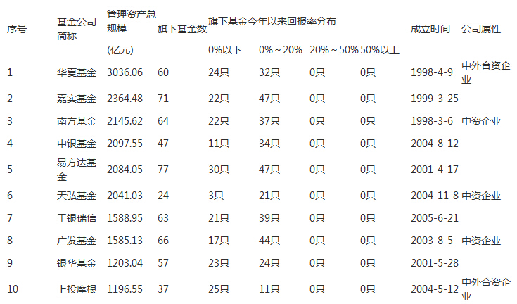2014年離結(jié)束還有不到一百天的時(shí)間,不知道兢兢業(yè)業(yè)理財(cái)?shù)耐瑢W(xué)們收獲多少?基金是今年的熱點(diǎn),網(wǎng)絡(luò)上關(guān)于基金公司的排名也有很多,可是面對(duì)如此多的基金公司,哪一家才是最好的基金公司呢?我們又該如何選擇基金公司呢? 一、2014年基金公司排名進(jìn)行基金購(gòu)買(mǎi)的投資者對(duì)于每一季度的基金公司排名都能順手拈來(lái),下面就一起來(lái)看看,你投的基金在不在這個(gè)最新出爐的基金公司排名里面咯: