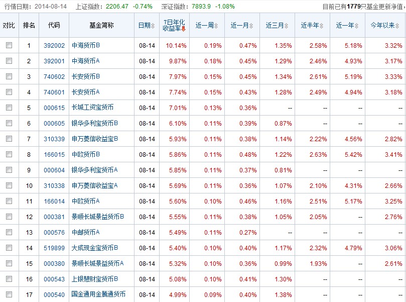 想必大家對貨幣基金并不陌生,為什么這樣說呢?大家都知道余額寶微信理財通可以理財獲得收益。但是很多人不清楚為什么我們可以通過他們獲得收益呢,主要原因就是余額寶微信理財連接的就是與他們合作的貨幣基金,也就是我們將錢轉入余額寶微信理財里面,就等于購買了他們合作基金公司的貨幣基金,從而能獲取收益。今天我們就一起來了解近期貨幣基金收益排行榜和貨幣基金投資知識。 一、近期貨幣基金收益排行榜