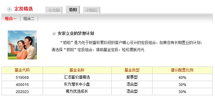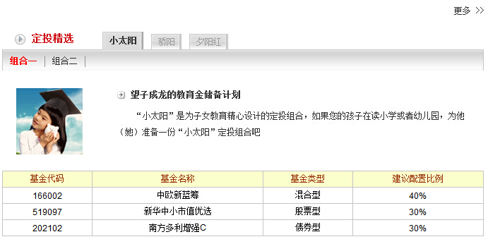 (天津郵政儲蓄銀行) 一、郵政儲蓄銀行基金介紹1、望子成龍的教育金儲備計劃 “小太陽”是為子女教育精心設計的定投組合,如果您的孩子在讀小學或者幼兒園,為他(她)準備一份“小太陽”定投組合吧。 2、安家立業的夢想計劃 “驕陽”是為處于財富積累階段的客戶精心設計的定投組合,如果您有長期置業的計劃,請選擇“驕陽”定投組合,借助基金定投,輕松擺脫月光 。 3、樂享晚年的輕松養老計劃 “夕陽紅”是為準備健康養老的客戶精心設計的定投組合,在為退休做計劃嗎,請選擇“夕陽紅”吧。