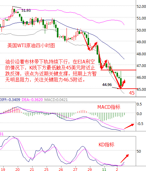 基本面分析: 周三(11月2日)美國WTI原油12月期貨收跌1.33美元,或2.85%,報45.34美元/桶,盤中最低觸及44.98美元/桶。布倫特原油1月期貨收跌1.28美元,或2.66%,報46.86美元/桶,盤中最低觸及46.48美元/桶。EIA原油庫存創歷史最高記錄,重挫油價,盤中一度重挫逾3%,不過尾盤時段小幅反彈收復部分跌幅。 美國能源信息署(EIA)周三(10月2日)公布數據顯示,美國10月28日當周EIA原油庫存大增1442萬桶,汽油庫存減少220.7萬桶,精煉油庫存減少182.8萬桶。其中原油庫存錄得34年來數據編制以來最高水平。 美聯儲維持聯邦基金利率目標在0.25-0.50%不變,并表示升息的理據“持續增強”。這表明,美聯儲在12月中今年最后一次貨幣政策會議上加息的門檻看來已經很低了。盡管美聯儲會議聲明如此鷹派,但美元并沒有給出多大反應,持續在低位徘徊,低位震蕩的美元給油價提供了部分支撐。 ----------春雨聚金美原油技術分析與操作策略 原油的話近期的話不用說下跌肯定是大勢所趨,不管是凍產的前景不明,還是各主要產油國產量繼續增加。還是昨日的API和EIA的大超預期的利空,導致油價是一跌再跌。但是要值得關注的是昨天EIA數據出來后油價是出現了一波較大的反抽之后再狂跌的,并且沒有跌破45美元的支撐,到45美元附近觸底反彈。截止發文時間,油價已經反彈至EIA數據公布前的46美元附近。因為明天是大數據非農,油價是否能“咸魚翻身”成敗就在此一戰了。 原油技術面分析: 美國WTI原油從四小時走勢圖來看,油價沿著布林帶下軌持續下行,在EIA大幅利空的情況下,K線下方最低觸及45美元下方不得企穩,并止跌反彈,該點可作為近期關鍵支撐。短期內上方暫無明顯阻力,關鍵阻力關注46.5美元附近。 從指標來看,布林帶通道大幅向下運行,但下軌有所走緩;附圖MACD指標快線拐頭向上有上穿慢線形成金叉跡象,綠色動能柱縮量;KD指標超賣區形成金叉向上發散。 從指標來看,大跌之后的小幅反彈,所有指標均已開始向多頭趨勢發展,均顯示油價有反彈需求,不排除這是一次觸底反彈,操作上可以嘗試抄底,建議輕倉做多。反彈至阻力位附近可做空。 美原油操作建議: 策略1:45.3美元多單進場,盈利目標45.8美元止損0.2美元 策略2:46.2美元空單進場,盈利目標45.5美元止損0.2美元 白銀技術面分析: 現貨白銀從四小時走勢圖來看,走勢基本與黃金價格一致,上方同樣達成昨日晚間給出的18.7美元目標,下方回落至18.45美元附近反彈,形成支撐,上方18.7附近仍有小級別阻力,日內關鍵阻力看向18.8美元附近。 從指標來看,布林帶通道大幅開口向上,附圖KD指標在超買區形成死叉向下發散。綜合來看,預計白銀價格走勢與黃金價格一致。操作上建議回落做多為主。 白銀操作建議: 1、18.45美元附近做多,目標看向18.7美元上方,止損0.15美元。 2、18.65-18.7美元區間空,止損18.85,目標18.4和18.3美元 今日重點關注: 09:45 中國 10月財新服務業PMI 20:00 英國 11月央行基準利率(%) 20:30 美國 10月29日當周初請失業金數(萬) 20:30 美國 第三季非農生產力初值(%) 21:45 美國 10月Markit服務業PMI終值 22:00 美國 9月耐用品訂單月率終值(%) 22:00 美國 10月ISM非制造業PMI (以上文章由春雨聚金原創,轉載請注明出處。溫馨提示,投資有風險,入市需謹慎。以上僅代表春雨個人觀點,不作操作依據,據此操作風險自擔) 本文作者系CFP注冊理財規劃師,多年從事金融領域相關工作,對現貨大宗商品有豐富的實戰經驗。 |