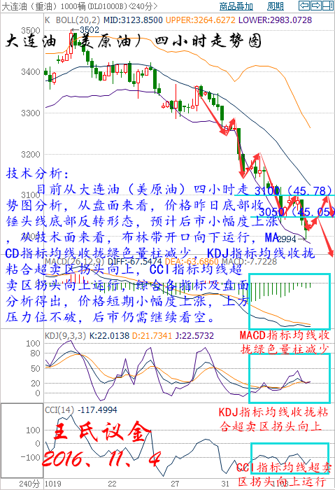王氏寄語: 未曾狂熱付出 嚎哭都應該羞愧,學會包容意見不同的人,很多時候,前途光明你看不見,道路曲折你走不完。生活中沒有參照物的人,可憐;選錯參照物的人,可悲。不愛的婚姻是不負責,不賺的投資是不明智,人生需要好的教練,自我的修煉是認清錯誤的自己,不斷朝著更真實和冷靜背后不一樣的自我。 昨日收盤: 美國WTI原油12月期貨周四(11月3日)收跌0.68美元,或1.50%,報44.66美元/桶。布倫特原油1月期貨周四收跌0.51美元,或1.09%,報46.35美元/桶。雖然尼日利亞輸油管道再遭武裝襲擊為油價提供了部分支撐,但投資者普遍對石油輸出國組織(OPEC)最終履行限產(chǎn)協(xié)議不抱太高期望,原油庫存的急升加重了市場的供應過剩擔憂,油價承壓延續(xù)跌勢。美國WTI原油期貨價格盤中最低觸及44.38美元/桶,布倫特原油期貨價格盤中最低觸及45.99美元/桶。 基本面利好因素: 雖然日內(nèi)出爐的一項最新民調顯示,希拉里重奪優(yōu)勢,由兩日之前的落后一個百分點轉而領先兩個百分點,結合昨日美聯(lián)儲的政策聲明提高了年底加息的可能,但由于日內(nèi)初請等數(shù)據(jù)表現(xiàn)不佳,美元未能延續(xù)之前漲勢。美元小幅回落為油價提供了部分支撐。 尼日利亞輸油管道近日再遭武裝襲擊,導致該國產(chǎn)量至少減少了20萬桶/日,這為油價提供了部分支撐。尼日利亞是非洲最大的產(chǎn)油國,近來數(shù)月原油產(chǎn)量飽受武裝襲擊的摧殘。 美國能源信息署(EIA)公布數(shù)據(jù)顯示,截至10月28日當周,美國汽油庫存減少220.7萬桶,連續(xù)兩周錄得下滑,創(chuàng)下9月16日當周以來最大降幅,市場預估為減少112.4萬桶。美國精煉油庫存減少182.8萬桶,為連續(xù)六周下滑,市場預估為減少189.6萬桶。 美國油服公司貝克休斯(Baker Hughes)周五(10月28日)公布數(shù)據(jù)顯示,截至2016年10月28日當周美國石油活躍鉆井數(shù)減少2座至441座,今年6月以來首次錄得減少。但美國石油和天然氣活躍鉆井總數(shù)依然增加4座至557座,較去年同期減少218座。 基本面利空因素: 美國能源信息署(EIA)周三(11月2日)公布的數(shù)據(jù)顯示,截至10月28日當周,美國原油庫存增加1442萬桶,為EIA開始統(tǒng)計庫存數(shù)據(jù)的34年來最大增幅,至4.8258億桶,這令之前美國石油學會(API)公布的930萬桶的增幅也黯然失色,市場預估為增加101.3萬桶。此前EIA原油庫存連續(xù)兩周錄得下滑。上周美國原油進口增加199萬桶/日,至859萬桶/日,創(chuàng)下2012年9月份以來最高。美國原油交割地庫欣庫存增加8.9萬桶,至5845萬桶,結束連續(xù)三周下滑勢頭,增幅為9月30日當周以來最大。此外,上周美國國內(nèi)原油產(chǎn)量增加1.8萬桶至852.2萬桶/日,連續(xù)三周增長。 俄羅斯能源部周三(11月2日)公布數(shù)據(jù)顯示,俄羅斯10月原油產(chǎn)量較9月增加0.1%至1120萬桶/日,連續(xù)兩個月刷新后蘇聯(lián)時期紀錄高位。俄羅斯10月原油產(chǎn)量為4700萬噸,較去年同期急升3.9%。該國2017年日均原油產(chǎn)量料達到1100萬桶/日,或5.48億桶,因更多新油田投入生產(chǎn)。 EIA周一(10月31日)發(fā)布的數(shù)據(jù)顯示,美國8月原油產(chǎn)量為874.4萬桶/日,較7月增長了5.1萬桶/日,為今年3月以來首次實現(xiàn)增長。2015年4月,美國原油產(chǎn)出達到962.7萬桶/日,創(chuàng)歷史新高。盡管今年8月產(chǎn)量和當時相比仍然低了88.3萬桶/日,但最近兩年油價崩潰造成的美國原油產(chǎn)出下滑速度并不像很多分析師預期的那樣快。 路透調查顯示,10月份OPEC原油產(chǎn)量較9月份增加13萬桶/日,至3382萬桶/日,創(chuàng)紀錄新高,主要是受尼日利亞、利比亞和伊拉克的產(chǎn)量推動。而沙特10月產(chǎn)量從1055萬桶/日小幅下滑至1053萬桶/日。尼日利亞10月原油產(chǎn)量從9月的144萬桶/日急升至165萬桶/日;利比亞10月原油產(chǎn)量從9月的35萬桶/日增加至50萬桶/日;伊拉克10月原油產(chǎn)量則攀升至458萬桶/日,9月修正為452萬桶/日。 根據(jù)Clipperdata公司對OPEC今年1月迄今的原油出口量看追蹤統(tǒng)計顯示,之前OPEC年內(nèi)出口峰值為2700萬桶/日,而10月下半月開始突然發(fā)力,一路攀升至2900萬桶/日,其中貢獻最大的正是沙特,該國最新原油出口創(chuàng)下了840萬桶/日的紀錄新高,真正對原油供求產(chǎn)生影響的是各國的原油出口量而并非原油產(chǎn)量,這是因為各國的原油產(chǎn)量只有通過出口才能在國際市場上參與交易,對供應端產(chǎn)生影響,因此這一數(shù)據(jù)的走高引起了諸多投資者的擔憂。 現(xiàn)貨原油技術分析及操作建議———— 技術分析: 目前從大連油(美原油)四小時走勢圖分析,從盤面來看,價格昨日底部收錘頭線底部反轉形態(tài),預計后市小幅度上漲,從技術面來看,布林帶開口向下運行,MACD指標均線收攏綠色量柱減少,KDJ指標均線收攏粘合超賣區(qū)拐頭向上,CCI指標均線超賣區(qū)拐頭向上運行,綜合各指標及盤面分析得出,價格短期小幅度上漲,上方壓力位不破,后市仍需繼續(xù)看空。 大連油操作建議: 今日大連油整體趨勢以逢高做空為主,以低多為輔。 日內(nèi)阻力 :3050/3090 日內(nèi)支撐 :2990/2940 激進者空單3060~3050區(qū)間內(nèi)可以考慮擇機入場做空,止損3090上方,目標3010/2980。 穩(wěn)健者空單3090~3100區(qū)間內(nèi)可以考慮擇機入場做空,止損3130上方,目標3050/3010。 激進者多單3010~3020區(qū)間內(nèi