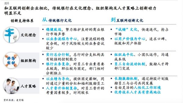 但對于大部分傳統(tǒng)銀行來說,“試錯”則顯得難以接受,銀行覺得自己不是互聯(lián)網(wǎng)公司也不是風(fēng)投,不可能將大量人力、財力及時間資源浪費在到處試錯上。缺乏對創(chuàng)新“失敗”的包容,也是銀行需要轉(zhuǎn)變的觀念。試錯并不是永無休止地投入。在嘗試顛覆式創(chuàng)新項目的一開始,就應(yīng)該明確項目運作資金額度和投入界限,資金耗盡若無產(chǎn)出,則可考慮及時止損。但若連“試投”的資源都認(rèn)為是浪費,那么顛覆式的、業(yè)內(nèi)引領(lǐng)的創(chuàng)新也就無從談起。 在試錯實操中,需要預(yù)先建立與顛覆式創(chuàng)新匹配的客觀評價標(biāo)準(zhǔn)。最明顯的矛盾是如何平衡短期業(yè)績和長期增長潛力。若某項創(chuàng)新服務(wù)的短期投入產(chǎn)出比其他業(yè)務(wù)低,那是不是就意味著是錯的? 銀行就應(yīng)該把這部分資源投入到當(dāng)下更賺錢的業(yè)務(wù)上?大部分銀行在這個問題上的回答曾經(jīng)都為“是”。正是理念上的差異,使得互聯(lián)網(wǎng)金融企業(yè)依靠這些銀行沒興趣提供服務(wù)的長尾客戶快速引爆市場,成為銀行傳統(tǒng)勢力范圍的強有力競爭者和分食者。 銀行也許已經(jīng)意識到,對于顛覆式創(chuàng)新的投入,是極其類似風(fēng)險投資的一門藝術(shù),秉持急功近利的思維是無法實現(xiàn)目標(biāo)的。什么樣的項目有可能真正實現(xiàn)顛覆、什么時候確認(rèn)一個項目不該試錯下去而是直接停止,需要的是領(lǐng)導(dǎo)層對行業(yè)發(fā)展的深刻洞見、極大的商業(yè)智慧以及堅定創(chuàng)新的決心。 二、內(nèi)部條線分割嚴(yán)重,跨部門協(xié)作的創(chuàng)新推動效率低下 與組織架構(gòu)扁平化的互聯(lián)網(wǎng)企業(yè)不同,銀行層級復(fù)雜,內(nèi)部牽制多,審批流程長。一個員工提出創(chuàng)新方案,即便與市場需求最為貼近,往往也需經(jīng)過各級領(lǐng)導(dǎo)層層審批,而涉及引領(lǐng)風(fēng)險等多個條線時,內(nèi)部審批流程則更加冗長而復(fù)雜。大量寶貴時間被用于各部門條線、各層級領(lǐng)導(dǎo)之間的協(xié)調(diào)、溝通與審核,創(chuàng)新效率受到很大制約。 另外,銀行各條線間分工細致,職責(zé)與利益交錯復(fù)雜,當(dāng)業(yè)務(wù)模式創(chuàng)新涉及多個業(yè)務(wù)條線時,協(xié)調(diào)、推動尤為困難。 如:有的銀行同業(yè)條線掌握著大量資產(chǎn)資源,但同業(yè)部門寧可全部做成同業(yè)資產(chǎn)交易,也不愿為本行零售線上理財提供具有競爭優(yōu)勢的標(biāo)的資產(chǎn);有的銀行以零售為起點推出數(shù)字銀行,卻首先與行內(nèi)的傳統(tǒng)零售發(fā)生沖突,互相爭奪客戶資源或封鎖信息、打價格戰(zhàn),最后兩敗俱傷;又有銀行沿著供應(yīng)鏈金融的思路,想為大型平臺企業(yè)上下游的小微和零售客戶服務(wù),但對接平臺企業(yè)的對公條線又不愿為小微和零售做配套服務(wù),無法形成合力及推動創(chuàng)新落地。 三、創(chuàng)新能力建設(shè)投入不足,缺乏相應(yīng)的人才、激勵機制和創(chuàng)新文化 數(shù)字化時代,金融產(chǎn)品的概念得到了極大延伸,端到端的銷售流程和客戶體驗都成為產(chǎn)品的有機組成部分。這就需要銀行有足夠的創(chuàng)新能力投入,尤其是IT和產(chǎn)品端具有敏捷開發(fā)團隊,以確保快速響應(yīng)市場需求。領(lǐng)先互聯(lián)網(wǎng)企業(yè)及數(shù)字化銀行的IT人員動輒投入上百人,IT隊伍占比往往達到總體人員的30%—50%。 現(xiàn)實中大多數(shù)銀行缺乏這樣的獨立團隊和快速開發(fā)機制,每當(dāng)業(yè)務(wù)部門提出新的開發(fā)需求,往往會被告知IT全年的開發(fā)計劃已經(jīng)排滿,無暇顧及基于快速響應(yīng)市場需求的應(yīng)急性開發(fā)任務(wù);而等到IT部門有精力著手開發(fā),卻早已過了最佳的市場切入時機,使創(chuàng)新變成了跟隨和模仿。 另一方面,銀行對于創(chuàng)新的激勵遠遠不夠。互聯(lián)網(wǎng)公司普遍采取激進的激勵模式和主人翁式的管理理念,即以持股權(quán)、期權(quán)或成果收益分成方式加大長效激勵力度,使員工更有熱情和積極性,投身于不確定性更大的顛覆式創(chuàng)新。 相比之下,銀行的傳統(tǒng)獎勵模式以一次性項目獎金為主,其象征意義往往大于實際激勵。更有甚者,若銀行員工提出的創(chuàng)意經(jīng)多次試錯后發(fā)現(xiàn)難以達到預(yù)想的結(jié)果,則會給予變相處罰(如取消績效獎、調(diào)整工作崗位等)。這不僅違背了顛覆式創(chuàng)新的本質(zhì),導(dǎo)致無人愿意承擔(dān)風(fēng)險、挑戰(zhàn)未知,更加阻礙了首創(chuàng)的顛覆式創(chuàng)新在銀行的誕生。 互聯(lián)網(wǎng)企業(yè)相比,銀行在理念、組織架構(gòu)、文化、人才方面的包袱拖慢了創(chuàng)新的步伐和進程。 過去十余年,尤其是2003-2013年這十年,中國銀行業(yè)經(jīng)歷了有史以來最輝煌的發(fā)展,得益于高速增長的外部經(jīng)濟環(huán)境,以及準(zhǔn)入管制、利差鎖定的優(yōu)厚政策環(huán)境,中國銀行業(yè)十年間資產(chǎn)規(guī)模增長近5倍,利潤飆升超過50倍,盈利水平遠超其他行業(yè),成為眾人艷羨的“金飯碗”行業(yè)之一。 近年來,銀行業(yè)利潤增速開始放緩,但一直享受著比外國同行