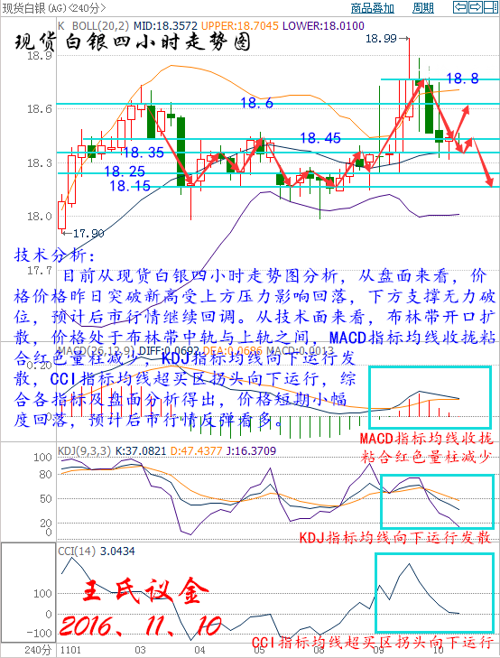 王氏議金:11、10原油、白銀多頭反敗為勝,特朗普萬萬沒想到 王氏寄語: 未曾狂熱付出 嚎哭都應該羞愧,學會包容意見不同的人,很多時候,前途光明你看不見,道路曲折你走不完。生活中沒有參照物的人,可憐;選錯參照物的人,可悲。不愛的婚姻是不負責,不賺的投資是不明智,人生需要好的教練,自我的修煉是認清錯誤的自己,不斷朝著更真實和冷靜背后不一樣的自我。 昨日收盤: 美國WTI原油12月期貨周三(11月9日)收漲0.29美元,或0.64%,報45.27美元/桶。布倫特原油1月期貨周三收漲0.32美元,或0.70%,報46.36美元/桶。美國大選終于稱埃落定,特朗普成為新一任美國總統,但目前關于未來施政方向的不確定性依然很高,風險類資產承受著較大壓力。但市場已經消化了特朗普獲勝帶來的沖擊,市場情緒穩定后油價開始回升。美國WTI原油期貨價格盤中最高觸及45.95美元/桶,布倫特原油期貨價格盤中最低觸及46.95美元/桶。 基本面利好因素: 市場在經歷了美國總統大選和美國原油庫存報告的雙重考驗后開始企穩。特朗普意外獲勝一度令包括原油在內的諸多資產承壓重挫,但隨著風險情緒的逐漸穩定,原油價格逐漸收復失地并暫時上漲。 美國能源信息署(EIA)公布數據顯示,截至11月4日當周,美國精煉油庫存減少194.8萬桶,市場預估為減少214.4萬桶,為連續第七周錄得減少。美國汽油庫存減少284.1萬桶,市場預估為減少102.5萬桶。此外,上周美國原油進口減少155.9萬桶/日,至744.2萬桶/日。而煉廠產能利用率上升1.9個百分點,至87.1%。 OPEC秘書長巴爾金都近日表示,該組織將履行9月達成的阿爾及爾減產協議。他補充道:“我們承諾將履行阿爾及爾會談達成的減產協議,所有的14個成員國都是如此。” OPEC成員國在阿爾及爾達成凍產協議以限制原油供應,為8年以來首次達成凍產協議。OPEC同意將石油產量限制在3250-3300萬桶/日區間。一位消息人士稱,一旦該組織達到其目標,OPEC將向非OPEC產油國尋求支持。此外,OPEC將在11月的下次正式會議上對各成員國的具體產量水準達成協議。 中國國家統計局近期數據顯示,9月國內原油產量降至1598萬噸,或389萬桶/日,日計算量接近六年最低,反映出油田支出下降及關閉舊油井的影響正在發酵。同時9月中國原油產量較上年同期下降9.8%,創紀錄第二大同比降幅。中國為全球前五大產油國,中國原油產量大跌,是中國油企持續致力提高效率,或 成為幫助全球油市恢復平衡的最新跡象。 基本面利空因素: 美國共和黨總統候選人特朗普意外當選,制造了繼英國脫歐公投之后的又一起“黑天鵝”事件,市場迎來了“腥風血雨般的洗禮”。短暫的“崩跌”過后,市場情緒開始回暖,雖然12月加息預期出現一定變數,但美元指數i依然強勢回升至98關口上方并創下一周高位,美元走強令油價反彈空間受限。 著特朗普最終贏得美國大選,石油輸出國組織(OPEC)計劃的限產行動面臨著更加艱巨的挑戰,在全球經濟形勢不確定性增加和原油需求疲軟的大環境下,OPEC想要推高油價就必須付出更多的努力。特朗普之前曾表示將重振美國原油行業,計劃批準更多聯邦屬地和水域的化石燃料開采項目,這有助于美國原油產量的進一步提升,從而增加了OPEC減產行動的困難性。 美國能源信息署(EIA)周三(11月9日)公布的數據顯示,截至11月4日當周,美國原油庫存增加243.2萬桶,4.85億桶,增幅0.5%,這小于之前美國石油學會(API)公布的440萬桶的增幅,市場預估為增加133萬桶。此前EIA原油庫存增幅創歷史紀錄新高。美國原油交割地庫欣庫存增加2.8萬桶,至5848萬桶,連續第二周小幅增加。此次EIA報告中最大的利空信息是美國原油產量,上周美國國內原油產量增加17萬桶至869.2萬桶/日,為2015年5月來最大增幅,觸及6個月來最高水平。 美國油服公司貝克休斯(Baker Hughes)周五(11月4日)公布數據顯示,截至2016年11月4日當周美國石油活躍鉆井數增加9座至450座,觸及2月份以來最高水平,過去23周內有20周錄得增加。截至11月4日當周美國石油和天然氣活躍鉆井總數增加12座至569座,較去年同期減少202座。 俄羅斯能源部數據顯示,俄羅斯10月原油產量較9月增加0.1%至1120萬桶/日,連續兩個月刷新后蘇聯時期紀錄高位。俄羅斯10月原油產量為4700萬噸,較去年同期急升3.9%。該國2017年日均原油產量料達到1100萬桶/日,或5.48億桶,因更多新油田投入生產。 現貨原油技術分析及操作建議———— 技術分析: 目前從美原油四小時走勢圖分析,從盤面來看,昨日價格深V形態受美國大選影響,下方支撐強勁有效,晚間EIA數據利空盤面只小幅度回落后企穩上漲,預計后市行情仍可以繼續看多。從技術面來看,布林帶開口有收攏跡象,價格處于布林帶中軌與上軌之間,MACD指標均線向上運行紅色量柱增加,KDJ指標均線收攏走平,CCI指標均線超買區拐頭向下運行,綜合各指標及盤面分析得出,價格短期小幅度回調,預計后市企穩上漲。 美原油操作建議: 今日美原油整體趨勢以逢低做多為主,以高空為輔。 日內阻力 :45.4/45.9 日內支撐 :44.5/43.9 建議油價觸及45.3美元空單,止損45.6美元,目標看44.5美元。 建議下方44.2美元多單,止損43.85美元,目標看45美元。 以上操作建議僅供參考、投資有風險、操作需謹慎。 【以上建議出自中匯天融分析部,以實盤操作建議為準】 現貨白銀技術分析———— 技術分析: 目前從現貨白銀四小時走勢圖分析,從盤面來看,價格價格昨日突破新高受上方壓
