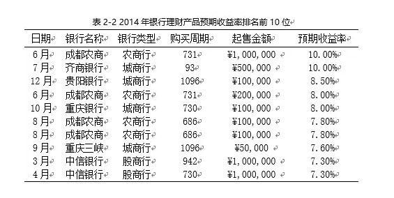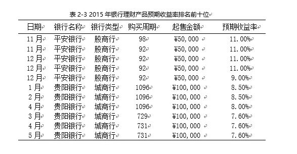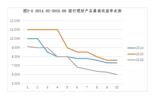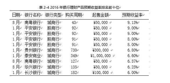 銀行業理財產品情況概述 2016年10月,人民幣正式入籃,初始權重10.92%,成為全世界僅次于美元及歐元的第三大儲備貨幣。這無疑是對國際外匯市場及國內金融市場的重大利好消息。然而,A股市場止步3000點難現輝煌,各類P2P公司迅速的崛起又倒下。在一場場金融風暴中,唯有銀行業理財市場獨善其身,呈現穩定且快速的發展態勢。 據統計,2015年,銀行業理財市場累計兌付客戶收益8,651.0億元。同時,相關銀行業金融機構實現理財業務收益約1,169.9億元。由于銀行理財產品實現了全流程的集中登記,因此,理財產品的透明度及得到的數據質量得到了明顯的提高。銀行理財產品的理財資金購買的資產大部分都是優質資產,風險較低,也是銀行理財產品成為越來越多用戶購買首選的重要原因。 2014年2月至2016年9月銀行理財產品概況 2014年2月至2016年9月,《錢先生》APP搜索引擎【注】從180家銀行的網上銀行搜索到各類型銀行網上銀行共計發行113,973款理財產品,分別為2014年共計發行26,916款,平均每月發行2,447款、2015年共計發行46,811款,平均每月發行3,901款,以及2016年共計發行39,535款產品,平均每月發行4,393款。 【注】《錢先生》APP搜索引擎是一個針對銀行理財產品的垂直搜索引擎。其超前的技術獲得了6項國家專利。《錢先生》APP搜索引擎實時查詢各大銀行的網上銀行系統中,7*24小時不間斷的數據獲取使得《錢先生》APP搜索引擎獲得最穩定及實時的信息。 《錢先生》APP則是《錢先生》APP搜索引擎面向用戶端的輸出方式,平均每7秒更新一次銀行理財產品信息,搜索響應速度不超過3秒。同時,《錢先生》APP搜索引擎還將索引的權利交給用戶,用戶可以通過關鍵詞的設置獲得最符合自身偏好的結果展示。 對于現在日益壯大的銀行業理財市場,《錢先生》APP可以算得上是一款高效的金融科技軟件,滿足了各類銀行網上銀行所發行的理財產品的信息整合,提供給用戶更完善的搜索信息。自2013年起,《錢先生》APP已完成了超過139億次的搜索。現在通過《錢先生》APP,已經可以搜索到多達180家銀行的累計304,972款產品。 其中城市商業銀行的發行量最高,分別為2014年共計發行8,281款、2015年共計發行20,456款、2016年共計發行18,130款。同時,2016年3月為城市商業銀行單月發行量最高月,該月共計發行了2,651款。股份制商業銀行的發行量位居第二,分別為2014年共計發行10,909款、2015年共計發行1,6161款、2016年共計發行12,035款。國有五大行的發行量位居第三,分別為2014年共計發行6,126款、2015年共計發行5,102款、2016年共計發行4,554款。農商行的發行量則略低于國有五大行,分別為2014年共計發行905款、2015年共計發行4,480款,2016年共計發行4,428款。 2014年2月至2016年9月各類銀行網上銀行發行的理財產品的分布比例如圖2-3所示。不難看出,城市商業銀行的發行量遠超其他類型的銀行。其發行量占了發行總量的41%、股份制商業銀行的發行量占了發行總量的35%,而國有五大行的發行量僅占了發行總量的14%。 2014年2月至2016年9月銀行理財產品收益率概況 此外, 2014年2月至2016年9月,各銀行網上銀行發行的理財產品的月平均收益率如圖2-4顯示呈現持續下降的情況。2014年2月至2016年9月的平均收益率約為4.60%。月均收益率最高的是2014年2月,達到了5.47%,月均收益率最低的則是2016年9月,僅為3.77%。 2014年2月至2016年9月,于各類型銀行網上銀行發行的所有理財產品中,收益率最高的產品的收益率走勢情況如圖2-5所示。不難看出,每年的年初所發行的理財產品的預期收益率遠高于年末發行的產品。最高收益率呈現從年初至年末緩慢下滑的趨勢。此外,2015年全年的最高收益率均高于2014年及2016年。而2016年除3月外,其余月的最高收益率情況均低于2014年及2015年同期。 2014年2月至2016年9月銀行理財產品收益排名 根據表2-1的結果顯示,2014年2月至2016年9月,每月收益率最高的銀行理財產品的收益率均高于5.0%。由表2-1可知,最近32個月中以2016年6月中信銀行的一款中長期理財產品收益最高,該款產品的預期收益率為5.50%,購買周期僅為183天,按照最低起售金額計算到期可獲得收益約為人民幣275,763元。 此外,預期收益率最高的一款產品是來自2015年11月平安銀行的一款為期98天的理財產品,收益率高達11.00%,按照最低起售金額計算到期可獲得收益約為人民幣1,477元。 這32款每月收益率最高的銀行理財產品中,購買期限為短期(購買期限大于等于14天且小于等于90天)的產品僅有1款。不難看出,長期的銀行理財產品的預期收益率較短期的理財產品更高。 而起售金額需大于100,000元人民幣以上的產品共有7款款,占了全部產品的22.58%。 由表2-2可知,2014年以成都農商銀行的一款長期理財產品收益最高,該款產品的預期收益率為10.00%,購買期限為731天,按照最低起售金額計算,到期后可獲得收益約為人民幣200,274元。 此外,從表2-2中不難看出,2014年預期收益率排名最高的前十款產品中,來自城市商業銀行的產品數量與來自農商行的產品數量相同,均占了總體的40%。股份制商業銀行發行的銀行理財產品數量僅占了20%,而國有五大行及郵儲銀行并沒有預期收益率與之類似的銀行理財產品。 通過表2-3可知,2015年平安銀行及貴陽銀行的表現搶眼,分別推出了5款高收益的產品,占據了2015年預期收益率排行榜前十位全部席位。其中以貴陽銀行的一款預期收益率為8.50%,購買
