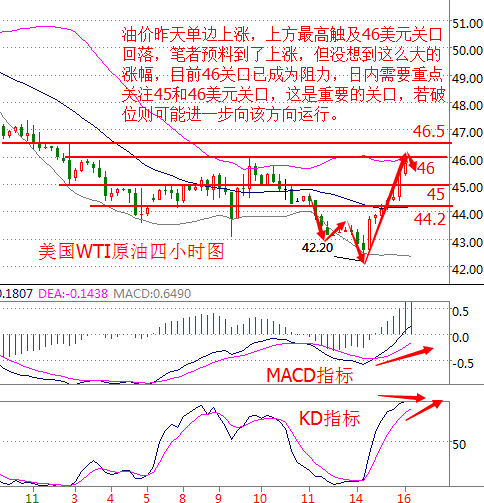 行情回顧與解析: 隨著月底OPEC會議的臨近以及油價連續性的暴跌加劇了油價供應過剩的現狀,OPEC不得不啟動了最后的外交斡旋來確保達成原油減產協議,減產預期升溫觸發大量空頭獲利盤回補,兼之尼日利亞輸油管道受襲等三大額外利好助陣,導致油價強勁反彈。隔日油價亞歐美盤內持續走高,毫無空頭回落之意,一路飆漲至46美元上方。而凌晨的API數據卻遠遠高于預期,一度令油價短線小幅下跌。雖然油價再次企穩45美元沖向46美元的關口,但諸多利空的因素依然存在,對于晚間的EIA要謹防空頭反撲。 基本面分析: 周二(11月15日)美國WTI原油12月期貨收漲2.49美元,或5.75%,報45.81美元/桶,最高觸及45.98美元/桶。布倫特原油1月期貨周二收漲2.52美元,或5.67%,報46.95美元/桶,最高觸及47.14美元/桶。 早間美國石油協會(API)公布的原油庫存數據顯示,美國原油庫存增加365萬桶,至4.888億桶,分析師預估為增加150萬桶。庫欣原油庫存增加110萬桶。 北京時間23:30,美國能源信息署(EIA)將公布上周原油庫存報告,根據早間API公布的原油庫存,晚間EIA數據難言利好,油價能否在逆境中上漲還需進一步觀察。 原油技術面分析: 美國WTI原油從四小時走勢圖來看,油價昨天單邊上漲,最高觸及46美元關口回落,筆者此前預料到了是上漲行情,但沒想到這么大漲幅,不過曾提到了破位45則有可能看向46美元,目前該位置成為關鍵阻力,日內還需重點關注45美元,這兩個重要的關口,日內如果破位則可能進一步向該方向運行。 從指標來看,K線正好觸及布林帶上軌回落,附圖MACD指標快慢線金叉向上運行,紅色動能柱放量;附圖KD指標持續上行進入超買區,目前出現走緩跡象。 綜合來看,油價目前有回調需求,不過鑒于隔夜強勁漲勢,也有可能是震蕩行情,待KD指標脫離超買區預計還有一波上漲,操作上建議回落做多。 美原油操作建議:回落做多 45美元上方做多,目標看向46美元附近,進一步看向46.5美元; 現價46美元下方附近可輕倉做空,目標看向45美元上方,站穩46美元止損。 白銀技術面分析: 現貨白銀從四小時走勢圖來看,白銀價格持續震蕩于17.2美元下方,日內需關注該阻力,破位則看向17.5美元附近。下方則受16.8美元附近支撐,短線上需要關注17美元整數關口的支撐。 從指標來看,K線同樣盤整于布林帶中、下軌之間,附圖KD指標持續向上運行。綜合來看,白銀價格存在上漲動能,操作上建議回落做多。 現貨白銀操作建議: 17美元附近做多,目標看向17.2美元附近,破位進一步看向17.5美元,跌破16.8美元止損; 今日重點關注 17:30 英國10月失業率(%) 21:30 美國10月PPI月率(%) 22:15 美國10月工業產出月率(%) 23:00 美國11月NAHB房產市場指數 23:30 美國11月11日當周EIA原油庫存變動 16:00 2016年FOMC票委、圣路易斯聯儲主席布拉德將參加2016年瑞銀歐洲會議主題為“量化寬松后的貨幣政策:直升機撒錢或是回歸升息?”的小組討論會 20:45 美國明尼阿波利斯聯儲主席卡什卡利將在紐約發表有關“大而不倒”的演講 (以上文章由春雨原創,轉載請注明出處。溫馨提示,投資有風險,入市需謹慎。以上僅代表春雨個人觀點,不作操作依據,據此操作風險自擔) |