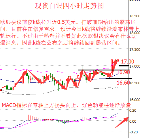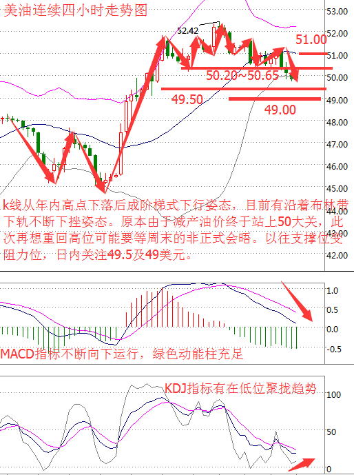 基本面分析: 本周四(12月8日),雖然EIA原油庫(kù)存數(shù)據(jù)降幅超預(yù)期,但市場(chǎng)更多關(guān)注的焦點(diǎn)還是減產(chǎn)協(xié)議的執(zhí)行以及非OPEC國(guó)家的承諾,市場(chǎng)對(duì)減產(chǎn)協(xié)議存疑繼續(xù)施壓油價(jià)下跌2%。 油價(jià)周三走低,主要因市場(chǎng)對(duì)石油輸出國(guó)組織(OPEC)和俄羅斯的減產(chǎn)承諾,是否足以結(jié)束供應(yīng)過(guò)剩狀況存疑。此外EIA原油庫(kù)存數(shù)據(jù)對(duì)市場(chǎng)的影響有限。雖然原油庫(kù)存降幅超預(yù)期,但汽油、精煉油庫(kù)存去大幅增加。 尼日利亞油長(zhǎng)周三表示,即便在本周末會(huì)議上,俄羅斯是唯一承諾減產(chǎn)的非OPEC產(chǎn)油國(guó),OPEC也將執(zhí)行其減產(chǎn)協(xié)議。另外,尼日利亞周三表示,希望將1月石油產(chǎn)量從目前的190萬(wàn)桶/日提升至210萬(wàn)桶/日。OPEC同意該國(guó)不參與減產(chǎn)。 原油技術(shù)面分析: 從美油四小時(shí)走勢(shì)圖來(lái)看,k線從年內(nèi)高點(diǎn)下落后成階梯式下行,目前有沿著布林帶下軌不斷下挫姿態(tài)。原本由于減產(chǎn)油價(jià)終于站上50大關(guān),此次再想重回高位可能要等周末的非正式會(huì)晤。以往支撐位變阻力位,日內(nèi)關(guān)注49.5及49美元。 從指標(biāo)上看,布林帶開(kāi)口,中下軌不斷向下運(yùn)行,MACD指標(biāo)拐頭向下,綠色動(dòng)能柱充足。KDJ指標(biāo)有低位聚攏趨勢(shì)。 綜合來(lái)看,油價(jià)下行空間較足,支撐點(diǎn)變阻力點(diǎn)。50大關(guān)上方阻力點(diǎn)較多,上方重點(diǎn)關(guān)注50.20及50.65兩大阻力位,下方重點(diǎn)關(guān)注49.50及49大關(guān)。 美原油操作建議:反彈做空 1、49.00美元附近做多,目標(biāo)看向50.65美元附近,止損在48.5美元下方; 2、51美元下方嘗試做空,目標(biāo)看0.6美元左右,止損0.2美元。 白銀技術(shù)面分析: 從現(xiàn)貨白銀四小時(shí)走勢(shì)圖來(lái)看,歐銀決議前夜k線拉升近0.5美元。打破前期給出的震蕩區(qū)間,目前存在修復(fù)需求,預(yù)計(jì)今日k線將繼續(xù)沿著布林帶上軌運(yùn)行。不過(guò)由于筆者并不看好此次歐銀決議會(huì)有什么勁爆消息,因此k線在公布之后將繼續(xù)回到震蕩區(qū)間。MACD指標(biāo)拐頭向上,紅色動(dòng)能柱充足。 綜合來(lái)看,白銀價(jià)格上漲空間較大,目前逐漸企穩(wěn)17大關(guān),不過(guò)日內(nèi)還需重點(diǎn)關(guān)注17美元,上方關(guān)注17.5。 現(xiàn)貨白銀操作建議: 1:建議16.3-16.5美元附近做多,止損0.3美元附近,目標(biāo)16.8-17美元附近; 2:建議17-16.8美元附近做空,止損0.3美元附近,目標(biāo)16.5-16.3美元附近; 今日重點(diǎn)關(guān)注數(shù)據(jù): 10:00 中國(guó)11月貿(mào)易帳(按人民幣計(jì)) 20:45 歐洲央行將公布最新的利率決議 21:30 美國(guó)12月3日當(dāng)周初請(qǐng)失業(yè)金人數(shù) 21:30 歐洲央行行長(zhǎng)德拉吉將召開(kāi)新聞發(fā)布會(huì) 23:30 美國(guó)12月2日當(dāng)周EIA原油庫(kù)存 。ㄒ陨衔恼掠纱河昃劢鹪瓌(chuàng),轉(zhuǎn)載請(qǐng)注明出處。溫馨提示,投資有風(fēng)險(xiǎn),入市需謹(jǐn)慎。以上僅代表春雨個(gè)人觀點(diǎn),不作操作依據(jù),據(jù)此操作風(fēng)險(xiǎn)自擔(dān)) 本文作者系CFP注冊(cè)理財(cái)規(guī)劃師,多年從事金融領(lǐng)域相關(guān)工作,對(duì)現(xiàn)貨大宗商品有豐富的實(shí)戰(zhàn)經(jīng)驗(yàn)。 |