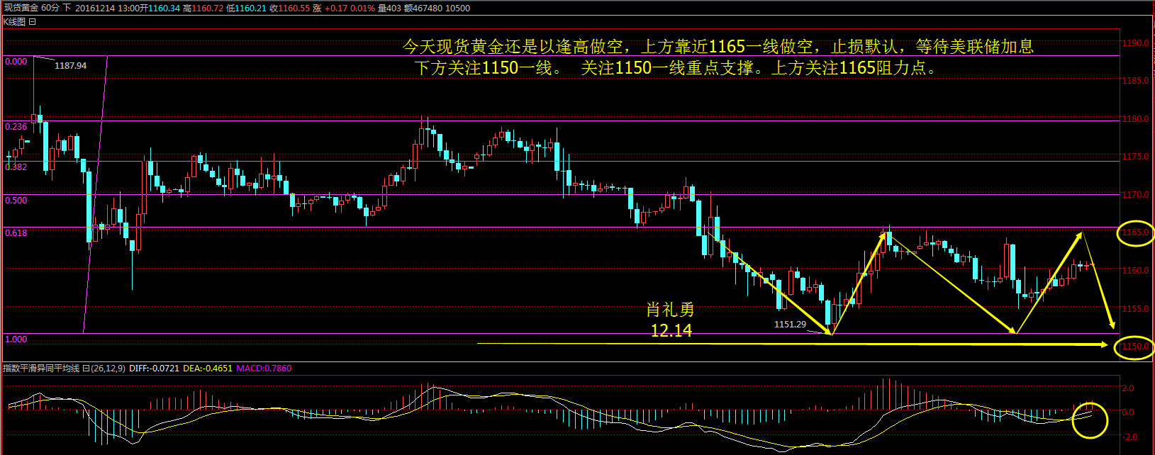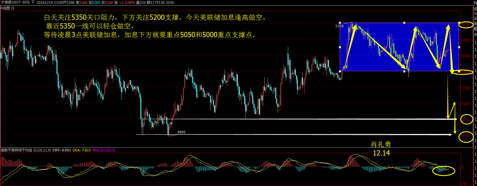 肖禮勇:12.14凌晨美聯(lián)儲加息.寧貴白銀.黃金難以翻身 寧貴白銀:隨著美國議息會議的到來,讓全球金融市場開始變得敏感,而與美元相關的外匯資產乃至于黃金白銀,在近期都將備受考驗。在過去的一個多月時間里,因美聯(lián)儲加息預期的逐漸升溫,讓國際黃金/白銀持續(xù)下跌,保持強勢空頭發(fā)展,而在最近兩天,美聯(lián)儲加息即將塵埃落定,這一利空預期也將落到實處,是否加息,或者加息后白銀的去向如何,或將是投資者所關注的目光(不妨參考去年12月份美聯(lián)儲第一次加息時的背景和表現(xiàn),同樣加息前持續(xù)下跌,但真加息后,走深V性反彈)。 而從盤中表現(xiàn)看,最近幾個交易日圍繞在5200/5340這個區(qū)間頂端做持續(xù)震蕩,雖然一度表現(xiàn)出強勢,或者弱勢狀態(tài),但均缺乏后勁,難以突破,最終回歸走震蕩。究其原因在美聯(lián)儲加息未落到實處之前,市場反應會稍顯謹慎,所以短線交易來說,咱們依然以震蕩對待會更好;但要注意,美聯(lián)儲議息會議的到來,也意味著結果即將出爐,而不管是買預期賣事實的發(fā)展,還是利空下的下跌,在短期內都將會具備著一波打壓,所以數據前的計劃,會側重于高空一些,當然一旦加息成為現(xiàn)實,后續(xù)該考慮的將是低多。 參考計劃: 寧貴白銀:短線交易圍繞5300/5200兩端做短線波段,嚴格止損走短線;靜待美聯(lián)儲議息會議結果后再做趨勢安排! 國際黃金:1165附近做空,止損1170,看1155/1142。 |
