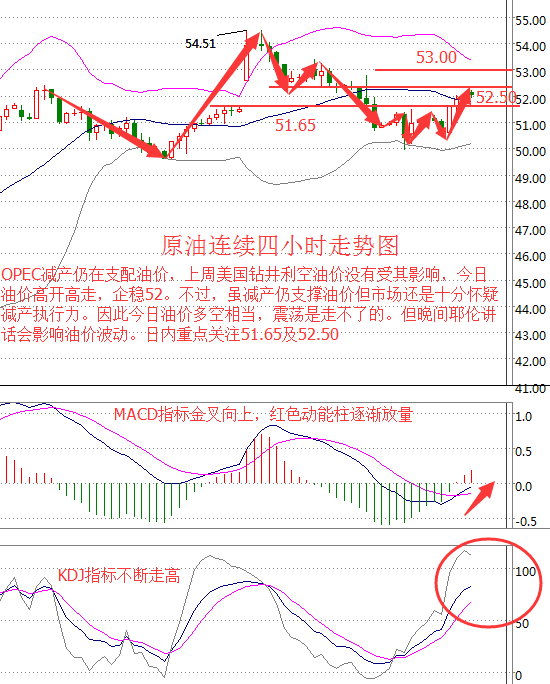 基本面分析: 受到OPEC減產協議的提振,油價過去數周以來持續攀升。在過去的五周中,美國原油 和布倫特原油四周錄得上漲,累計升幅分別達到20%和23%左右。 雖然俄羅斯、科威特等產油國同意減產,不過,市場質疑其它OPEC成員國的減產意愿。盡管承諾減產21萬桶/日,OPEC第二大產油國伊拉克,仍簽署了新協議,增加對中國和印度等亞洲客戶的出口。 本周重點關注次日(12月20日)凌晨02:30美聯儲 主席耶倫將針對就業市場狀況發表講話,是支撐美元繼續走高還是就此結束美元漲幅就看耶倫講話。 原油技術面分析: 從原油連續四小時走勢圖來看,OPEC減產仍在支配油價,上周美國鉆井利空油價沒有受其影響,今日油價高開高走,企穩52。不過,雖減產仍支撐油價但市場還是十分懷疑減產執行力。因此今日油價多空相當,震蕩是走不了的。但晚間耶倫講話會影響油價波動。 從指標上看,布林帶收口明顯,MACD指標金叉向上,紅色動能柱逐漸放量,KDJ指標有在超買區聚攏跡象。綜合來看,油價上漲動能較足,日內重點關注52.50及53美元。不過,謹防耶倫講話打壓油價,下方重點關注51.65。 美原油操作建議:回落做多 1、51.50美元附近做多,止損50.00美元下方,目標看向52.56美元附近。 2、53.00美元附近做空,止損在0.4美元上方,目標看向51.80美元附近。 白銀技術面分析: 從現貨白銀四小時走勢圖來看,白銀價格走出L型走勢,今晚耶倫講話還將支配白銀價格,預計白銀價格將在16.0上方震蕩前行。日內重點關注16.30。 從指標上看,布林帶三軌向下運行,MACD指標有金叉跡象,綠色動能柱逐漸縮量。綜合來看,白銀價格技術指標多空對抗嚴重,銀價將在16.1附近拉扯。 現貨白銀操作建議: 1、16.3美元附近做空,目標看向16.00位置,止損在16.5美元上方; 2、觸及15.8美元可做多,目標看向16.3美元,止損15.79美元下方。 今日重點關注數據 22:45 美國12月Markit綜合PMI初值 美國538名選舉人正式投票選出新任美國總統 次日凌晨02:30 美聯儲主席耶倫將針對就業市場狀況發表講話 (以上文章由春雨聚金原創,轉載請注明出處。溫馨提示,投資有風險,入市需謹慎。以上僅代表春雨個人觀點,不作操作依據,據此操作風險自擔) 本文作者系CFP注冊理財規劃師,多年從事金融領域相關工作,對現貨大宗商品有豐富的實戰經驗。 |