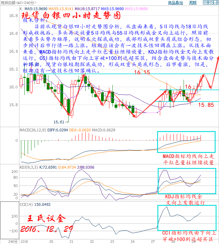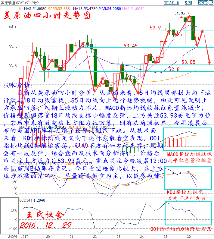 老王操作理念: 技術(shù)高位時追漲,短線盈利的很容易被大幅虧損吞回,風(fēng)險大于收益,很難賺到錢。同樣,技術(shù)低位進(jìn)場的,短線被套的很容易被快速拉升挽回,機會大于風(fēng)險,很難套住人。因此,技術(shù)低位要敢于做多,才能不踏空;技術(shù)高位,要敢于做空,才能不高位站崗。以后老王會每天整理出當(dāng)天交易行情中漲停個股的分析,給大家一些選股思路!(600959 江蘇有線)、(300465 高偉達(dá)) 國際消息面: 美國WTI原油2月期貨周三(12月28日)收漲0.16美元,或0.30%,報54.06美元/桶。布倫特原油2月期貨周三收漲0.13美元,或0.23%,報56.22美元/桶。淡靜的假期市場中油價小幅上漲,維持在2015年中旬以來的最高位附近,目前市場拭目以待石油輸出國組織(OPEC)在2017年1月1日將如何展開減產(chǎn)行動。美國WTI原油期貨價格盤中最高觸及54.36美元/桶,布倫特原油期貨價格盤中最高觸及57.27美元/桶。 基本面利空因素: 全美不動產(chǎn)協(xié)會(NAR)周三公布,美國11月成屋待完成銷售降至近一年最低水平,表明利率上升可能對樓市起到抑制作用。不過美元未受影響還在延續(xù)神奇的表演。自特朗普意外贏得大選以來,市場押注其將推行擴張的財政政策,且美聯(lián)儲加息步伐將加快,美元指數(shù)一飆再飆。據(jù)彭博最新報道,受到濃厚的需求推動,美元在今年四季度還剩下兩個交易日之際,勢將創(chuàng)下2008年以來最佳的季度表現(xiàn)。美元走強將在一定程度上限制油價的反彈空間。 因油價持續(xù)復(fù)蘇以及銀行開始擴大信用額度,美國頁巖油產(chǎn)商已經(jīng)計劃于明年增加鉆探和生產(chǎn)支出,為兩年內(nèi)首次。Raymond James分析師指出,預(yù)計北美油氣企業(yè)將于2017年內(nèi)同比增加30%的資本支出。美國能源部預(yù)計頁巖油產(chǎn)量將在新的一年內(nèi)增加20-50萬桶/日。 美國油服公司貝克休斯(Baker Hughes)周五(12月23日)公布數(shù)據(jù)顯示,截至2016年12月23日當(dāng)周美國石油活躍鉆井?dāng)?shù)增加13座至523座,連增第八周,同時觸及2015年12月以來最高,過去30周內(nèi)有27周錄得增加,累計增幅達(dá)207座。同時美國石油和天然氣活躍鉆井總數(shù)增加增加16座至653座,較去年同期減少47座。 美國能源信息署(EIA)最新數(shù)據(jù)顯示,截至12月16日當(dāng)周,美國原油庫存增加225.6萬桶,至4.854億桶,增幅0.5%,結(jié)束此前連續(xù)四周的下滑態(tài)勢,市場預(yù)估為減少251.5萬桶。上周美國原油進(jìn)口增加103.9萬桶,至847.1萬桶/日。煉廠產(chǎn)能利用率上升1個百分點,至91.5%,日煉油量增加18.4萬桶。 現(xiàn)貨原油技術(shù)分析及操作建議———— 技術(shù)分析: 目前從美原油四小時分析,從盤面來看,5日均線頂部拐頭向下運行欲與18日均線靠攏,55日均線向上運行趨勢放緩,由此可見說明上方承壓回落,短期上漲動力不足,MACD指標(biāo)均線收攏紅色量能減少,價格短期回落受18日均線支撐小幅度反彈,上方關(guān)注53.93美元阻力位,若后市未有效突破上方阻力位回落,則有頭肩頂初顯。今早凌晨公布的美國API庫存大增導(dǎo)致原油短線下跌。從技術(shù)面來看,KDJ指標(biāo)均線死叉向下運行發(fā)散看空表現(xiàn),CCI指標(biāo)均線0軸附近震蕩,說明下方有一定的支撐,短期會有一波反彈,結(jié)合盤面及技術(shù)面分析得出,價格后市關(guān)注上方壓力位53.93美元,重點關(guān)注今晚凌晨12:00美國當(dāng)周EIA庫存情況,今日看空跡象比較大,在上方壓力不破的情況下,盡量逢高做空為主,以低多為輔。 美原油操作建議: 今日美原油整體操作趨勢以逢高做空為主,以低多為輔。 日內(nèi)阻力:54.4/55.3 日內(nèi)支撐:53.1/52.5 激進(jìn)者空單54.1~53.9區(qū)間內(nèi)可以考慮嘗試做空,止損54.4美元上方,目標(biāo)53.5/53.1。 穩(wěn)健者空單54.5~54.7區(qū)間內(nèi)可以考慮嘗試做空,止損55美元上方,目標(biāo)53.8/53.5。 激進(jìn)者多單53.65~53.45區(qū)間內(nèi)可以考慮嘗試做多,止損53.1美元下方,目標(biāo)54.1/54.5。 穩(wěn)健者多單53.1~52.9區(qū)間內(nèi)可以考慮嘗試做多,止損52.5美元下方,目標(biāo)53.6/54.3。 現(xiàn)貨白銀技術(shù)分析及操作建議———— 技術(shù)分析: 目前從現(xiàn)貨白銀四小時走勢圖分析,從盤面來看,5日均線與18日均線形成收攏后,多頭再次放量5日均線與55日均線形成金叉向上運行,照目前來看多頭勢力雄厚,說明本次探底成功,底部形成雙重頭肩底組合形態(tài),初步預(yù)計后市行情一路上漲。短期應(yīng)該會有一波技術(shù)性回調(diào)在上漲。從技術(shù)面來看,MACD指標(biāo)均線向上走平紅色量柱繼續(xù)放量,KDJ指標(biāo)均線金叉向上發(fā)散運行,CCI指標(biāo)均線由下向上穿破+100到達(dá)超買區(qū),結(jié)合盤面走勢與技術(shù)面分析得出,現(xiàn)貨白銀短期探底成功,形成雙重頭肩底形態(tài),后市看漲,但是,短期應(yīng)有一波技術(shù)性回落確認(rèn)。 現(xiàn)貨白銀操作建議: 今日現(xiàn)貨白銀整體操作趨勢以逢低做多為主,以高空為輔。 日內(nèi)阻力:16.3/16.6 日內(nèi)支撐:15.6/15.2 激進(jìn)者空單建議16.3~16.15區(qū)間內(nèi)可以考慮嘗試做空,止損16.6美元附近,目標(biāo)16/15.7。 穩(wěn)健者空單建議16.6~16.45區(qū)間內(nèi)可以考慮嘗試做空,止損16.9美元附近,目標(biāo)16/15.6。 激進(jìn)者多單建議16.05~15.9區(qū)間