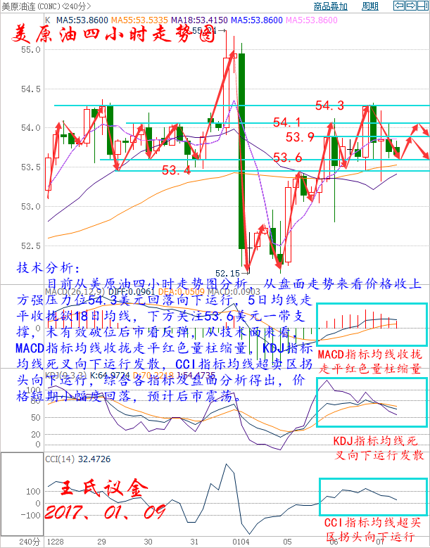 老王操作理念: 技術高位時追漲,短線盈利的很容易被大幅虧損吞回,風險大于收益,很難賺到錢。同樣,技術低位進場的,短線被套的很容易被快速拉升挽回,機會大于風險,很難套住人。因此,技術低位要敢于做多,才能不踏空;技術高位,要敢于做空,才能不高位站崗。以后老王會每天整理出當天交易行情中漲停個股的分析,給大家一些選股思路! 國際基本消息面: 美國WTI原油2月期貨周五(1月6日)收漲0.23美元,或0.43%,報53.99美元/桶,本周小幅下挫0.09%。布倫特原油3月期貨周五收漲0.21美元,或0.37%,報57.10美元/桶,本周小幅上漲0.02%。石油輸出國組織(OPEC)減產協(xié)議的執(zhí)行進度良好令多頭士氣大受鼓舞,但美國石油活躍鉆井數(shù)的繼續(xù)增加以及美元反彈均令油價上行空間受限。美國WTI原油期貨價格盤中最高觸及54.30美元/桶,布倫特原油期貨價格盤中最高觸及57.47美元/桶。 基本面利空因素: 作為傳統(tǒng)的市場大戲,且是2017年的第一份就業(yè)報告,美國勞工部(DOL)周五(1月6日)公布的數(shù)據(jù)顯示,美國12月非農就業(yè)人數(shù)增加15.6萬人,不及市場預期增加17.5萬人,12月失業(yè)率則升至4.7%。不過,小時薪資年率上升2.9%,創(chuàng)下2009年以來最大增速,成為此次就業(yè)報告中的最大亮點。繼2015年全年增加270萬個就業(yè)之后,2016年全年增幅也超過200萬,達到216萬,為連續(xù)第六年全年新增就業(yè)超過200萬,創(chuàng)下1999年以來最長紀錄。非農公布之后,聯(lián)邦基金利率市場顯示,美聯(lián)儲3月加息概率為31.4%,6月為71.9%,9月為84.4%。美元強勢走高令油價承壓。 美國油服公司貝克休斯(Baker Hughes)周五(1月6日)公布數(shù)據(jù)顯示,截至2016年1月6日當周美國石油活躍鉆井數(shù)增加4座至529座,連增第十周,再刷2015年12月以來新高且高于去年同期的516座。此外,美國石油和天然氣活躍鉆井總數(shù)增加增加7座至665座,較去年同期增加1座。 美國能源信息署(EIA)最新數(shù)據(jù)顯示,截至12月30日當周,美國精煉油庫存增加1005.1萬桶,市場預估為增加110.0萬桶。美國上周汽油庫存增加830.7萬桶,增幅創(chuàng)一年來最大,市場預估為增加178.6萬桶。美國原油交割地庫欣庫存增加107.4萬桶,觸及去年5月來最高水平,過去7周內有6周錄得增長,前值為增加17.2萬桶。此外,上周美國國內原油產量增加0.4萬桶至877萬桶/日,但依然連續(xù)第39周維持在900萬桶/日關口下方。 俄羅斯能源部最新數(shù)據(jù)顯示,俄羅斯12月原油產量較上月持平,維持在1121萬桶/日的近30年紀錄高位。俄羅斯12月原油總產量達到4740.2萬噸,高于11月的4588.4萬噸。2016年全年總產量升至5.47499億噸,較2015年增加1072萬噸。針對2017年,俄羅斯能源部預計原油總產量將達到5.48-5.51億桶,約為1101-1107萬桶/日。 現(xiàn)貨原油技術分析及操作建議———— 技術分析: 目前從美原油四小時走勢圖分析,從盤面走勢來看價格收上方強壓力位54.3美元回落向下運行,5日均線走平收攏欲18日均線,下方關注53.6美元一帶支撐,未有效破位后市看反彈,從技術面來看,MACD指標均線收攏走平紅色量柱縮量,KDJ指標均線死叉向下運行發(fā)散,CCI指標均線超賣區(qū)拐頭向下運行,綜合各指標及盤面分析得出,價格短期小幅度回落,預計后市震蕩。 美原油操作建議: 今日美原油整體操作趨勢以逢高做空為主,以低多為輔。 日內阻力:54.3/54.9 日內支撐:53/52.3 建議激進者空單53.85-54區(qū)間內可以考慮擇機入場做空,止損54.3美元上方,目標53.2/52.8美元。 建議穩(wěn)健者空單54.5-54.65區(qū)間內可以考慮擇機入場做空,止損55美元上方,目標54/53.6美元。 建議激進者多單53-53.15區(qū)間內可以考慮擇機入場做多,止損52.7美元下方,目標53.6/54.3美元。 建議穩(wěn)健者多單52.3-52.45區(qū)間內可以考慮擇機入場做多,止損52美元下方,目標53/53.6美元。 以上操作建議僅供參考、投資有風險、操作需謹慎。 【以上建議出自高德金融研究院,以內部客戶操作建議為準】