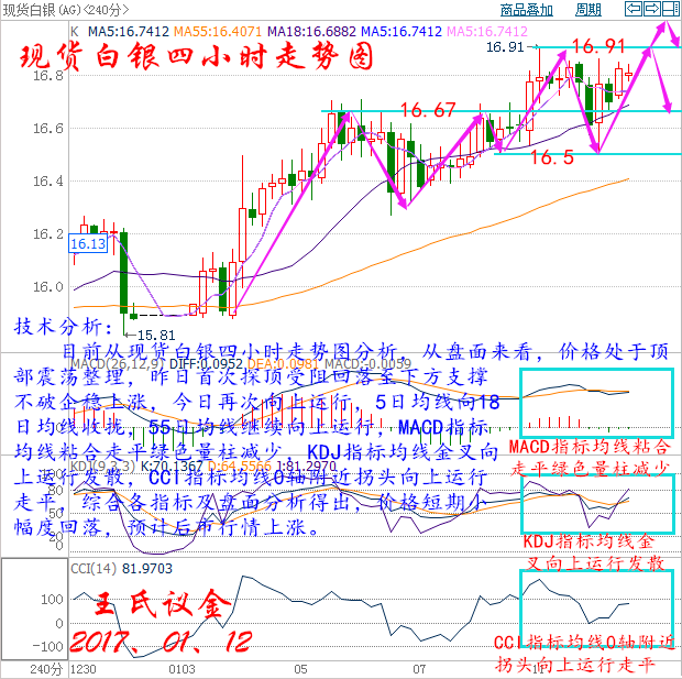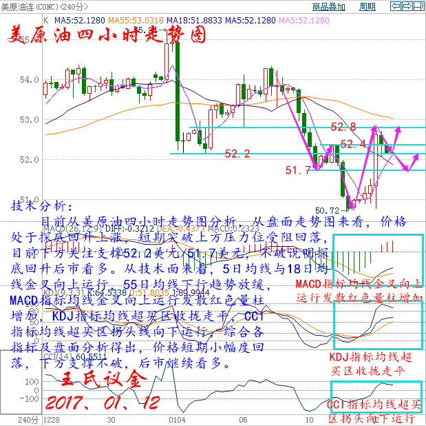 老王操作理念: 技術高位時追漲,短線盈利的很容易被大幅虧損吞回,風險大于收益,很難賺到錢。同樣,技術低位進場的,短線被套的很容易被快速拉升挽回,機會大于風險,很難套住人。因此,技術低位要敢于做多,才能不踏空;技術高位,要敢于做空,才能不高位站崗。以后老王會每天整理出當天交易行情中漲停個股的分析,給大家一些選股思路! 國際基本面消息: 美國WTI原油2月期貨周三(1月11日)收漲1.43美元,或2.81%,報52.25美元/桶。布倫特原油3月期貨周三收漲1.46美元,或2.72%,報55.10美元/桶。沙特2月份削減對部分亞洲客戶的原油供應,進一步鞏固了市場對減產行動的信心,同時特朗普講話后美元承壓也提振了油價,不過美國庫存全面高企為油價反彈前景埋下了隱患。美國WTI原油期貨價格盤中最高觸及52.77美元/桶,布倫特原油期貨價格盤中最低觸及55.67美元/桶。 基本面利多消息: 沙特已經削減2月份針對印度和東南亞客戶的原油供應量,從而配合石油輸出國組織(OPEC)的減產行動,不過沙特對其他亞洲客戶的原油供應將保持穩定。1月份不曾觸及的亞洲市場也面臨供應下降的局面表明沙特的減產決心非常堅決。亞洲一直是沙特最為重視的市場。交易商透露,沙特阿美2月份仍將全額供應多數北亞客戶,意味著該國只能通過削減歐洲和美國客戶的原油供應才能達成OPEC的減產配額。 美元指數隨著特朗普有關貿易政策評論而跌宕起伏,記者會結束時美元跌至日低,因缺乏相關細節,市場感到失望。 美元走弱為油價反彈提供了助力。 俄羅斯1月1日至8日原油日均產量為1110萬桶,低于去年12月的1121萬桶以及去年10月的1124.7萬桶,表明俄羅斯已經開始履行減產承諾。俄羅斯能源部長諾瓦克(Alexander Novak)近期表示,俄羅斯計劃將原油產量削減至1094.7萬桶/日。他補充道,該國計劃在第一季度減產20萬桶/日,之后再回進一步將減產規模擴大至30萬桶/日。 科威特石油部官員周五(1月6日)表示,該國已經將1月原油產量削減至270.7萬桶,完成了石油輸出國組織(OPEC)于去年11月30日達成的減產協議的配額目標。而據華爾街日報援引消息人士報道,沙特也已完全落實減產協議,本月以來這個世界上最大原油出口國的原油產量至少下降48.6萬桶/日至1005.8萬桶/日。同時非OPEC中東地區產油國阿曼上周也已經通知客戶將削減3月份的原油供應量,減幅約為5%。 路透調查顯示,12月OPEC原油產量從11月的3440萬桶/日減少至3420萬桶/日,主要因尼日利亞和沙特產量下滑。不過較3250萬桶/日的限產目標依然高了170萬桶/日,其中12月利比亞、伊朗和伊拉克原油產量增加。 現貨原油技術分析及操作建議———— 技術分析: 目前從美原油四小時走勢圖分析,從盤面走勢圖來看,價格處于探底回升上漲,短期突破上方壓力位受阻回落,目前下方關注支撐52.2美元/51.7美元,不破說明探底回升后市看多。從技術面來看,5日均線與18日均線金叉向上運行,55日均線下行趨勢放緩,MACD指標均線金叉向上運行發散紅色量柱增加,KDJ指標均線超買區收攏走平,CCI指標均線超買區拐頭線向下運行,綜合各指標及盤面分析得出,價格短期小幅度回落,下方支撐不破,后市繼續看多。 美原油操作建議: 今日美原油整體操作趨勢以逢低做多為主,以高空為輔。 日內阻力:53/53.6 日內支撐:51.75/50.75 激進者空單52.6~52.7區間內可以考慮嘗試做空,止損53美元上方,目標52.2/51.8美元。 穩健者空單53.1~53.2區間內可以考慮嘗試做空,止損53.5美元上方,目標52.5/52.1美元。 激進者多單52.1~52.2區間內可以考慮嘗試做多,止損51.8美元下方,目標52.6/53美元。 穩健者多單51.7~51.8區間內可以考慮嘗試做多,止損51.4美元下方,目標52.4/52.8美元。 以上操作建議僅供參考、投資有風險、操作需謹慎。 【以上建議出自高德金融研究院,以內部客戶操作建議為準】 現貨白銀技術分析及操作建議———— 技術分析: 目前從現貨白銀四小時走勢圖分析,從盤面來看,價格處于頂部震蕩整理,昨日首次探頂受阻回落至下方支撐不破企穩上漲,今日再次向上運行,5日均線向18日均線收攏,55日均線繼續向上運行,MACD指標均線粘合走平綠色量柱減少,KDJ指標均線金叉向上運行發散,CCI指標均線0軸附近拐頭向上運行走平,綜合各指標及盤面分析得出,價格短期小幅度回落,預計后市行情上漲。 現貨白銀操作建議: 今日現貨白銀整體操作趨勢以逢低做多為主,以高空為輔。 日內阻力:16.83/17.02 日內支撐:16.51/16.37 激進者空單建議16.84~16.88區間內可以考慮嘗試做空,止損17.02美元附近,目標16.65/16.51美元。 穩健者空單建議16.98~17.02區間內可以考慮嘗試做空,止損17.16美元附近,目標16.83/16.71美元。 激進者多單建議16.71~16.65區間內可以考慮嘗試做多,止損16.51美元附近,目標16.84/17.02美元。 穩健者多單建議16.41~16.37區間內可以考慮嘗試做多,止損16.23美元附近,目標16.5/16.71美元。 以上操作建議僅供參考、投資有風險、操作需謹慎。 【以上建議出自高德金融研究院,以內部客戶操作建議為準】 今日重點關注的財經數據與事件2017年1月12日 周四 ①20:30 歐洲央行公布貨幣政策會議紀要 ②21:30 美國至1月7日當周初請失業金人數、美國12月進口物價指數月率 ③21:30 美聯儲2017年FOMC票委哈克就經濟前景發表講話 ④21:45 美聯儲2017年FOMC票委埃文斯就當前經濟狀況和貨幣政策發表演說 ⑤23:30 美國至1月6日當周EIA天然氣庫存 ⑥次日02:45 美聯儲20