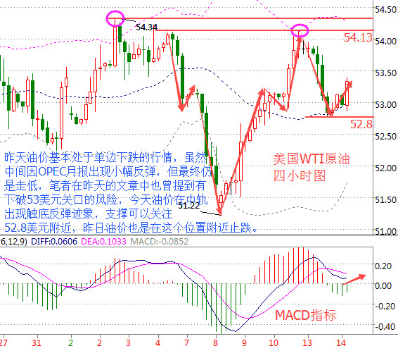 金盤神手:2.14晚評原油黃金白銀晚間行情分析及操作建議 消息面 北京時間周二(2月14日)23:00,美聯儲(FED)主席耶倫(Janet Yellen)將在參議院金融委員會發(fā)表半年度貨幣政策證詞。這將是她自特朗普(Donald Trump)就任總統以來首次發(fā)表半年度國會證詞。另外,明日早間市場將迎來美國2月12日當周API原油庫存數據,市場預計此次API庫存或又將增加,油價52大關岌岌可危。 市場行情解讀 周二(2月14日)歐市盤初,國際油價止跌反彈,目前美國WTI原油最高觸及53.42美元/桶,漲幅近1%,因OPEC牽頭的減產行動帶來支撐,其他地區(qū)產量上升令油價陷于年初以來的窄幅區(qū)間波動。上日油價下跌2%。自今年開年以來,布倫特原油和美國原油的波動幅度一直保持在5美元以內。 原油技術面分析 美國WTI原油從四小時走勢圖來看,昨日油價基本處于單邊下跌,雖然OPEC月報利好帶來小幅反彈,但最終仍走低,筆者在昨天的文章中也曾提到有下破53美元關口風險,想必穩(wěn)健觀望者是不虧的,今天的油價在中軌附近出現止跌反彈跡象,支撐可以關注52.8美元附近,昨天油價也是在這個位置附近止跌。 從指標來看,K線自上軌跌至中軌止跌反彈,附圖MACD指標快慢線出現拐頭向上跡象,同時綠色動能柱也開始縮量。 綜合來看,今天油價觸底反彈跡象明顯,不過耶倫講話及API原油庫存難言利好,尾盤時段油價風險偏下行,同時,目前油價反彈至日內的相對高位,上漲空間不是很充足,操作上建議反彈至高位做空為好,總的來說操作上是先短多后空。 原油部分參考建議 1、反彈54.13美元下方做空,目標看向53美元一線,止損在54.3美元上方; 2、短線可在現價稍微回落至53.1美元附近時做多,目標看向54美元附近,止損在53美元下方; 3、瀝青及其他油類產品(芳烴、樹脂、燃料烴等)與原油行情走勢相同,平臺點位不同,自行把握; 黃金技術面分析