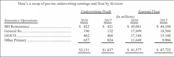 30、我們最近拿了一個大單子,浮存金一下子超過了1000億美元。即使沒有這個大單,我們的在GEICO以及其他幾個子公司的浮存金的數額肯定也會增長。然后,National Indemnity的再保險部門的浮存金卻在下降。 31、我們時不時的會經歷浮存金下降的情況。但下降是非常緩慢的,任何一年沒有超過3%。保險合同的特性決定了我們不會遭受短期大量資金需求。這個結構是我們精心設計過的,也是我們下面這些財務能力強弱不等的保險公司的一個重要組成部分。 32、當我們的保費超過總的成本跟損失是,我們的浮存金就會增加。我們很樂意來使用這筆錢。更美妙的是,我們因持有這筆錢而得到獎賞。 33、不幸的是,因為所有保險公司都希望看到這種快樂的局面,所以導致競爭加劇,有時候導致p/c行業會出現非常顯著的虧損。這個虧損,本質上其實是整個行業為持有浮存金所支付的費用。 34、現在全世界范圍內的利率都很低,這使得上面這種結果更確定無疑。幾乎所有p/c公司的投資組合都大量的投資在債券上(伯克希爾的除外)。隨著歷史上收益可觀的債券到期,新的低收益率的債券被拿來頂替,浮存金的收益會穩步下滑。基于以上原因,大概率這個行業在未來10年的表現會不及過去10年的表現,特別是那些專注再保險的公司。 35、盡管如此,我對于我們自己的前景確非常樂觀。伯克希爾的財務狀況很好,幾乎是無與倫比的,這使得我們在投資的時候能夠比別家更靈活。在別人受限制的時候,我們會有更多機會,選擇更多。 36、此外,我們的p/c公司擁有優秀的保險經驗歷史業績,連續14年盈利,這一時期稅前收益累計超過280億美元。這項記錄不是偶然:有紀律性的風險評估是我們保險經理人每日的關注重心。他們知道盡管浮存金很有價值,但浮存金的價值可以被很挫的保險業務拖垮。 37、那么,我們的浮存金如何影響我們的內在價值?把浮存金看成負債是錯的,他應該被看成是一個每日有進有出的循環基金(Revolving fund)。 38、如果我們的循環基金即成本低又是永續的(我相信是的),這部分負債的真正價值會極大的低于它在會計記賬上所展示的價值。負擔永續存在的1美元負債跟負擔第一天來而第二天就必須要償付的1美元的負債是不一樣的。然而在會計上,兩者是一樣的。 39、對于這個高估的負債的部分抵消是我們購買保險公司的時候所額外支付的總計155億美元的“商譽”。這部分商譽體現的是我們為浮存金產生能力支付的溢價。如果一個保險公司產生了長期虧損,任何附著在其資產上的商譽聚會變得一文不值,不管你當初為他支付了多少成本。 40、幸運的是,伯克希爾不大一樣。查理跟我想象我們的保險業務的商譽的真正價值遠遠超過了它的歷史成本。誠然,我們在2000年,當浮存金是280億美元的時候,整個155億美元的商譽依然將在我們的賬上。然而,隨后的歲月,我們的浮存金增長了640億美元,而這個好處全然沒有體現在我的賬面價值上。這個沒有被記錄的資產也是我們認為伯克希爾的內在價值遠遠超過賬面價值的一個原因。 41、伯克希爾吸引人的保險生意存在的唯一原因是我們有非常牛逼的經理有紀律性在運營這些業務。大多數情況下,這些模式都難以復制,讓我來告訴你這些主要的業務單元。 42、第一個是伯克希爾哈撒韋再保險集團(Berkshire Hathaway Reinsurance Group),由AjitJain在管理。Ajit的工作動力與資源是其他任何人都沒有的。他的運營綜合了速度,廣度與深度,更重要的是,在獨特的保險業務中思考的方式。他從沒有把伯克希爾置于任何與我們的資源不相稱的風險之處。 43、的確,伯克希爾在避免風險方面比其他大型保險公司都保守。很多大型保險公司幾乎總是在踩紅線。 44、Ajit自從1986年進入伯克希爾的辦公室至今已經給伯克希爾的股東們創造了成百上千億美元的價值。如果你有機會把我換成他,別猶豫,馬上換! 45、我們另一個再保險公司,GeneralRe,由TadMontross主管,2016年剛退休。我們非常感謝他,現在由Kara Raiguel接任。此前他跟著Ajit工作了16年。 46、一個好的保險運營需要遵從4點,很多公司都忽視了第四點:當合適的保單無法取得的時候,愿意走開。就像一句老話說的,“別人在做,所以我也必須要做” 47、最后,是GEICO,由TonyNicely管理。他18歲進入公司,工作了55年,2016年退休。與Ajit一樣,Tony為伯克希爾創造了大量財富。 48、(下面幾段是關于GEICO溢美之詞,以及廣告,就不翻譯了,大家對GEICO也很熟了。) 49、除了以上三個大的保險業務,我們還擁有一些小公司,主要是做商業保險的。總體而言,他們是成長中的,有價值的業務。 50、大概3年前不到的時候,我們成立了Berkshire Hathaway Specialty Insurance (“BHSI”),由Peter Eastwood負責,目前表現良好。