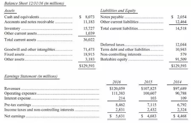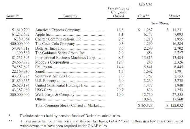 60、表上總共包含了44家直接向我們總部匯報的企業。當然,他們中的很多都有自己的子公司。這些業務表現都還不錯,產生的回報率基本上在12%-20%不等。 61、當然,極少數表現不好,這個要怪我沒做好資本分配,很多是以為沒有看對公司跟行業,也有些是因為我看錯了人。 62、如果把他們看成一個整體的話,他們是非常優秀的。在2016年,他們占用了大概240億美元的凈資產,產生了24%的稅后回報。 63、當然,在優質的企業,如果購買時支付的價格過高,也是個不好的投資。我們為我們的很多業務支付了不菲的溢價,這些個成本體現在我們的資產負債表上。但總體而言,我們獲得了不錯的回報。如果沒有發生經濟衰退的話,這部分業務在2017年還是會增長。部分原因是Duracell and PrecisionCastparts的并表。(兩家公司都是在2016年買的)。此外,Duracell在2016年有較高的交易成本,未來就不會有了。 64、這個板塊有太多公司了,所以我們就不一一點評了。此外,他們的競爭者也在讀這份年報,所以也不方便透露太多信息。 65、(接下來是關于年報上的具體數據的評論,主要說GAAP沒有很好的反應真實的成本數據) 66、說了這么多,查理跟我都喜歡我們的鐵路。 67、有太多的管理層(這個數字似乎每年都在增長)總是在尋找方法,讓他們的調整后的收益能夠比GAAP收益更高。有很多人實際操作中這么干,其中最受歡迎的就是忽略重組費用跟與股權激勵相關的薪酬。 68、查理跟我看到CEO強調調整過的EPS的時候就會很緊張。因為CEO的這種強調報告高數字的方式容易培育不好的企業文化,同時也讓保險公司低估了他們的損失準備金,嚴重的時候會讓很多行業參與者毀滅。 69、伯克希爾自從我第一天接手開始就一直在重組。現如今,每年會有相當多數量的重組發生,因為在我們成百上千多的業務中,總有東西需要改變。比如去年,我們在Duracell上花了大量的錢,為了更好的應對未來的10年。 70、但我們從來沒有暗度列出重組費用,然后告訴你在估算我們的正常的盈利能力的時候忽略它。當然,如果某一年真的有一項非常大的費用發生,我會在點評里面提到。很多分析師跟記者總是在這一點上犯錯。 71、至于股權激勵相關費用,如果說他不是一項成本,就好像一個CEO對股東說,“如果你給我支付期權或者受限股票,別擔心它對于收益的影響,我會把它調整過來。” 72、在大多數大型公司,股權積累薪酬占了前3-4名高管的總薪酬的20%以上。在伯克希爾,我們有幾百個這樣的高管在我們的分支機構,我們也支付差不多同樣的費用。但我們用的是現金。我不得不懺悔,由于缺乏想象力,我把所有這些都記在費用里面。 73、在上世紀60年代的會計瘋潮中,有一個股市。一個CEO的企業要上市,然后他問了審計人員,二加二等于多少?審計人員的回到使得他獲得了這份工作。當然了,回答是這樣的:“你想讓他等于多少?” 金融跟金融產品 74、我們的三個租賃業務通過CORT(家具),XTRA(半拖車),以及Marmon(主要是罐裝車)這三家在運行,每家都是各自領域的龍頭。 75、我們也把Clayton Homes放在這個部分。公司主要收入來源于銷售制造房屋,但大部分利潤來源于貸款組合。去年,Clayton成了全美最大的房屋建筑商,交付了42075戶,占了美國新屋數量的5%。 76、(時間有限,為了早點睡覺,就長話短說,下面的幾段主要是在講Clayton跟Marmon,總之就是非常不錯。特別是Clayton,從近幾年的低利率環境受益匪淺,因為他給購房者的利率是固定的,且是長期的) 投資 15大重倉股如下表所示: