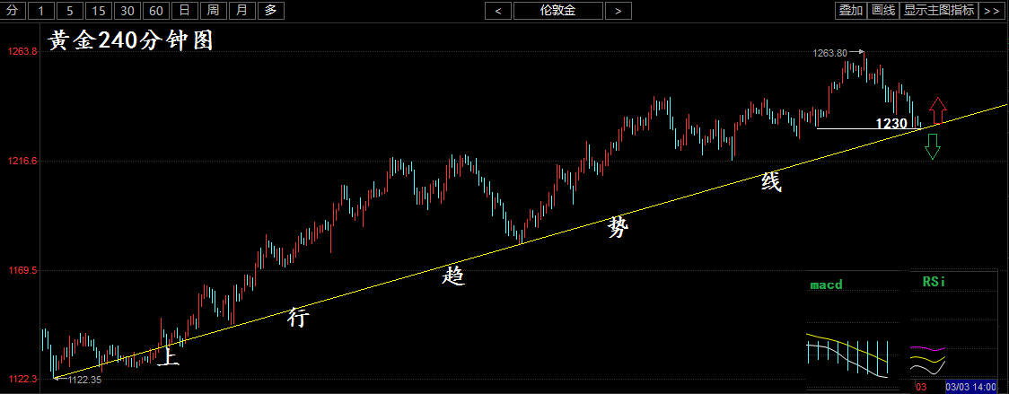 黃金方面: 今日亞盤走勢延續前期跌勢,自開盤價1234.71美元/盎司,已經震蕩下行自目前1231附近,目前市場的對于3月美聯儲加息的預期直逼百分百,日內還有兩位耶倫和美聯儲副主席費希爾的講話,日內金價跌下1230或許是大概率事件。從周線走勢來看本周黃金周線收陰概率較大。 黃金白從技術面來分析日內的行情,在240分鐘的級別上來看,目前已經跌至上漲趨勢線的一個拐點附近,指標上macd指標綠色能量柱開始縮量,相對強弱指標RSI拐頭向上,指標上來看有反彈的需求,重點關注1230一線關口 黃金操作策略: 黃金1230美元跌破建議可以順勢做空,目標下看4-5美元,如果沒有跌破建議可在1231附近做多,目標上看5-6美元; |