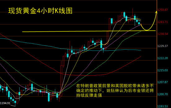 黃金方面昨日刷新高點(diǎn)1253.14后折返,昨日錄的一根陰線,黃金止步六連陽(yáng),K線運(yùn)行在布林帶中上軌之間,布林帶持平運(yùn)行,MA5/MA10金叉運(yùn)行,MA5運(yùn)行在1242位置,各周期均線呈多頭排列,向上散發(fā)運(yùn)行,附圖MACD指標(biāo)紅色能量柱縮量運(yùn)行,快慢線0軸上方交金叉運(yùn)行,指標(biāo)中性偏強(qiáng);4小時(shí)線上黃金承壓布林上軌下行,布林帶縮口運(yùn)行,MA5/MA10交死叉向下運(yùn)行,30日均線運(yùn)行在1239.5位置形成日內(nèi)回落支撐,附圖MACD指標(biāo)綠色能量柱釋放能量,快慢線在0軸上方交死叉運(yùn)行,指標(biāo)偏強(qiáng),綜合分析在市場(chǎng)重消息的刺激下,金價(jià)目前多空交織,在特朗普政策前景和英國(guó)脫歐帶來(lái)諸多不確定的推動(dòng)下,后市金銀還將持續(xù)反彈走強(qiáng)。日內(nèi)操作上姚鈺林建議投資者關(guān)注日線上5日均線的得失情況,操作上投資者需嚴(yán)格帶好止損控制風(fēng)險(xiǎn)。 3.24黃金操作建議: