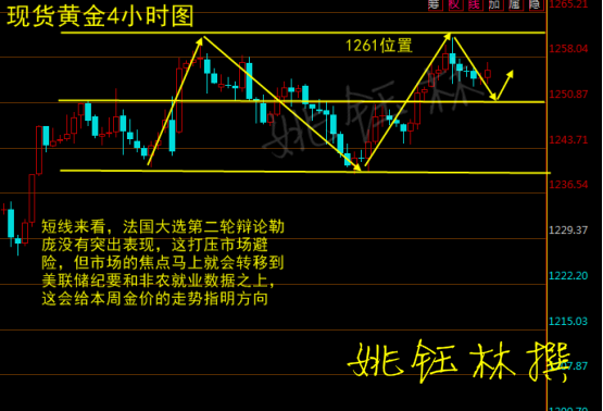 黃金方面連續(xù)3個交易日收漲,昨日刷新高點1261.14位置后漲幅縮減,日線上收取一根倒錘陽線,K線依舊運行在布林帶中上軌之間,布林帶開口運行,MA5/MA10欲沾合運行在1250附近,黃金幾次沖擊1261位置都未能有效站穩(wěn)此位置,證明前期高點的壓力依舊較強,姚鈺林認(rèn)為后市黃金將會繼續(xù)試探此位置,附圖MACD指標(biāo)紅色能量柱縮量運行,快慢線運行在0軸上方走勢,指標(biāo)呈中性;4小時線上黃金刷新高點后承壓下行,K線運行在布林帶中上軌之間,布林帶開口運行,MA5/MA10沾合交叉運行在1255一線,MA20運行在1250.87位置形成下方支撐,附圖MACD指標(biāo)紅色能量柱縮量運行,快慢線運行在0軸上方,指標(biāo)呈中性;綜合分析姚鈺林認(rèn)為美聯(lián)儲在3月升息之后的釋然情緒、特朗普施政不及預(yù)期的憂慮情緒支撐金價上揚。短線來看,法國大選第二輪辯論勒龐沒有突出表現(xiàn),這打壓市場避險,但市場的焦點馬上就會轉(zhuǎn)移到美聯(lián)儲紀(jì)要和非農(nóng)就業(yè)數(shù)據(jù)之上,這會給本周金價的走勢指明方向。 4.5黃金操作建議: